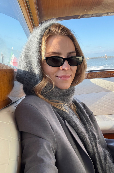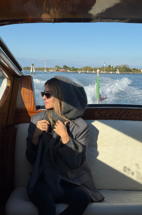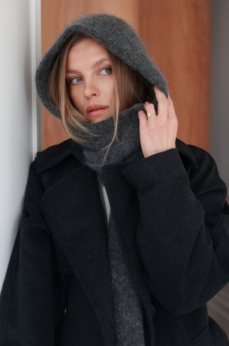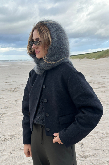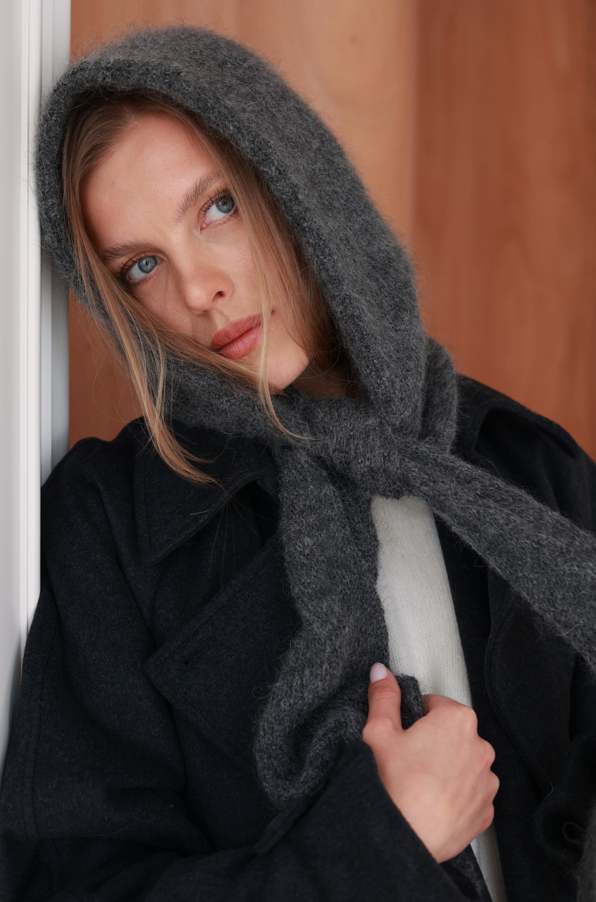 A knitted hood with a drawstring, made of 65% super kid mohair yarn. Soft and voluminous, with a characteristic silky hair that perfectly reflects the light. Its versatile design allows it to be styled in multiple ways.
