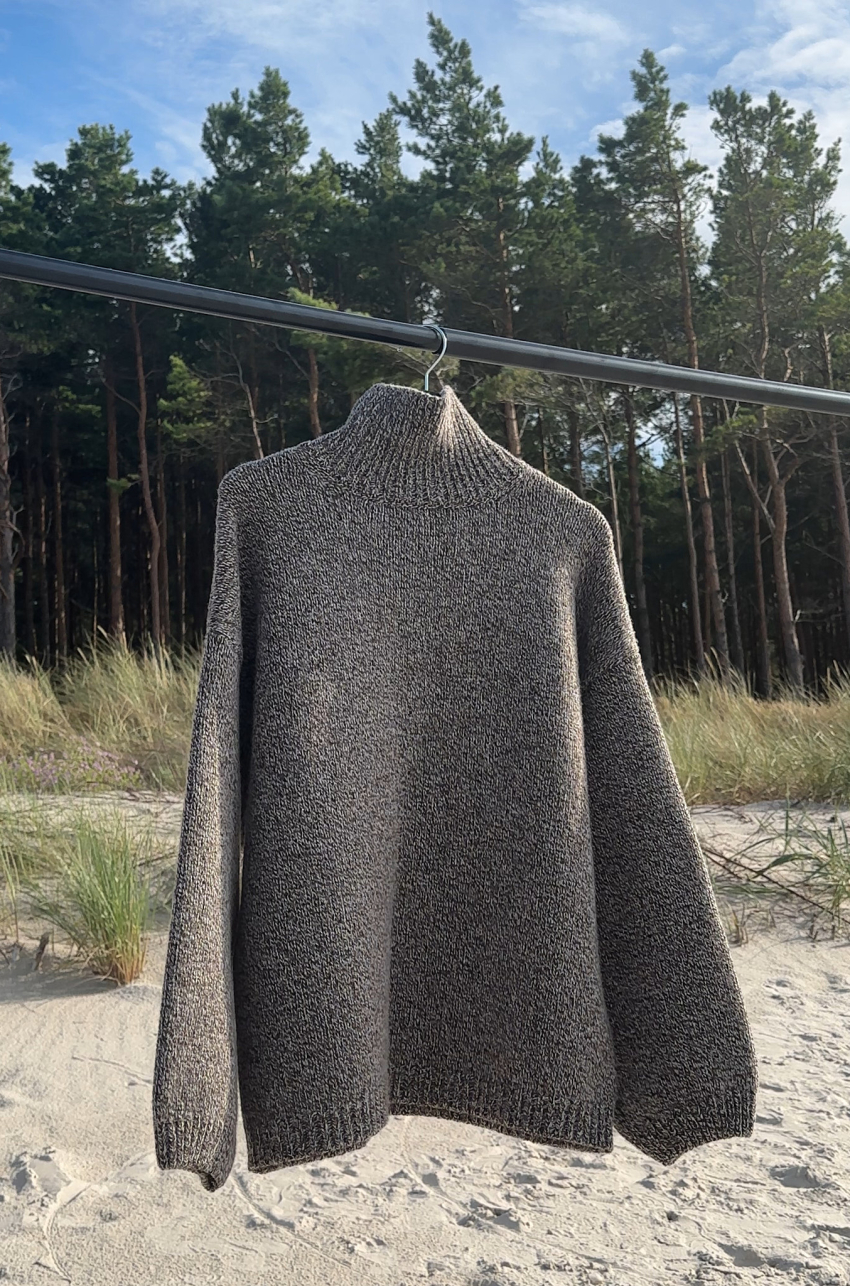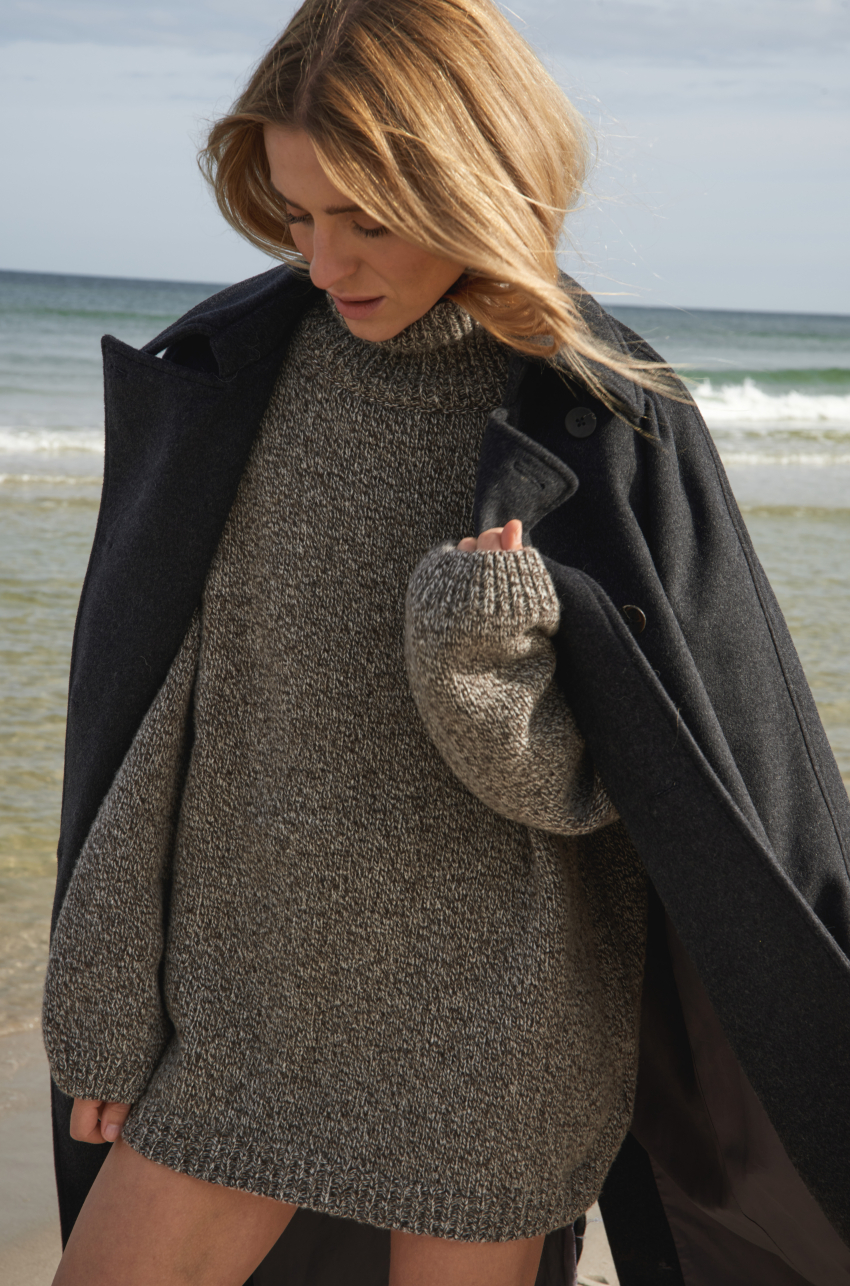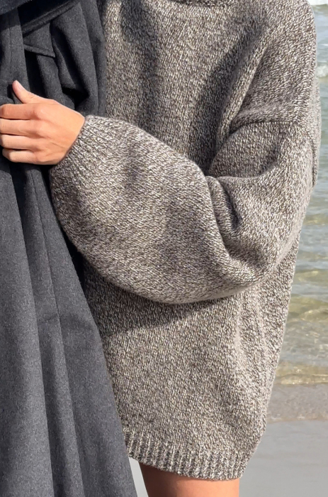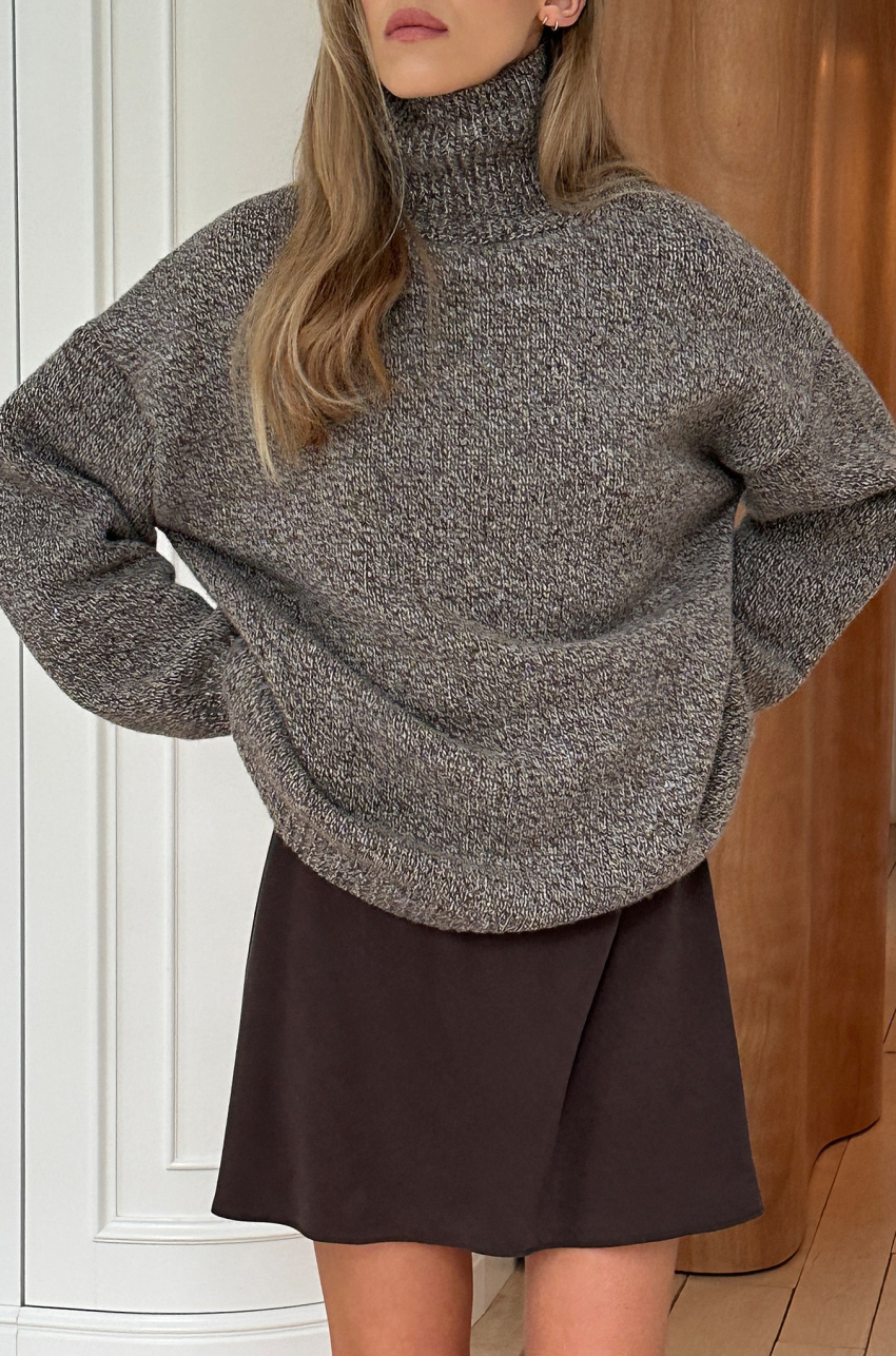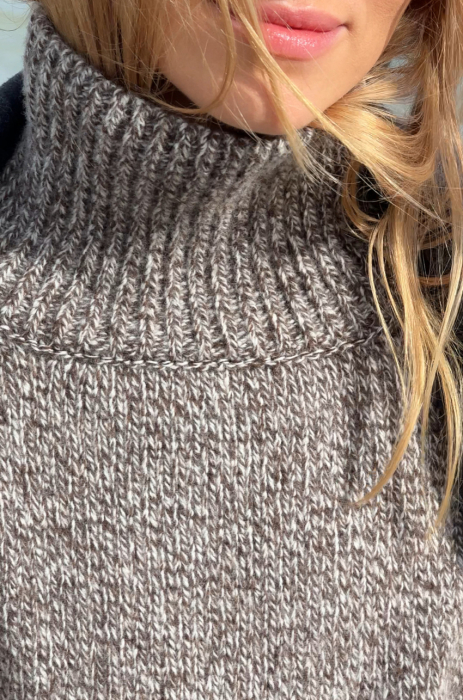 Mulinowy golf w brązowym kolorze. To pierwszy taki produkt w marce MLE – melanżowe przędze produkuje się trudniej, ale nosi częściej. Ich niezobowiązujący, a jednocześnie wyrazisty charakter sprawia, że melanż stał się znakiem rozpoznawczym naszej tegorocznej kolekcji. Sweter ma długi prosty rękaw, dobrze wymierzony golf, który nie przylega do szyi, a jednocześnie nie opada w trakcie noszenia.