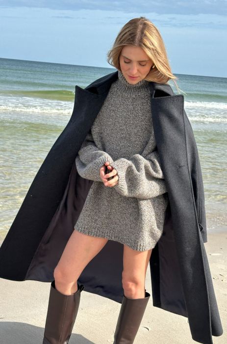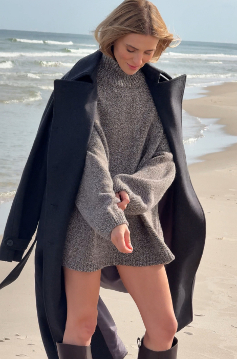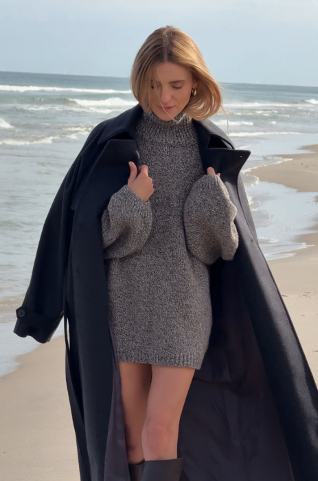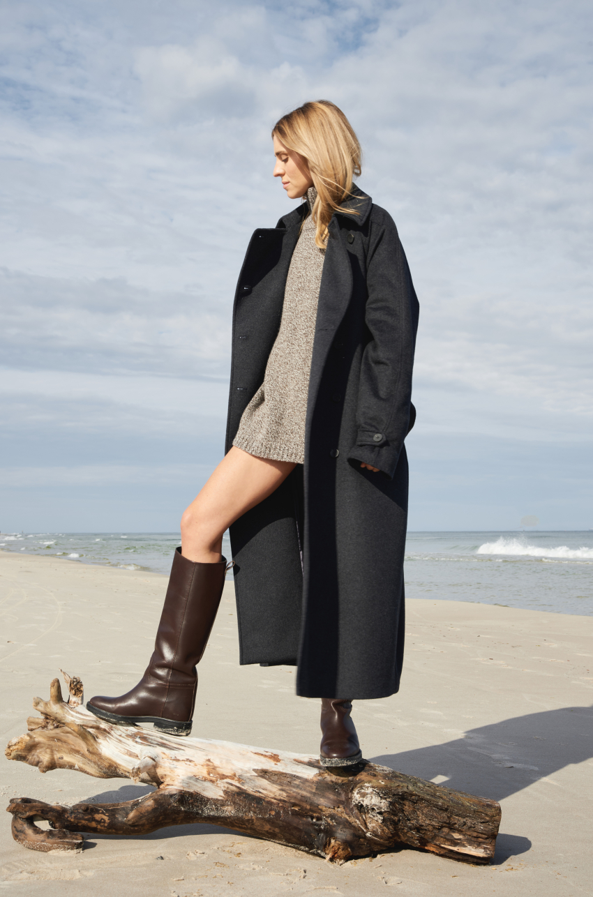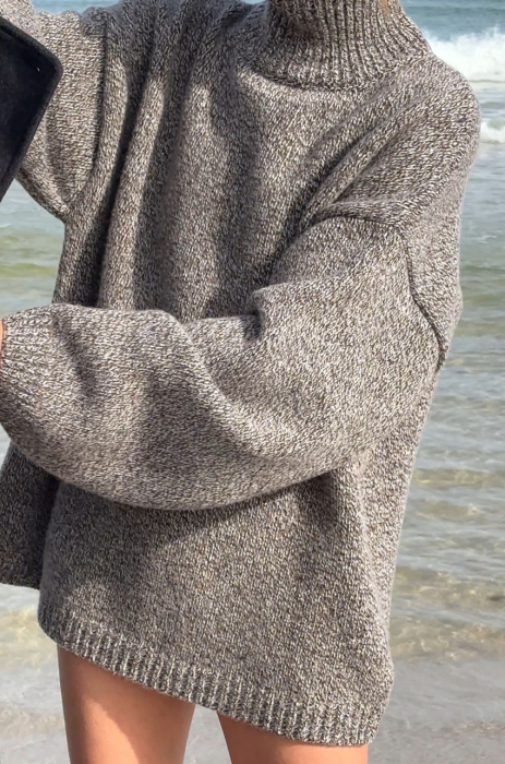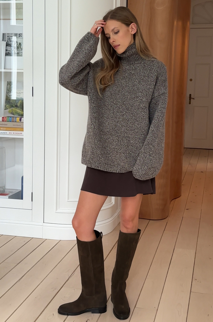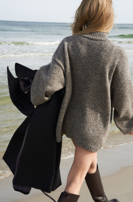 Mulinowy golf w brązowym kolorze. To pierwszy taki produkt w marce MLE – melanżowe przędze produkuje się trudniej, ale nosi częściej. Ich niezobowiązujący, a jednocześnie wyrazisty charakter sprawia, że melanż stał się znakiem rozpoznawczym naszej tegorocznej kolekcji. Sweter ma długi prosty rękaw, dobrze wymierzony golf, który nie przylega do szyi, a jednocześnie nie opada w trakcie noszenia.