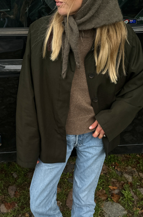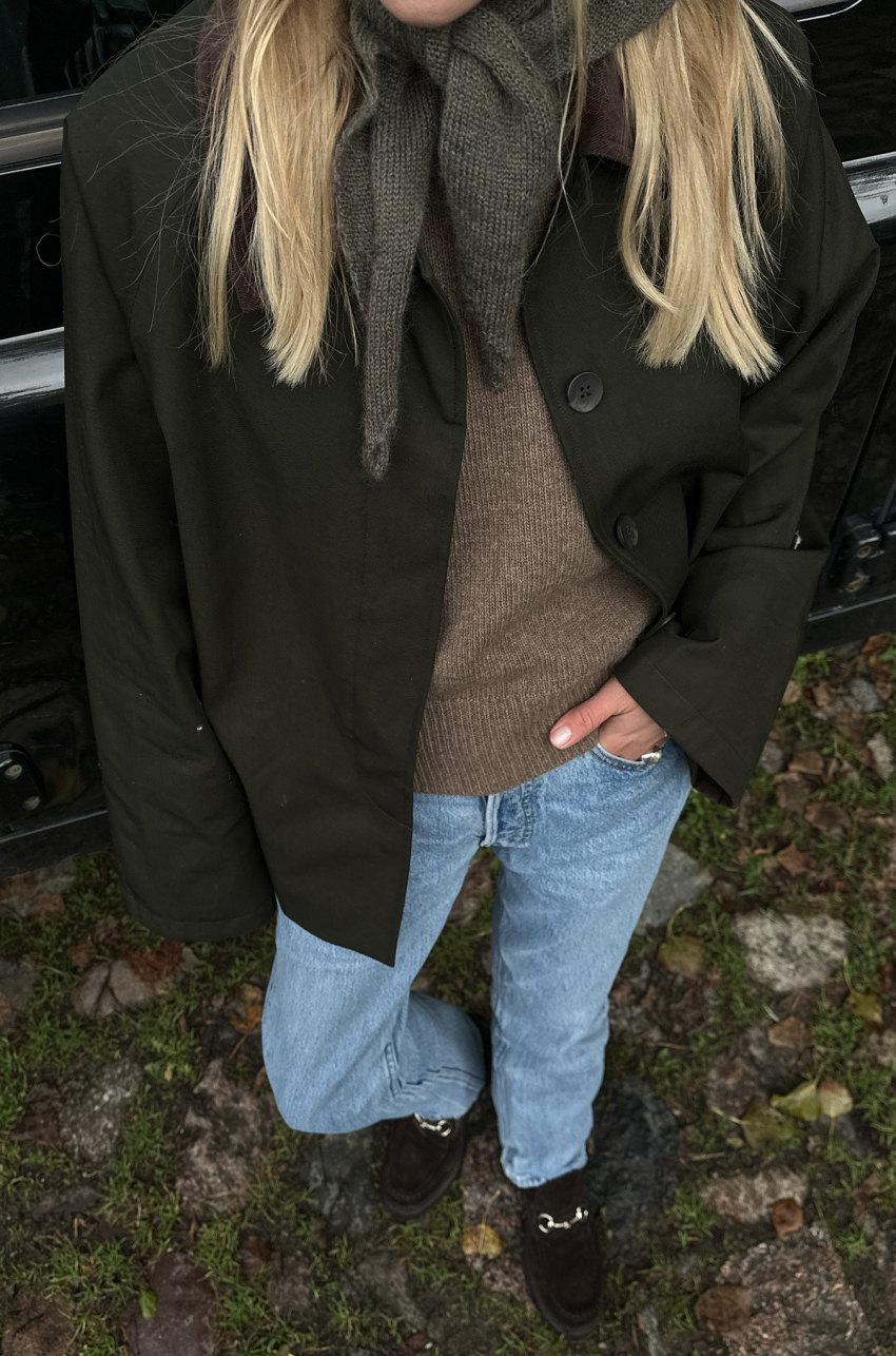 Jesienna kurtka o długości za biodra. Zapinana na guziki ukryte w listwie. Kurtka posiada sztruksowy kołnierz, który dzięki odpowiedniemu skrojeniu, zawsze dobrze się układa. Tkanina, z której został uszyty, jest pokryta warstwą hydrofobową co sprawia, że ma właściwości wodoodporne.