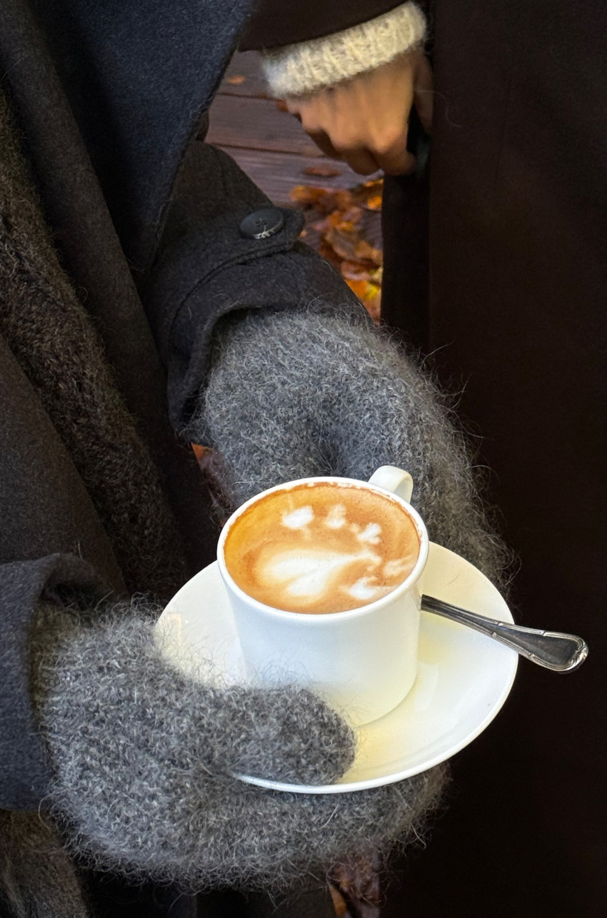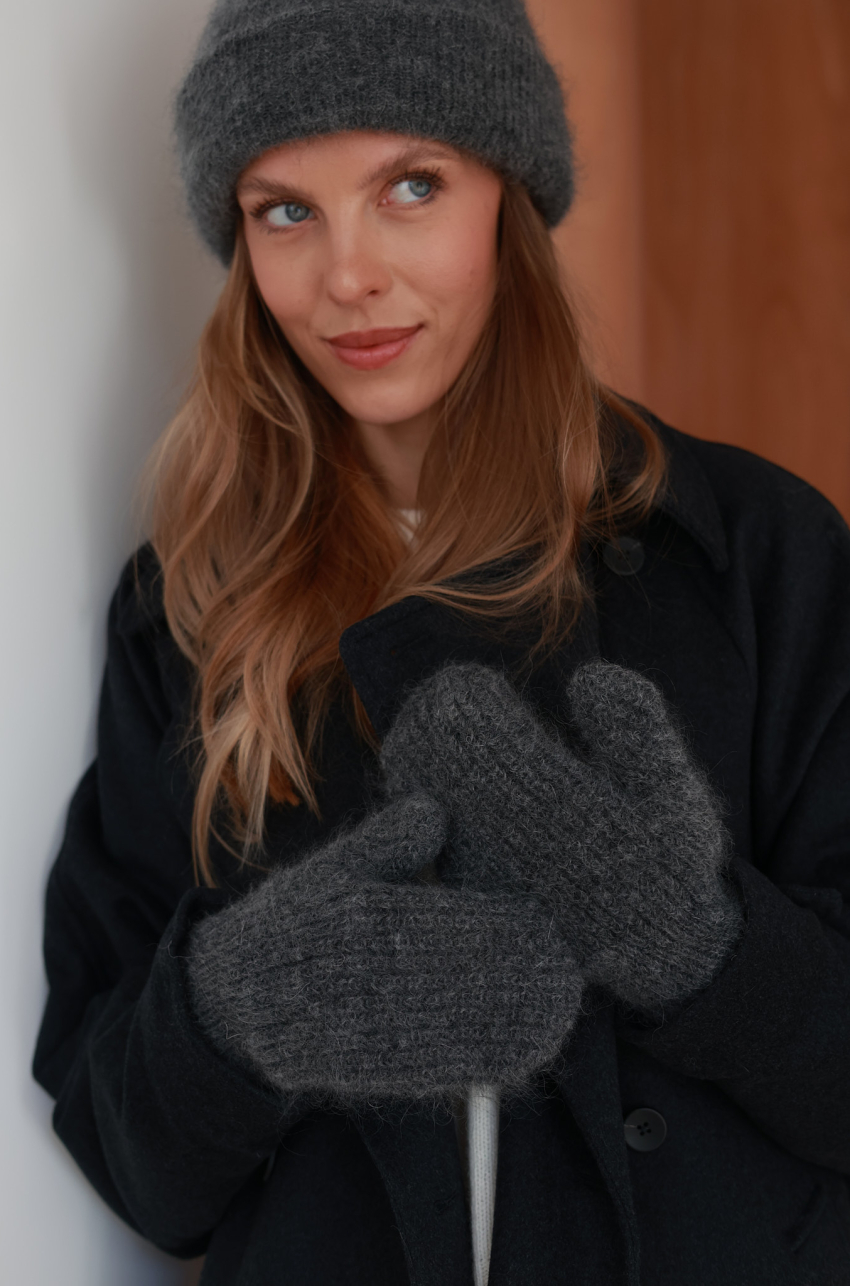 Rękawiczki z jednym palcem, wykonane w 65% z przędzy super kid mohair. Miękkie i puszyste, ponieważ przędza super kid mohair ma widoczny lśniący włos, który sprawia, że wykonane z niej dodatki i ubrania pięknie odbijają światło.