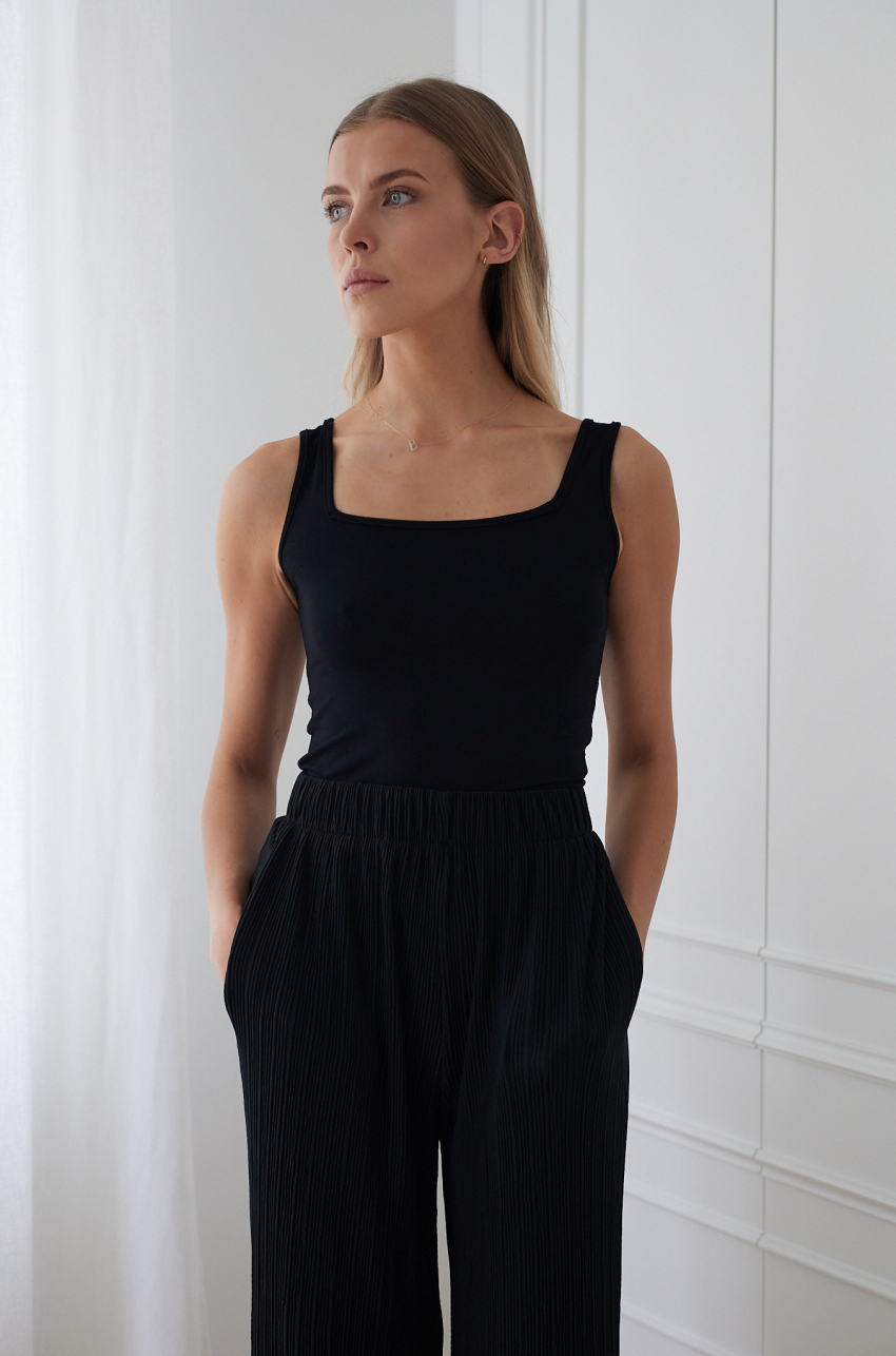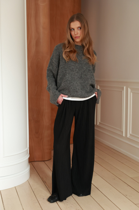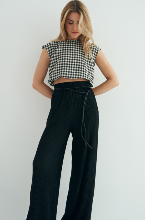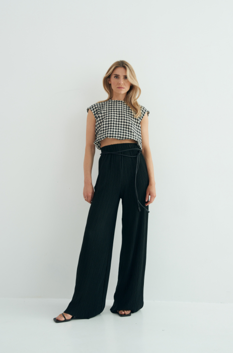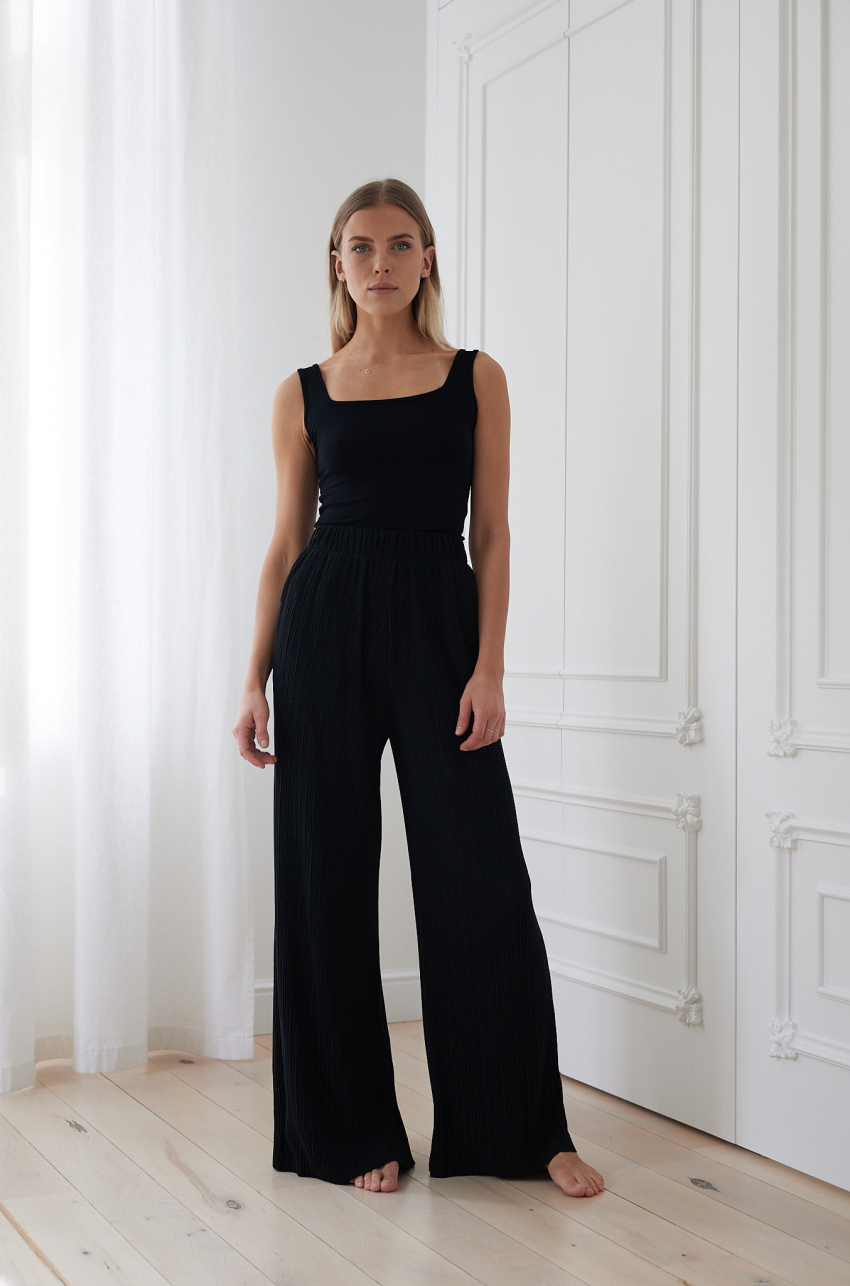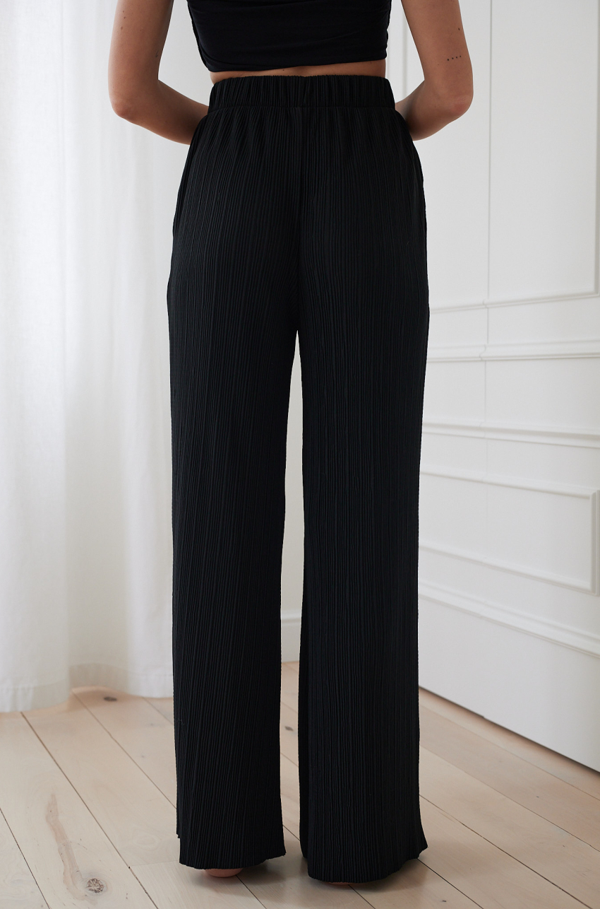 Czarne, lekkie, plisowane spodnie z szeroką nogawką. Wykonane z certyfikowanego poliestru z recyklingu, który zapewnia trwałość plisów. Elastyczna gumka w pasie, luźny fason i delikatna w dotyku tkanina zapewniają pełen komfort użytkowania. Wyższy stan optycznie wydłuża sylwetkę. Ten ponadczasowy model jest idealną bazą do wielu wiosennych stylizacji.