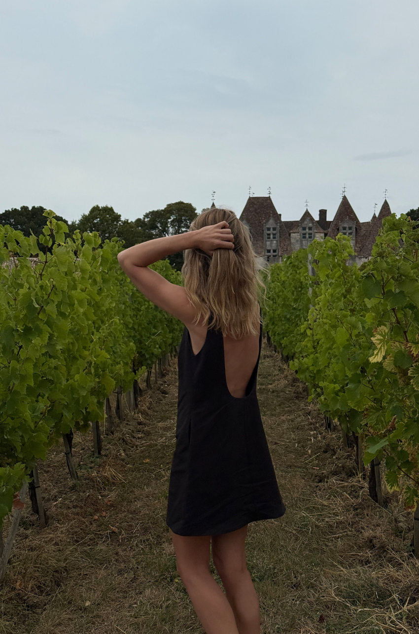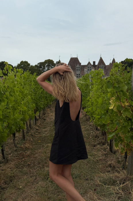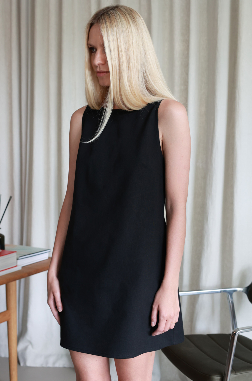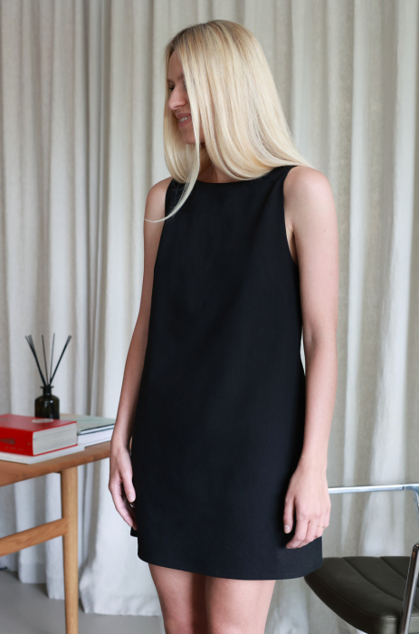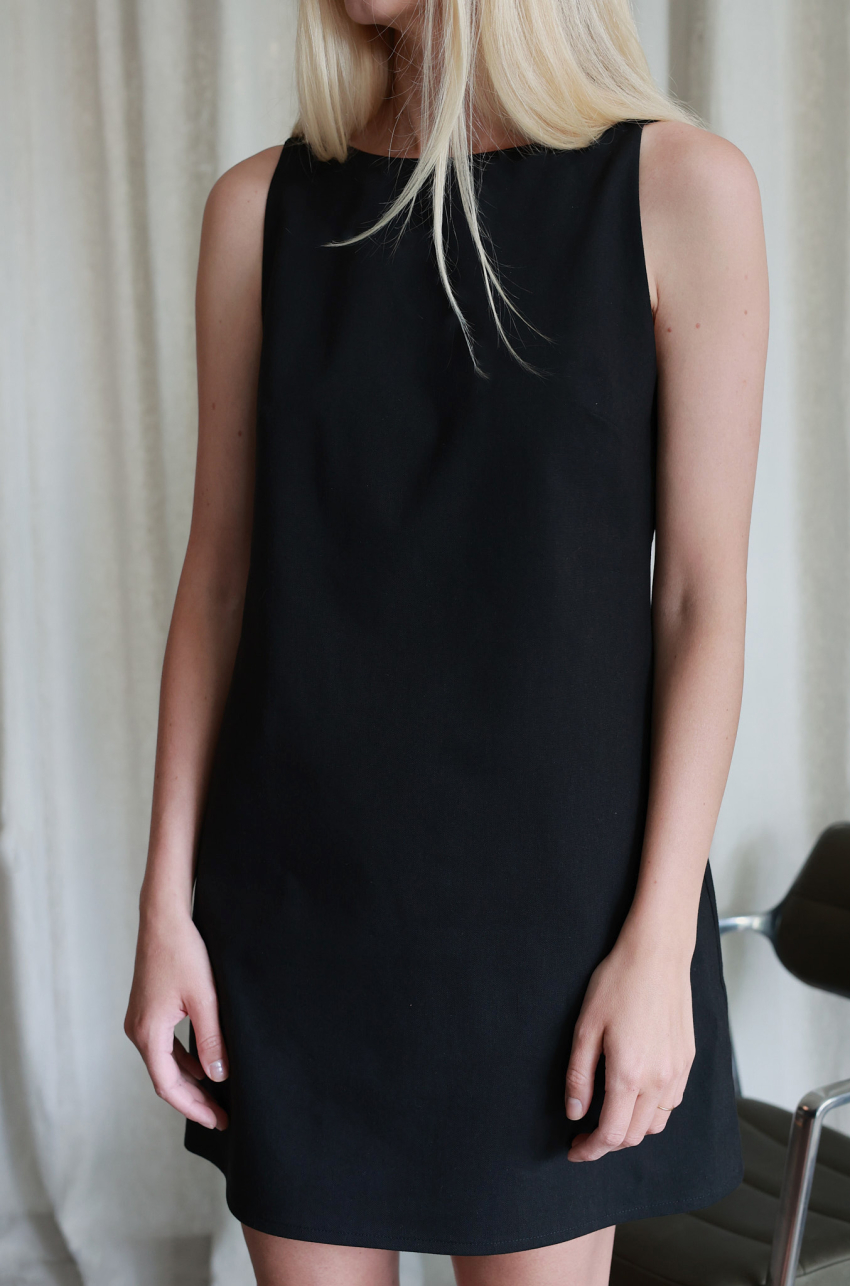 Sukienka mini uszyta z naturalnej mieszanki bawełny. Prosta linia i minimalistyczny krój kontrastują z głębokim i wyrazistym wycięciem na plecach. Tkanina o sztywniejszej strukturze sprawia, że fason zachowuje formę, a jednocześnie pięknie układa się na sylwetce.