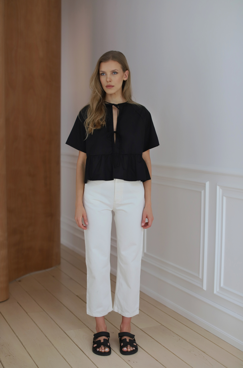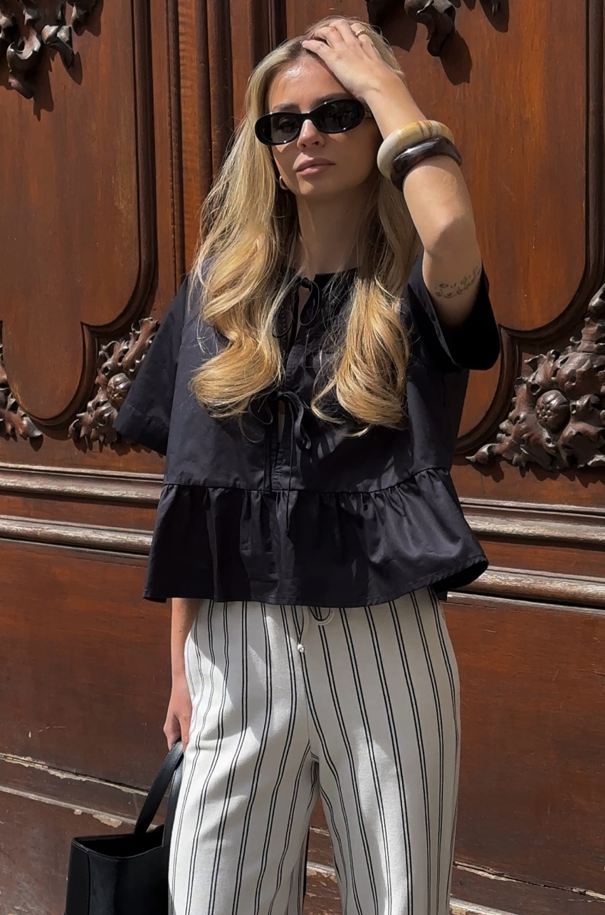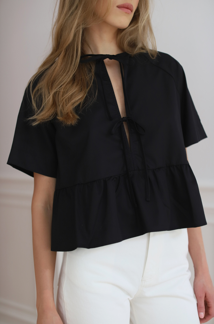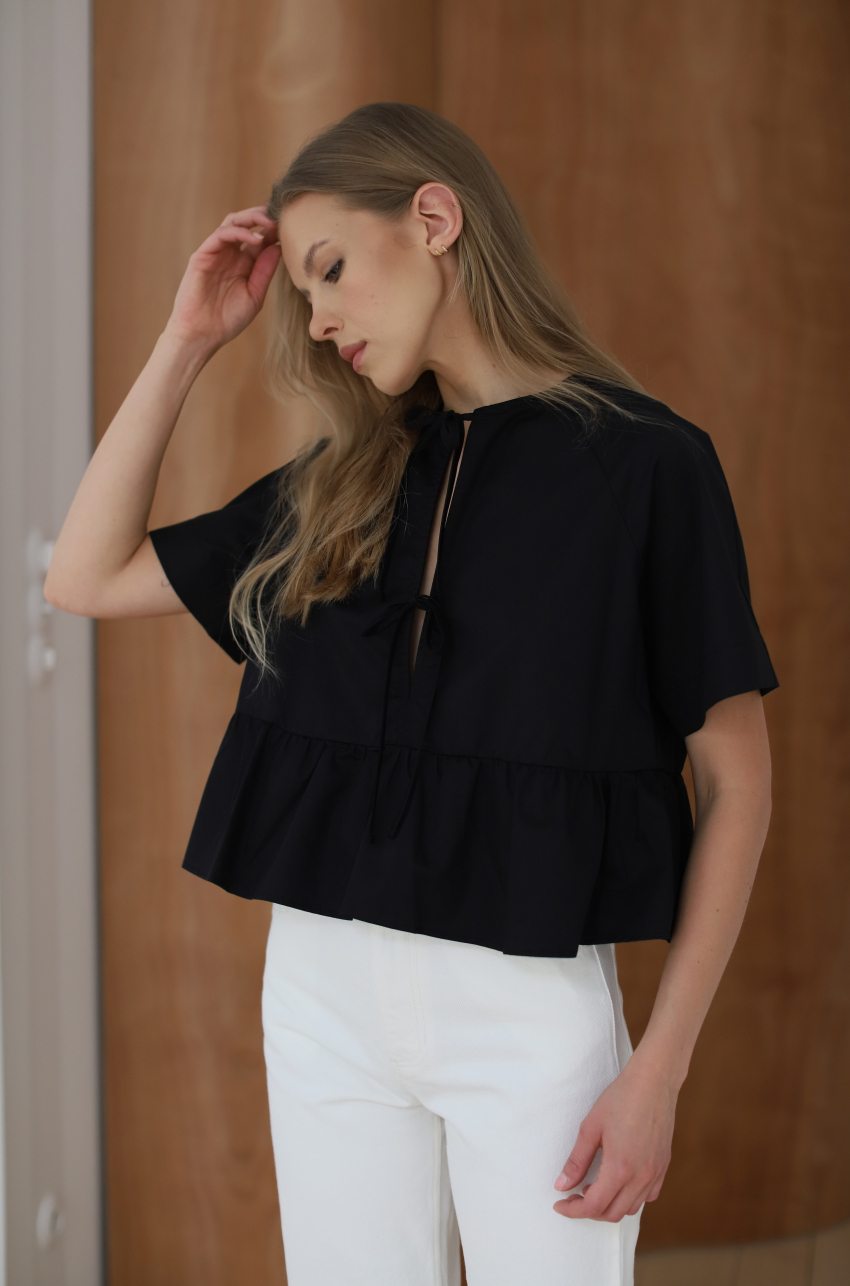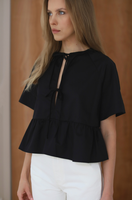 Czarna bluzka z krótkim rękawem, wykonana z bawełny. Posiada pudełkowy krój, krótki rękaw i romantyczne wiązania na kokardki. Na dole falowana baskinka, która nadaje koszuli lekkości. Odpowiednia długość umożliwia noszenie jej zarówno z długimi spodniami, jak i z szortami i spódnicą.