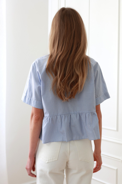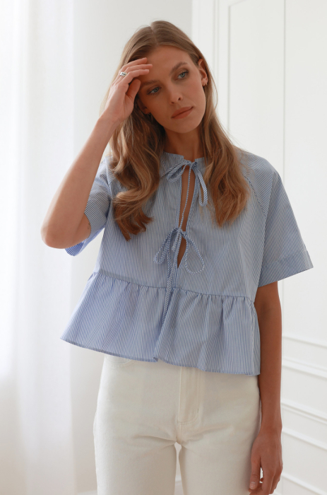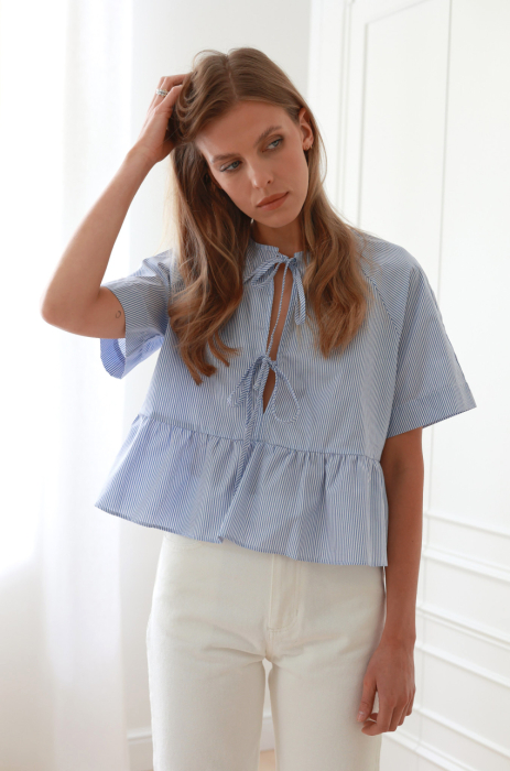 Bluzka w biało- błękitne paski z krótkim rękawem, wykonana z bawełny. Posiada pudełkowy krój, krótki rękaw i romantyczne wiązania na kokardki. Na dole falowana baskinka, która nadaje koszuli lekkości. Odpowiednia długość umożliwia noszenie jej zarówno z długimi spodniami, jak i z szortami i spódnicą.