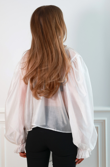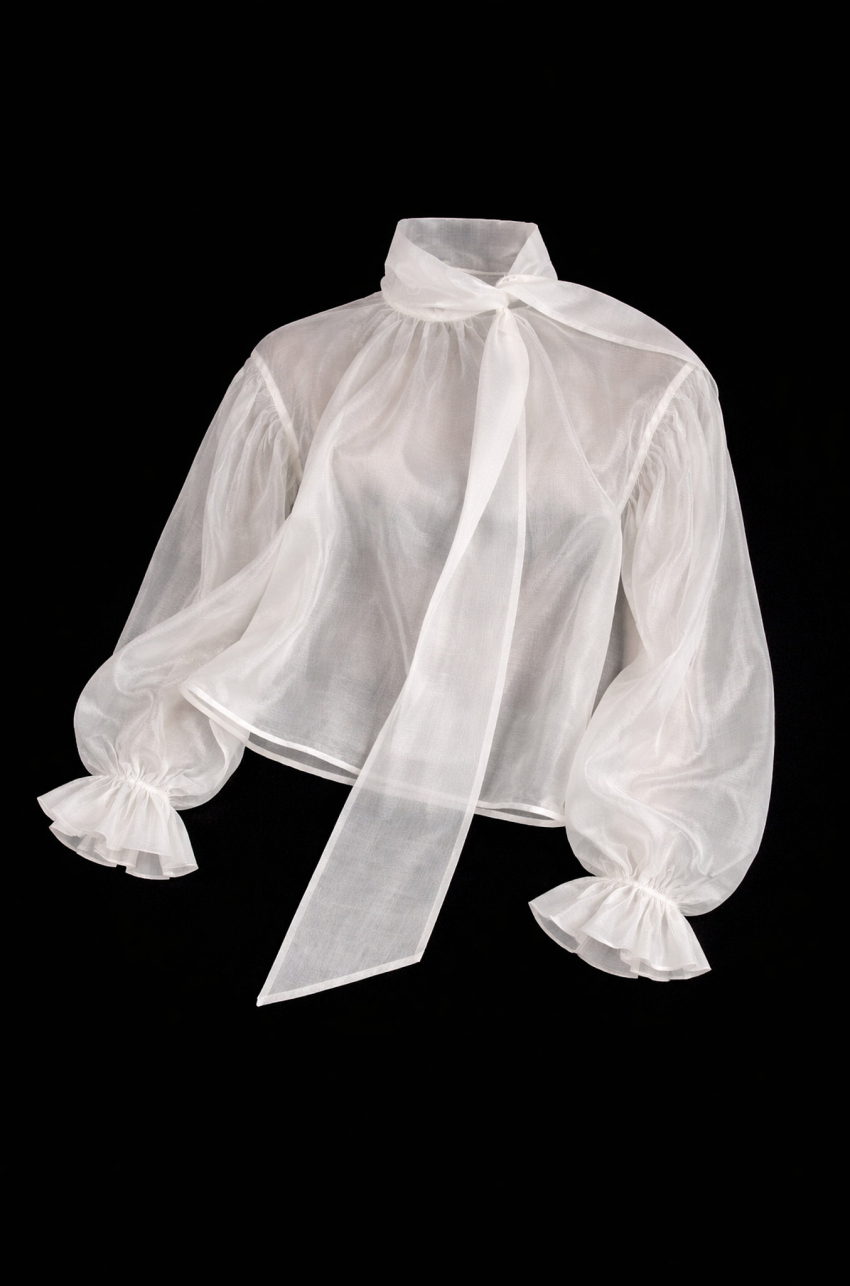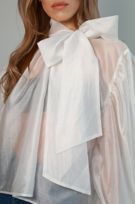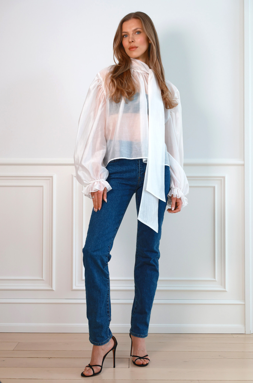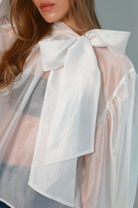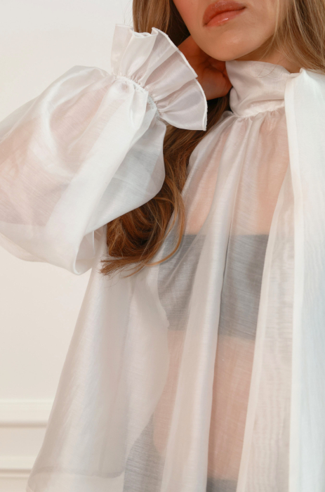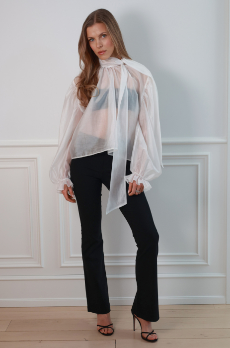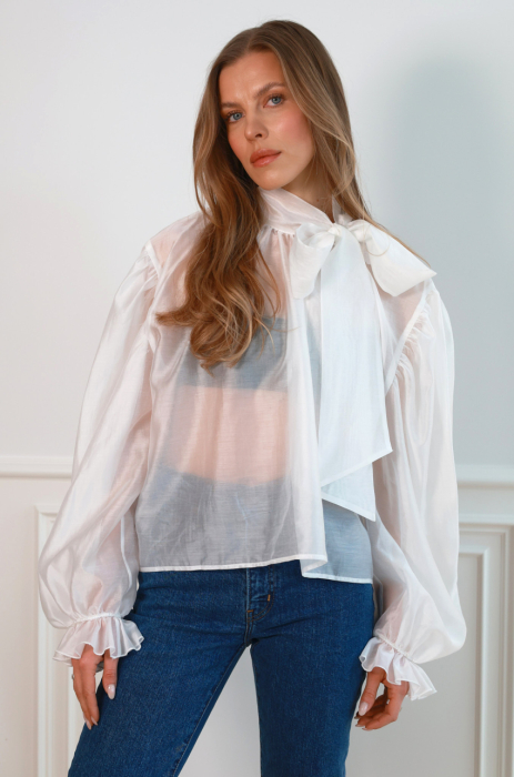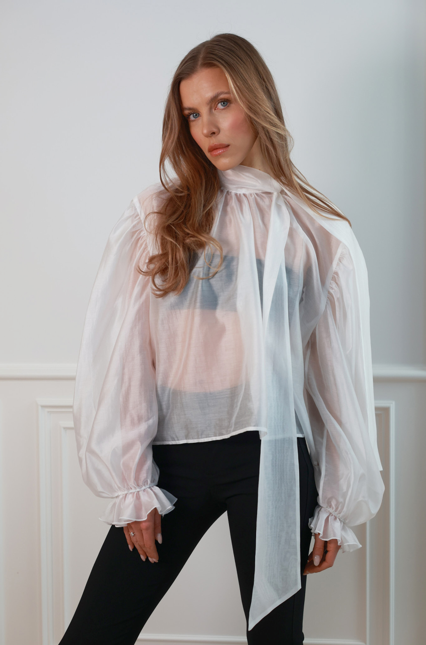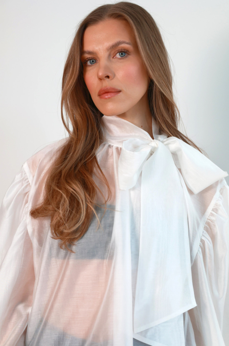 Bluzka o luźnym, swobodnym kroju wykonana ze szlachetnej mieszanki lyocellu. Lekka, półtransparentna tkanina miękko układa się na sylwetce i zapewnia komfort noszenia przez cały dzień. Model z wiązaniem przy szyi oraz delikatnym marszczeniem przy dekolcie. Długie, bufiaste rękawy zakończone elastycznym mankietem nadają całości subtelnej objętości.