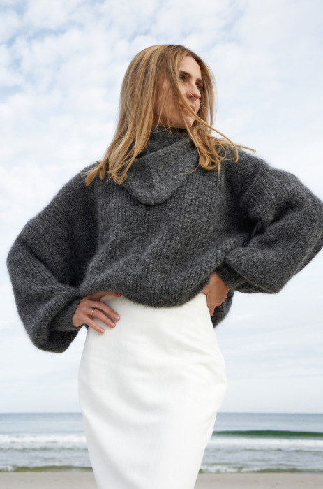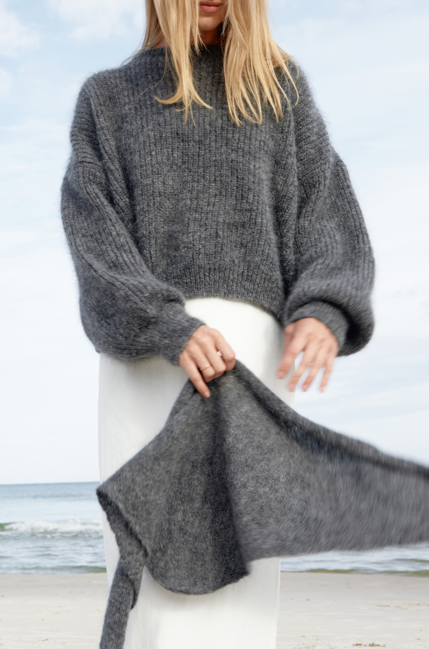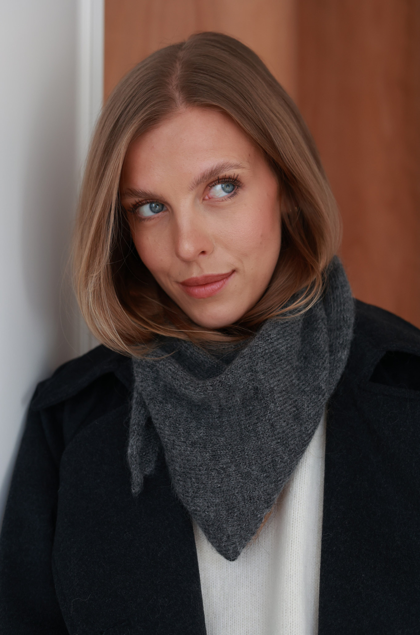 Trójkątna chusta dzianinowa wykonana w 65% z przędzy super kid mohair. Może służyć jako zawiązywana pod brodą chusta na głowę lub jako alternatywa dla szalika. Miękka i puszysta, ponieważ przędza super kid mohair ma widoczny lśniący włos, który sprawia, że wykonane z niej dodatki i ubrania pięknie odbijają światło.