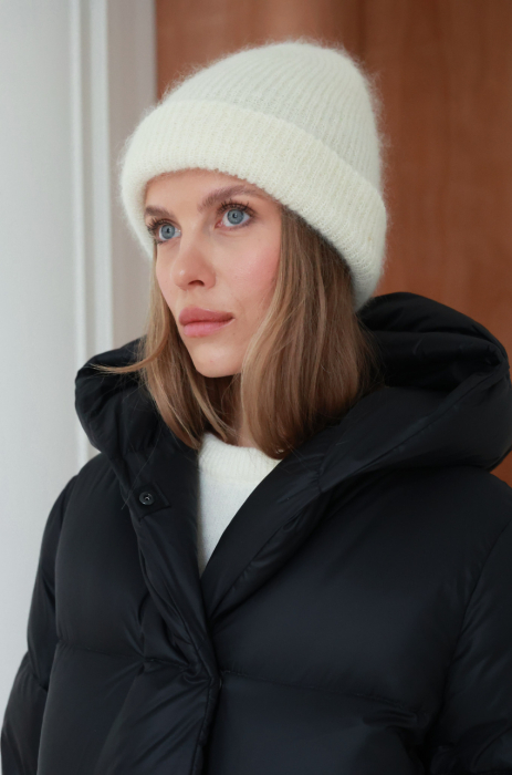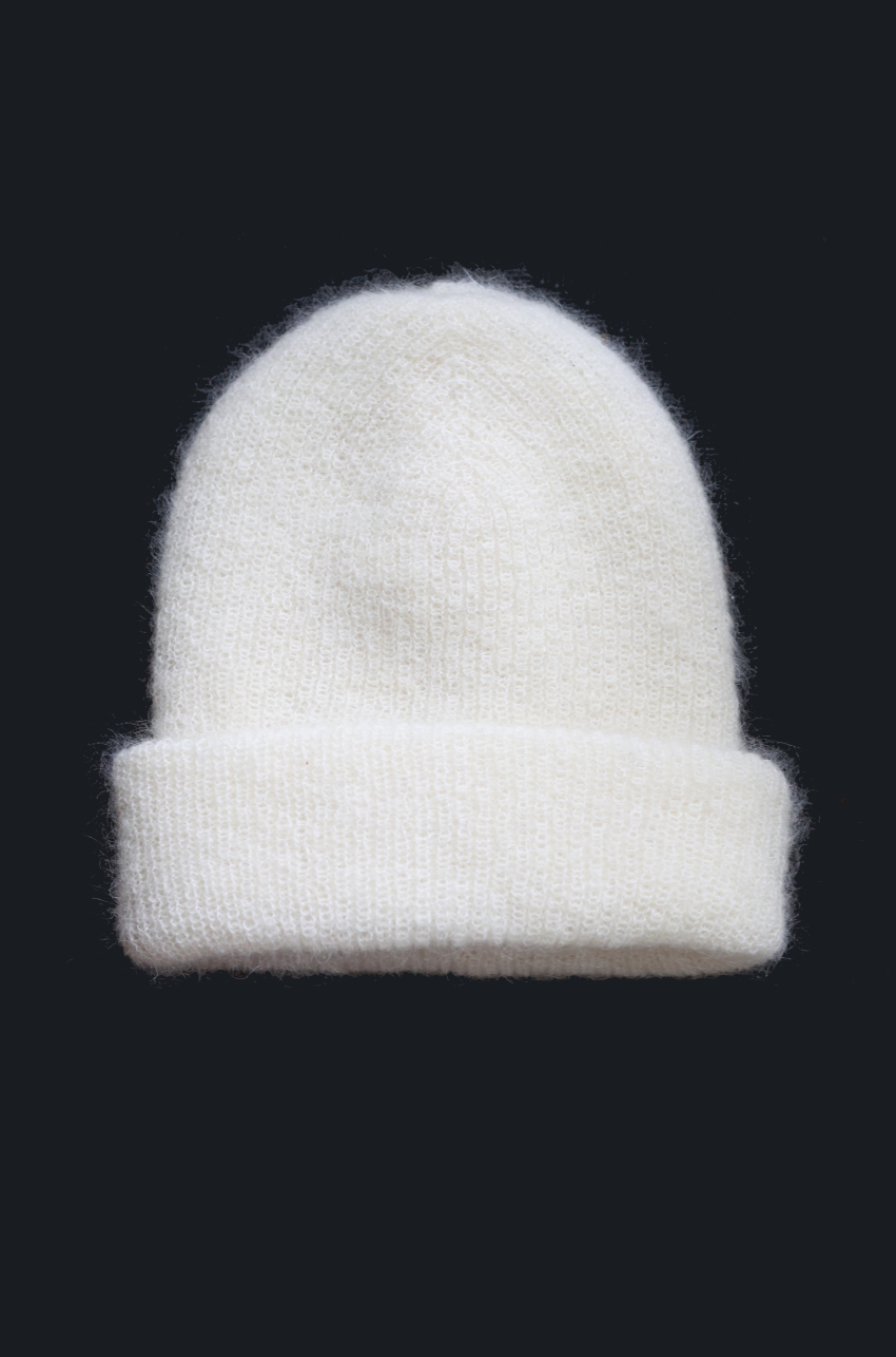 Czapka dzianinowa wykonana w 65% z przędzy super kid mohair. Miękka i puszysta, ponieważ przędza super kid mohair ma widoczny lśniący włos, który sprawia, że wykonane z niej dodatki i ubrania pięknie odbijają światło.