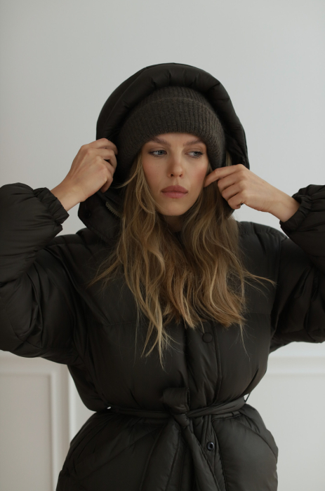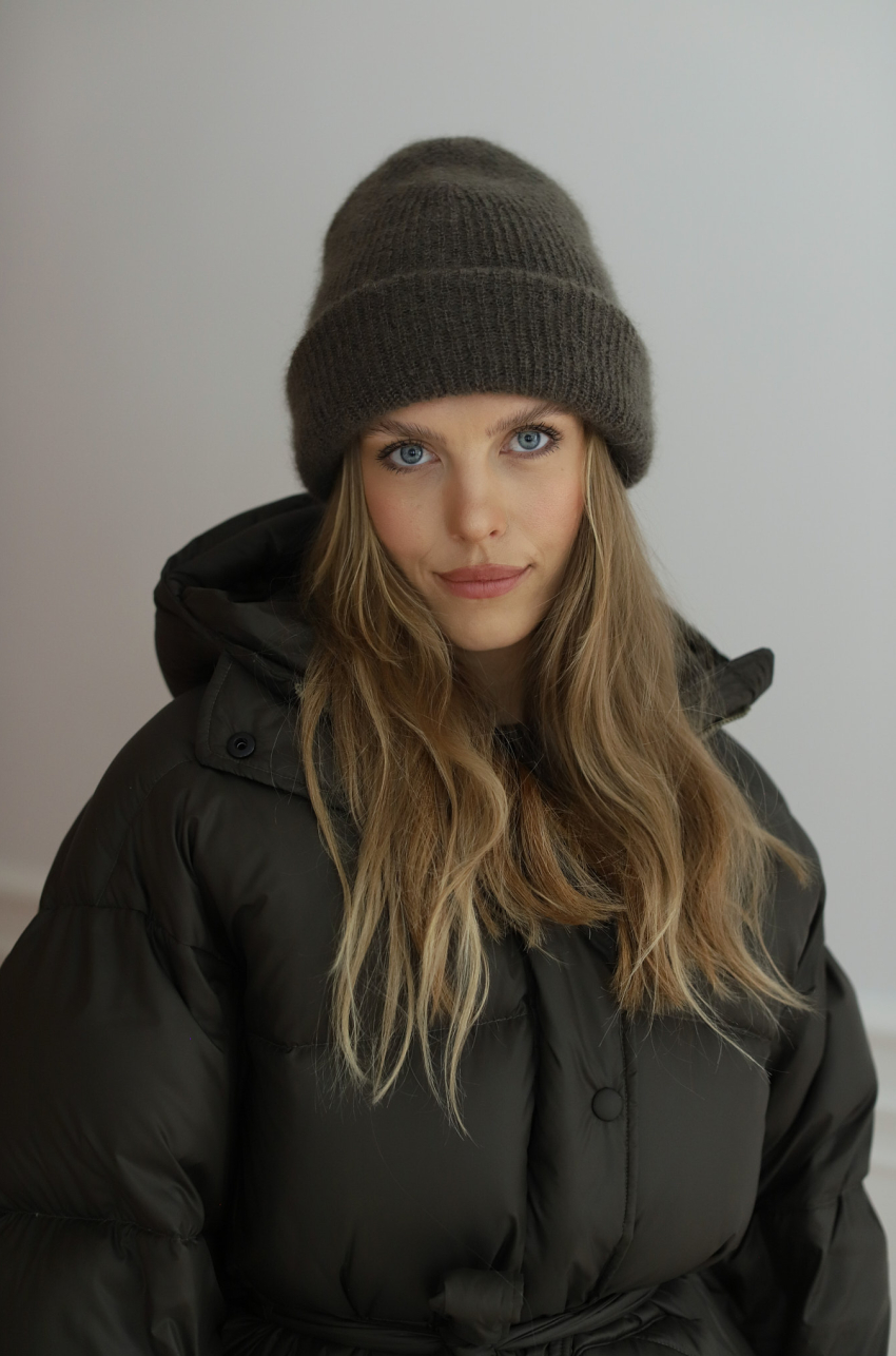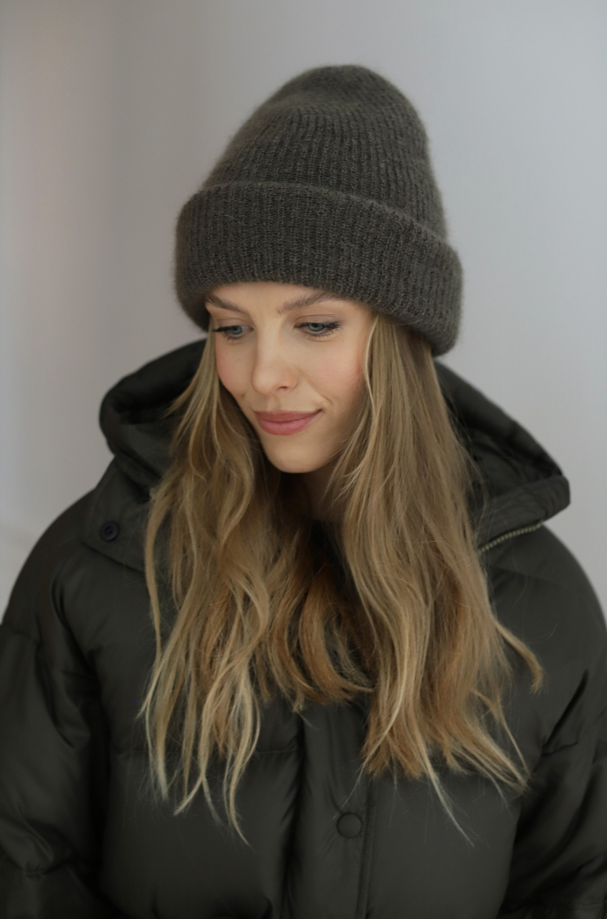 Czapka dzianinowa wykonana w 65% z przędzy super kid mohair. Miękka i puszysta, ponieważ przędza super kid mohair ma widoczny lśniący włos, który sprawia, że wykonane z niej dodatki i ubrania pięknie odbijają światło.