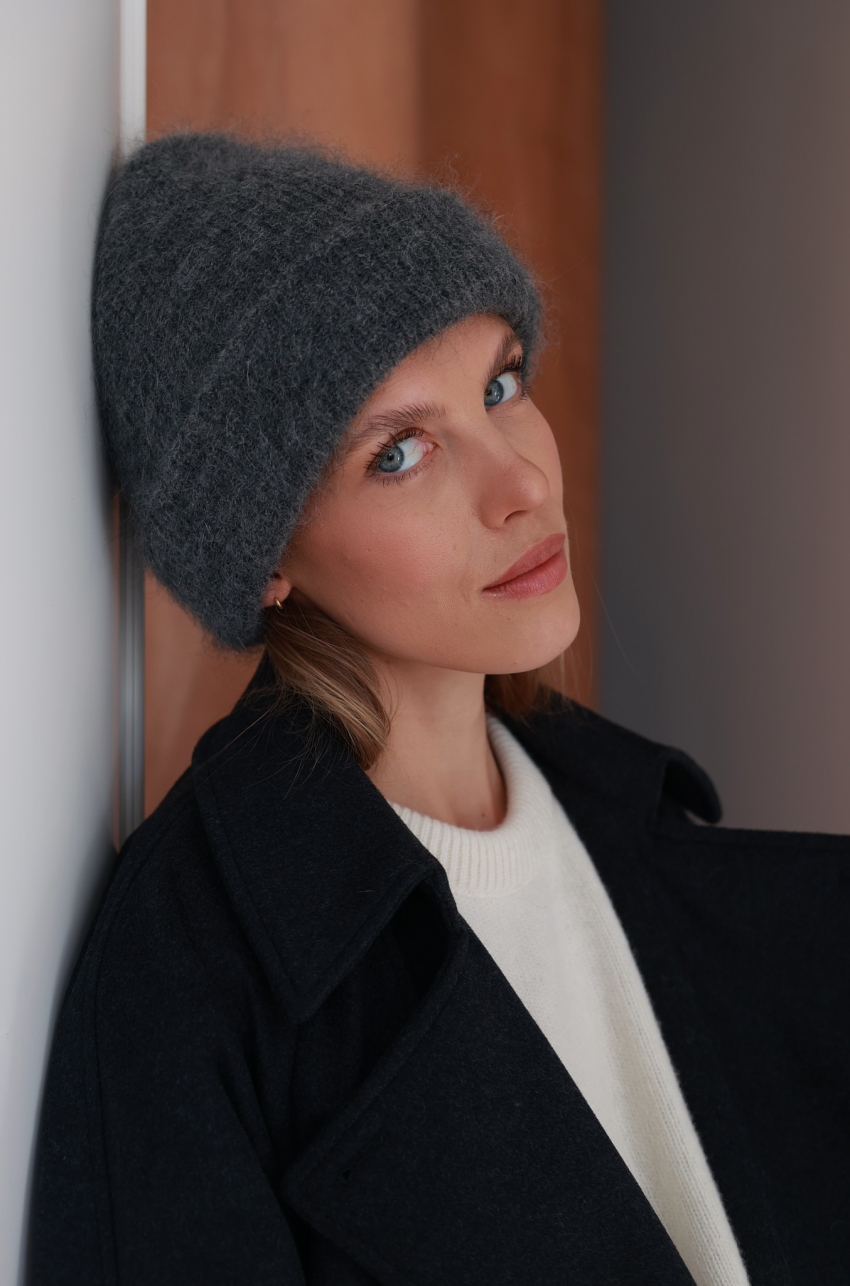 Czapka dzianinowa wykonana w 65% z przędzy super kid mohair. Miękka i puszysta, ponieważ przędza super kid mohair ma widoczny lśniący włos, który sprawia, że wykonane z niej dodatki i ubrania pięknie odbijają światło.