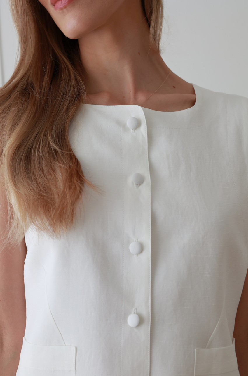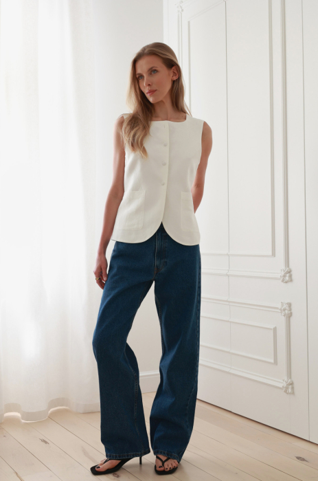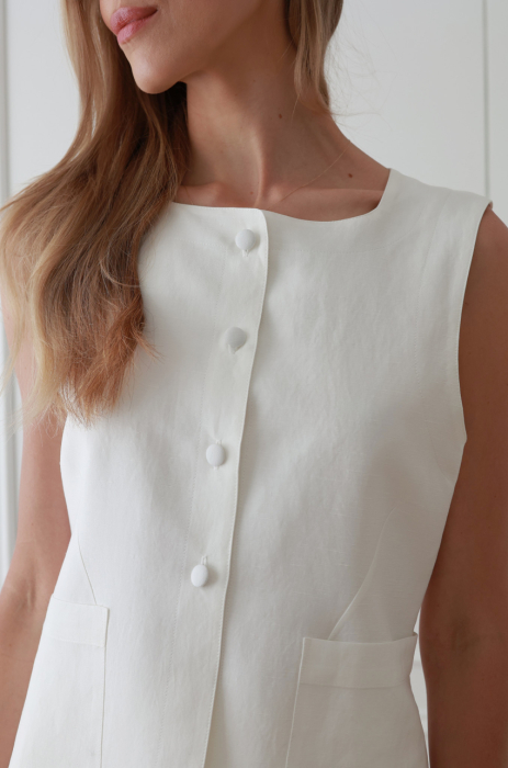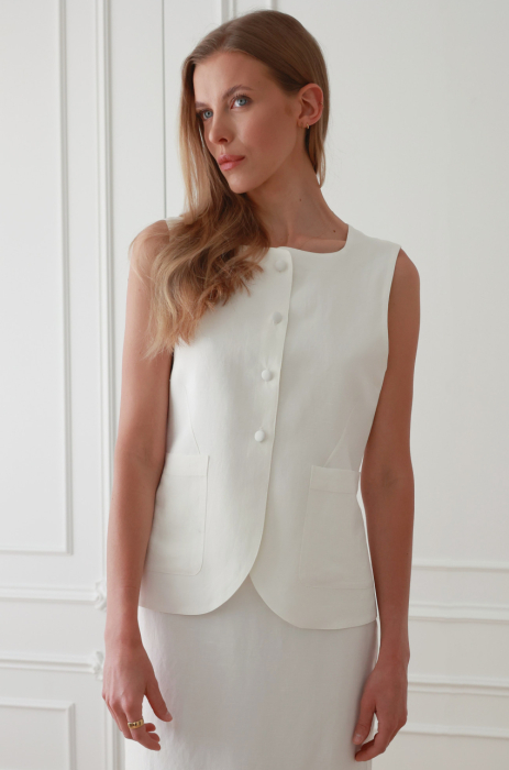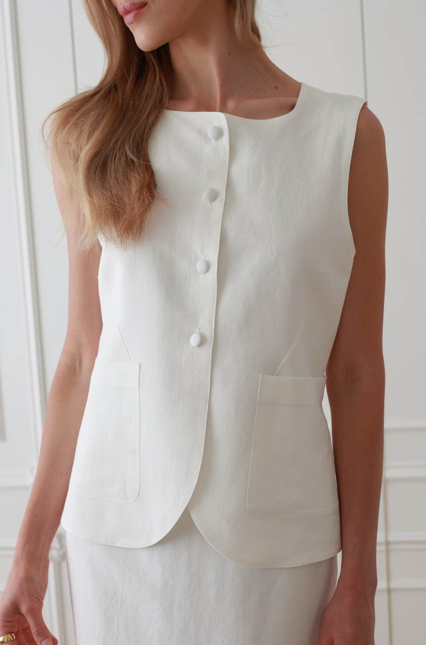Podkreślająca figurę długa kamizelka z przewiewnej mieszanki rayonu i lnu. Zabudowany, prosty dekolt, zapięcie na guziki powlekane tkaniną zasadniczą, z przodu naszyte kieszenie. Zaokrąglony dół nadaje jej eleganckiego charakteru. Noś ją ze spódnicą Lousa  tworząc elegancki set.