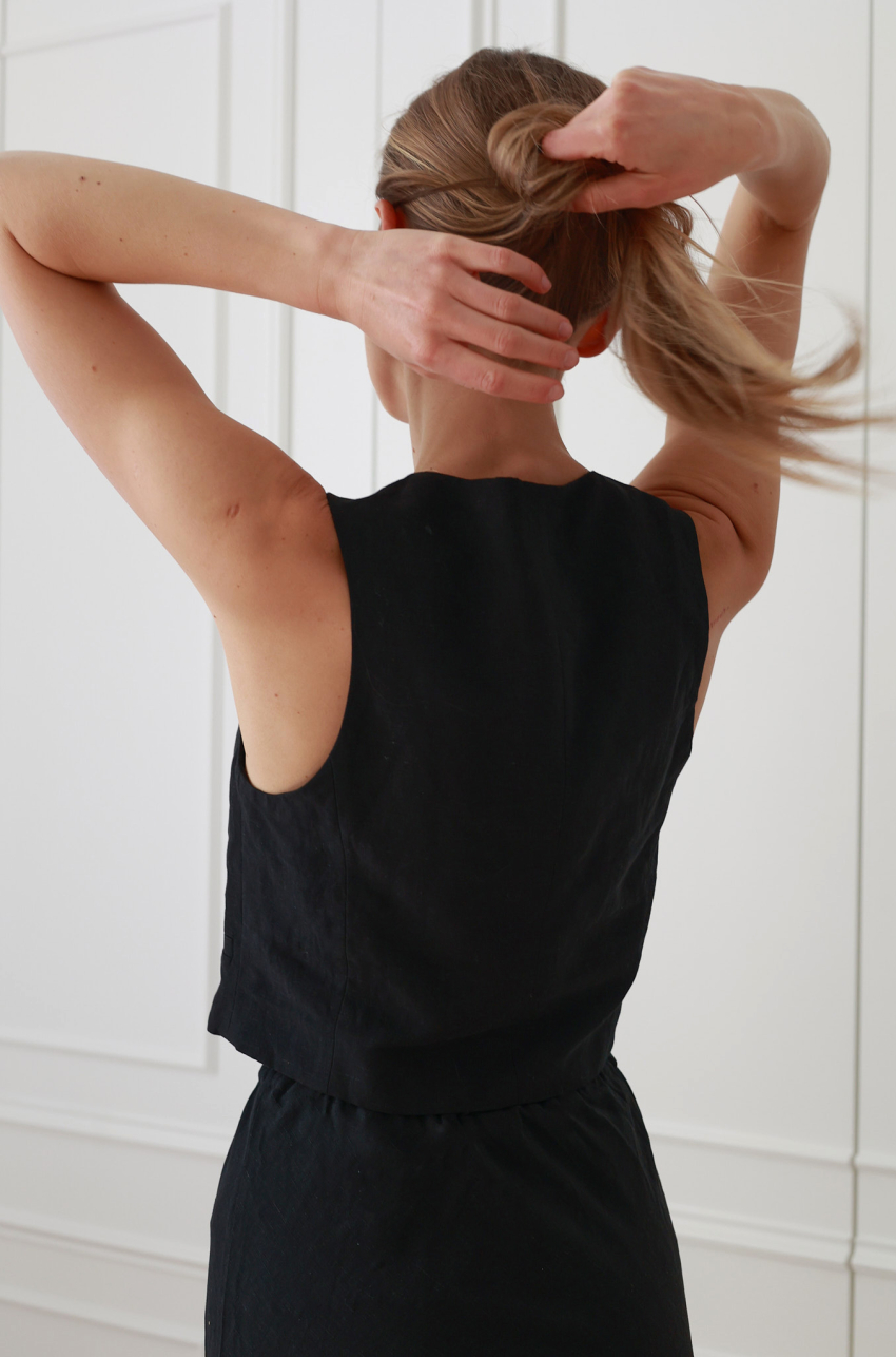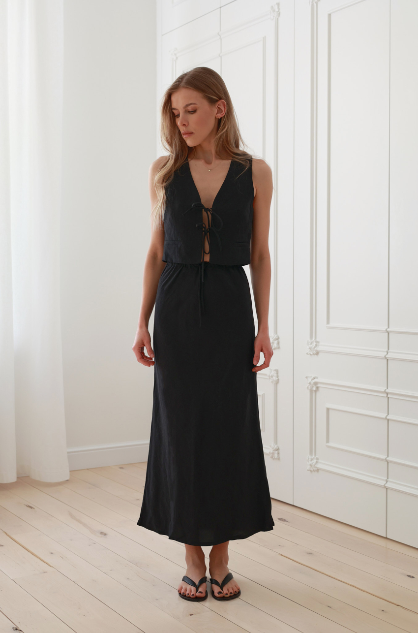 Kamizelka z mieszanki lnu o nowoczesnym kroju z dekoltem V. Wiązania na kokardki nawiązują do najnowszych trendów. W połączeniu ze spódnicą Meda z tego samego materiału, sprawdzi się zarówno w bardziej oficjalnych sytuacjach, jak i tych zupełnie nieformalnych. Swobodny, dopracowany krój pozwala nosić ją zarówno z delikatnym biustonoszem, jak na gołe ciało.