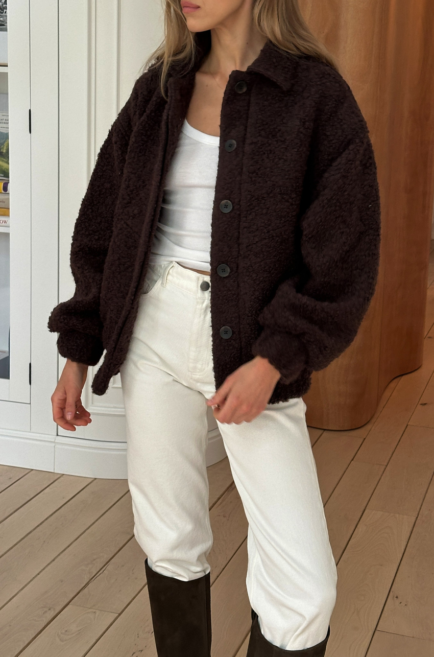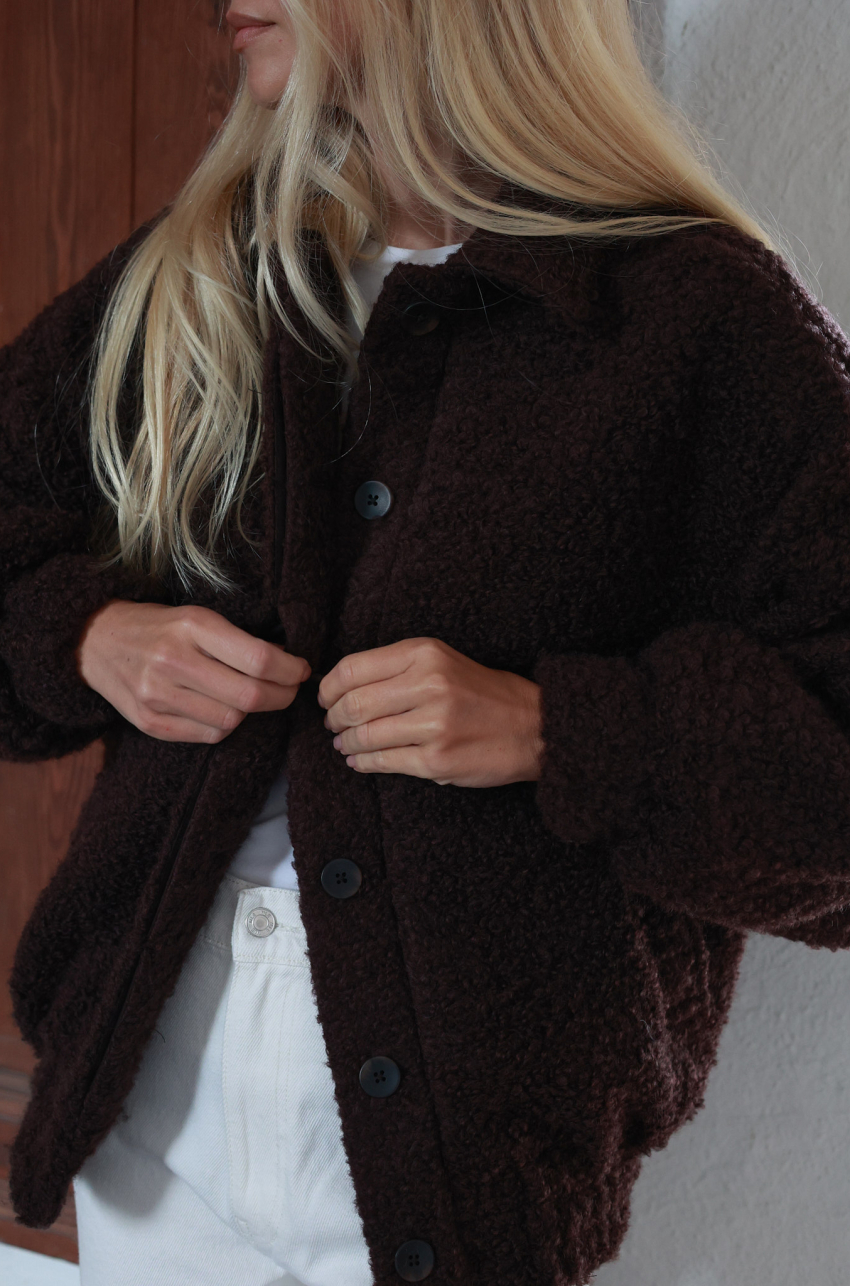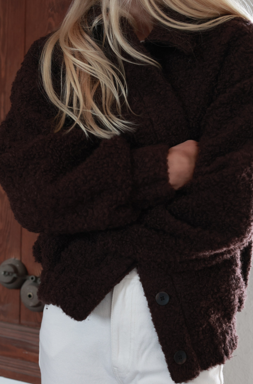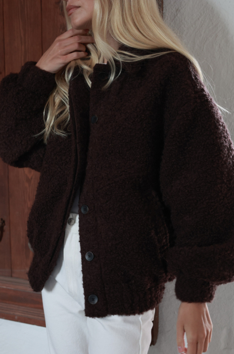 Kurtka z wełny boucle w czekoladowym kolorze. Miękka w dotyku, a jednocześnie niezwykle otulająca – wykonana z tkaniny o wysokiej zawartości wełny (70%). Klasyczny, lekko oversize’owy krój został wykończony prostym kołnierzem i dużymi guzikami, które dodają całości nowoczesnego charakteru.