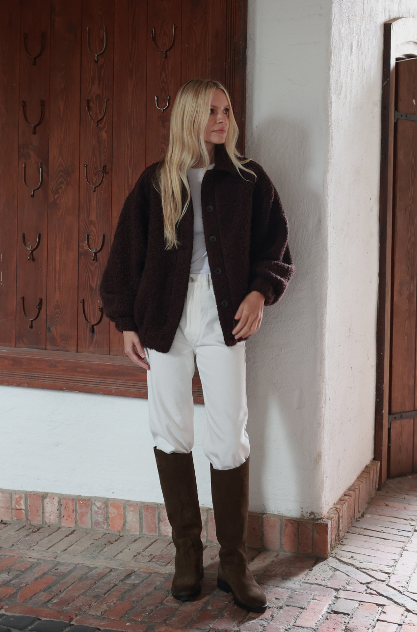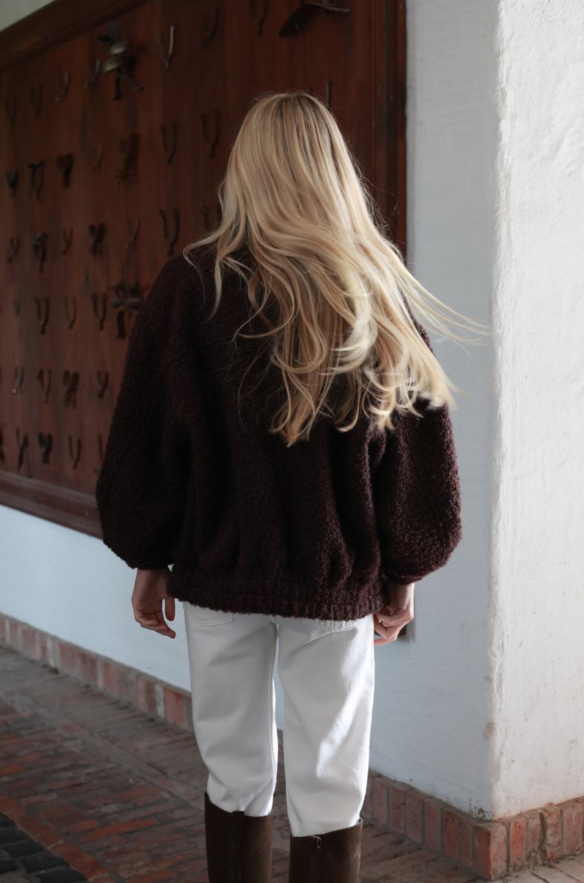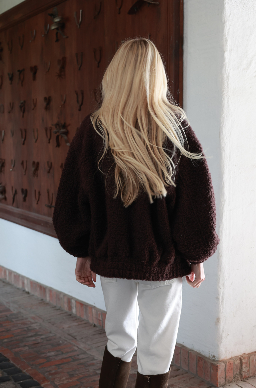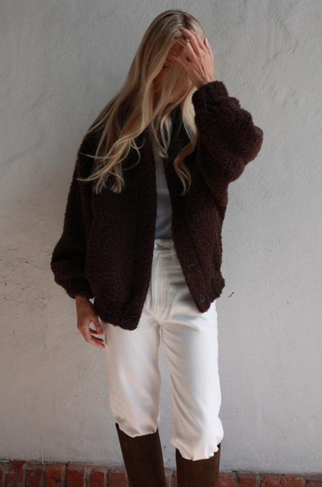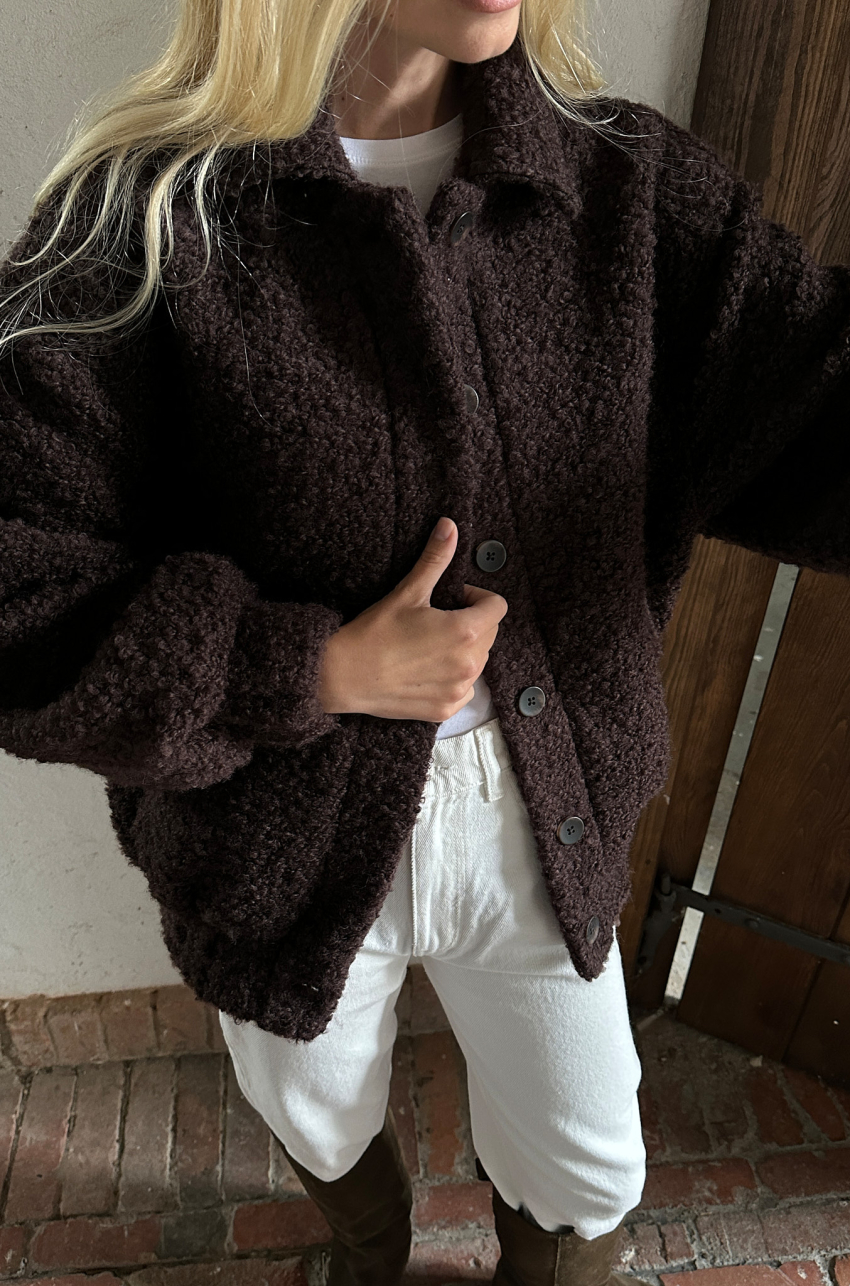 Kurtka z wełny boucle w czekoladowym kolorze. Miękka w dotyku, a jednocześnie niezwykle otulająca – wykonana z tkaniny o wysokiej zawartości wełny (70%). Klasyczny, lekko oversize’owy krój został wykończony prostym kołnierzem i dużymi guzikami, które dodają całości nowoczesnego charakteru.
