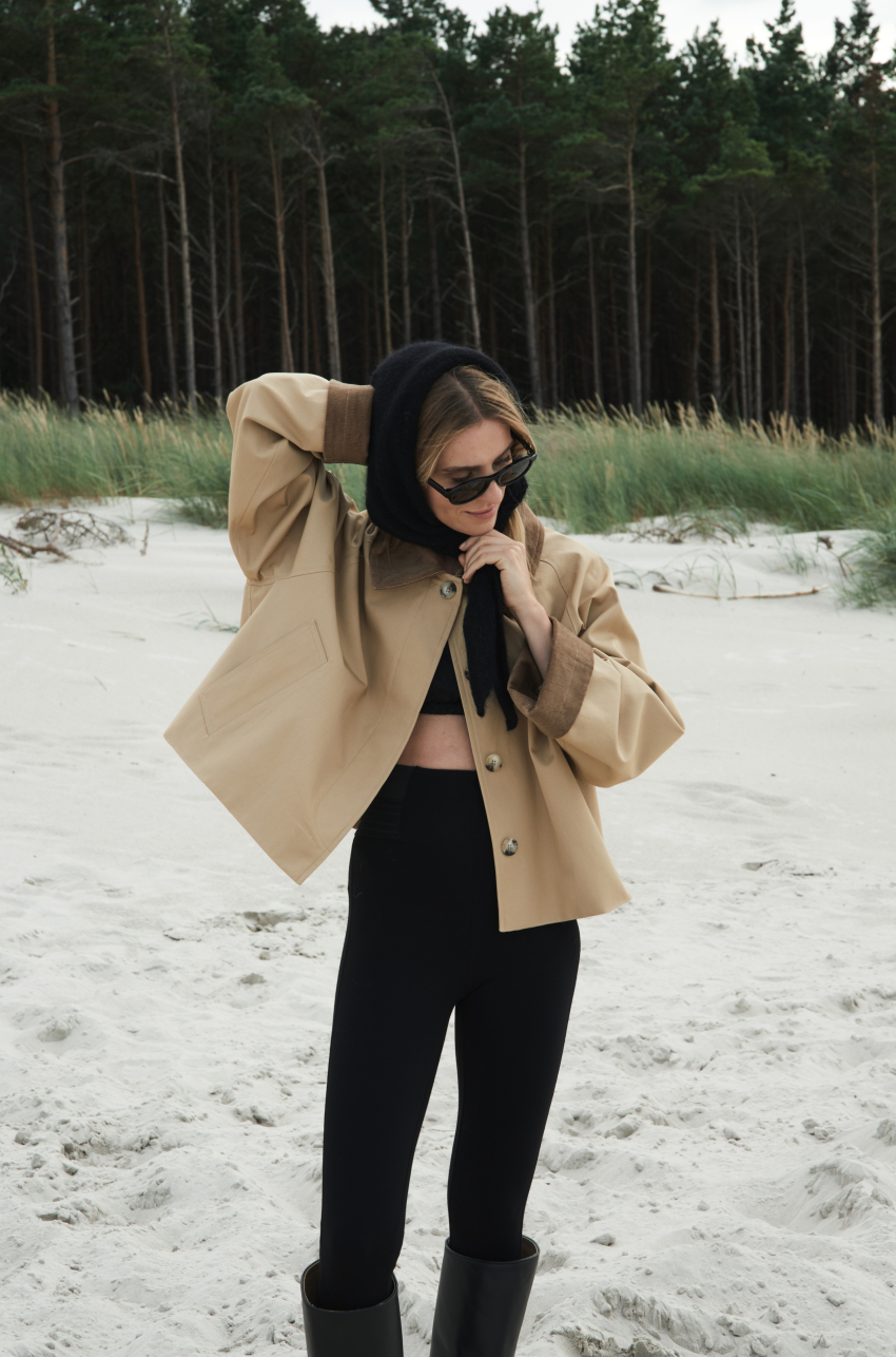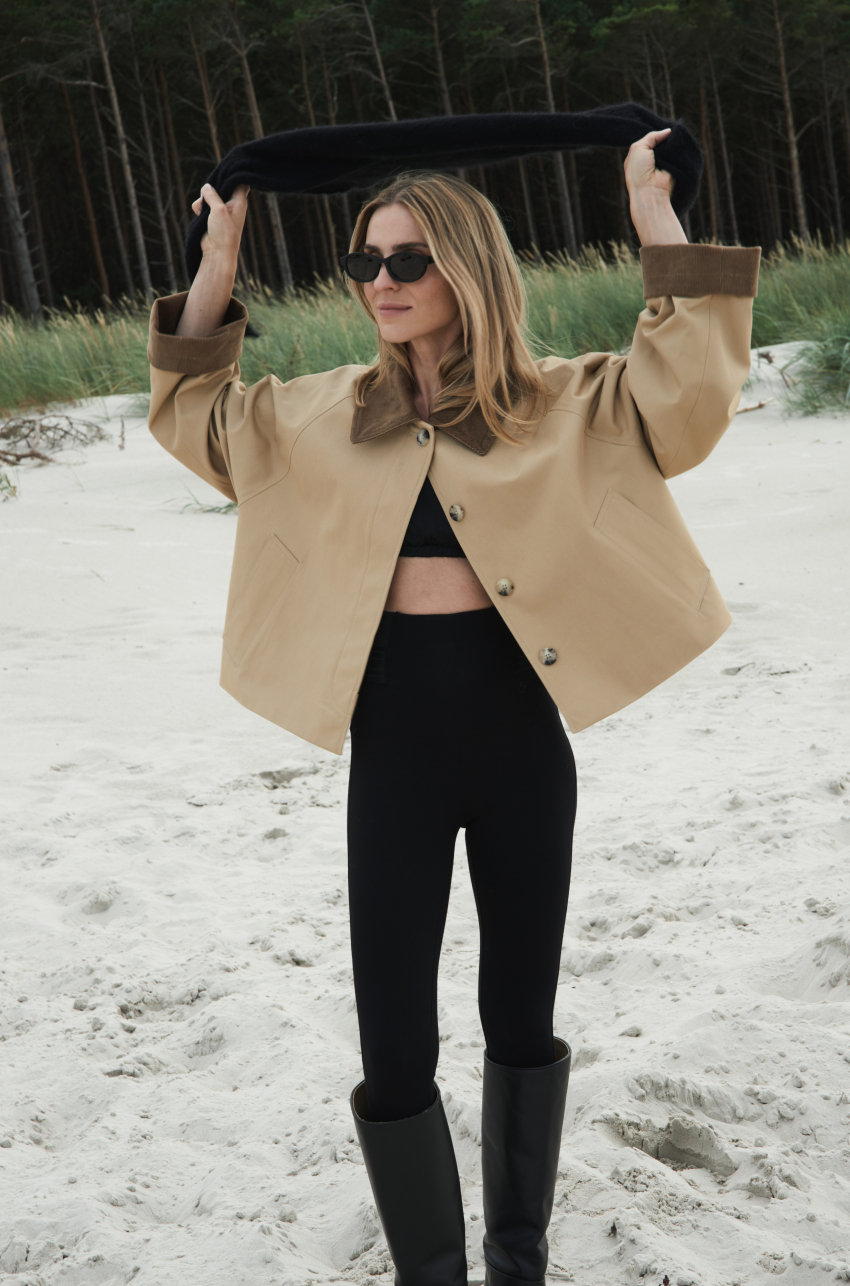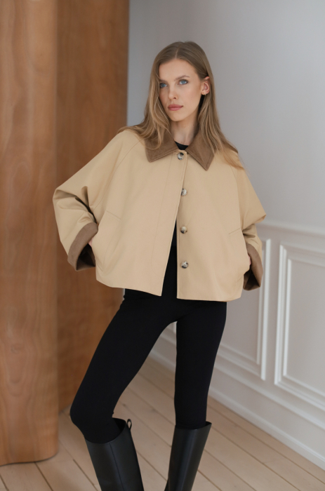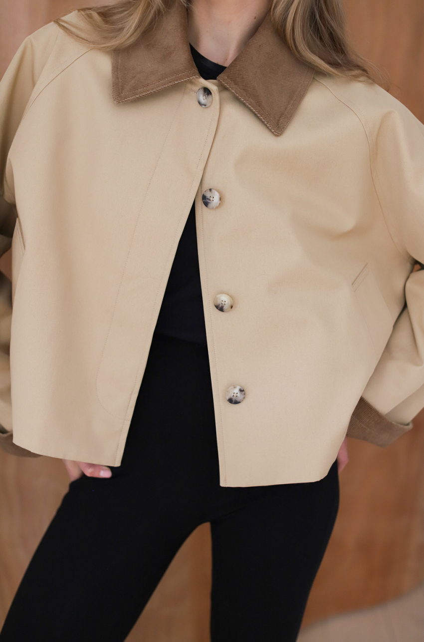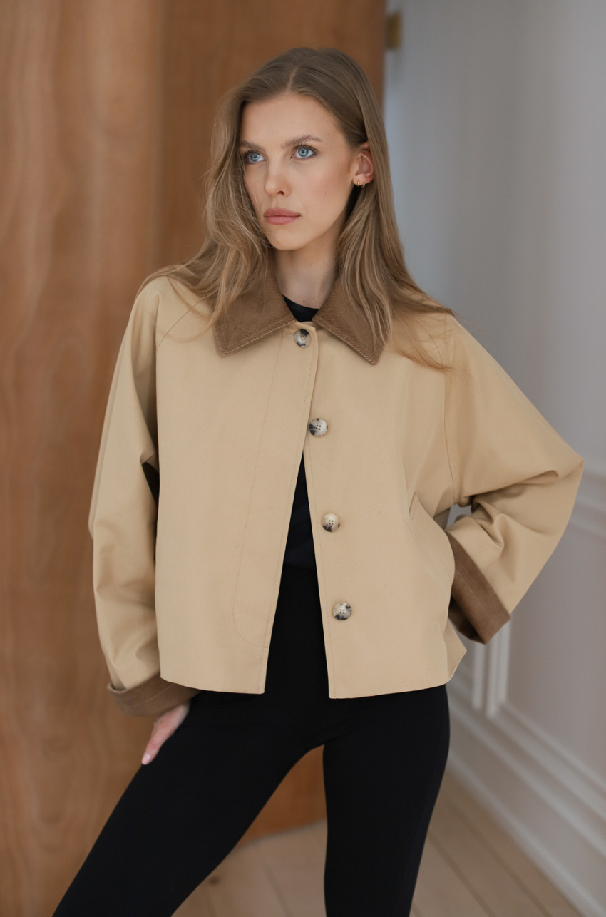 Jesienna kurtka o długości do bioder. Zapinana na guziki ukryte w listwie. . Kurtka posiada sztruksowy kołnierz, który dzięki odpowiedniemu skrojeniu, zawsze dobrze się układa. Tkanina, z której został uszyty, jest pokryta warstwą hydrofobową co sprawia, że ma właściwości wodoodporne.