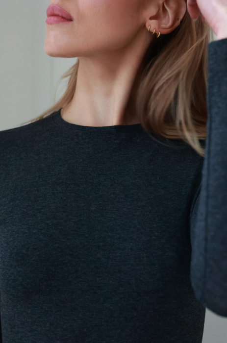 Klasyczny longsleeve w kolorze grafitowym, uszyty z najwyższej jakości wiskozy. Dopasowany do ciała krój pięknie podkreśla figurę. Posiada okrągły dekolt, długie rękawy i wąskie wykończenia. Ten całoroczny klasyk możesz łączyć zarówno ze spódnicą i eleganckimi spodniami jak i ze sportowym dołem.