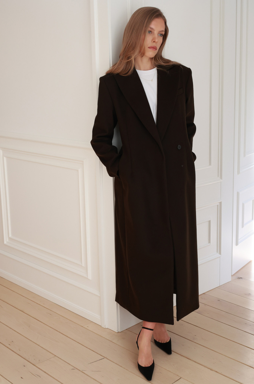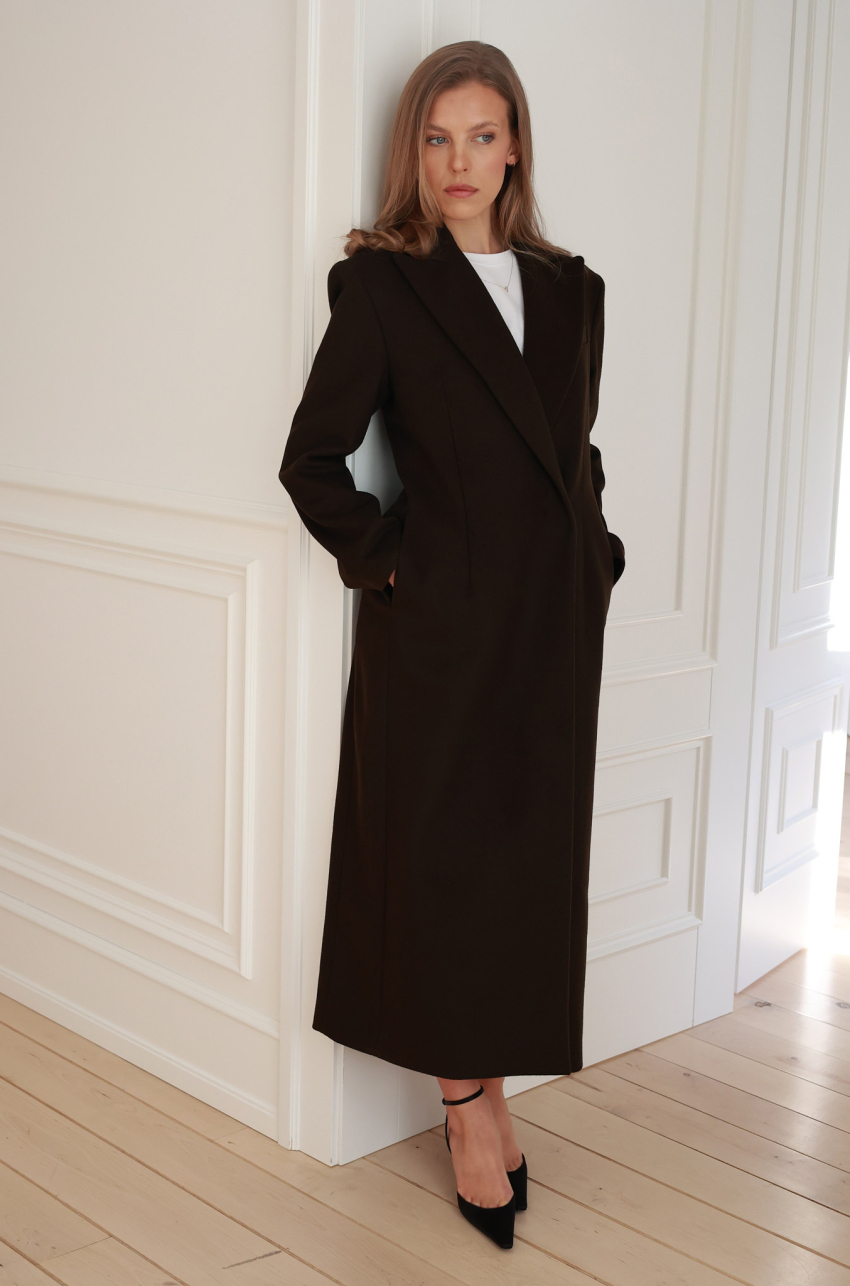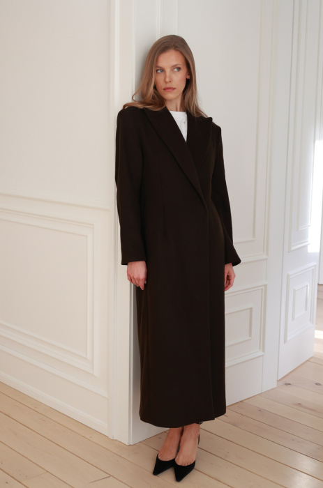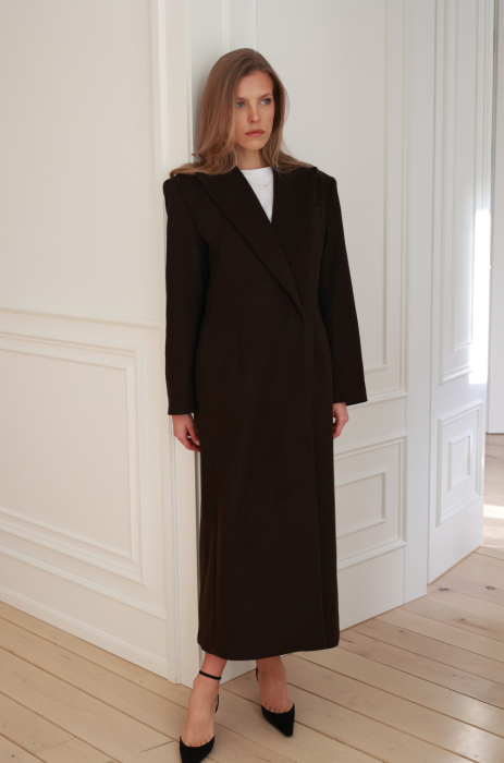Długi płaszcz w eleganckim odcieniu brązu, wykonany z wełnianej tkaniny o bardzo grubej gramaturze. Minimalistyczna forma z zaakcentowanymi ramionami oraz smukłymi, wydłużającymi sylwetkę liniami. Płaszcz zapinany jest na guziki ukryte pod listwą, co podkreśla jego czystą, architektoniczną formę. Klasyczne klapy, kieszenie po bokach i starannie dopracowana długość nadają mu wyjątkowo eleganckiego charakteru.