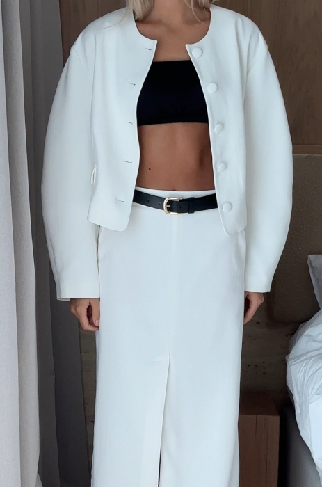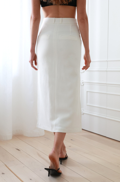Długa spódnica o prostym kroju z eleganckim rozcięciem z przodu. Uszyta z miękkiej, delikatnie elastycznej tkaniny, która pięknie układa się na ciele i zapewnia komfort noszenia przez cały dzień. Minimalistyczna forma i dopracowane detale sprawiają, że model ten doskonale odnajduje się zarówno w codziennych, jak i bardziej formalnych stylizacjach. Sprawdzi się w duecie z klasyczną koszulą, jak i z dopasowanym topem.