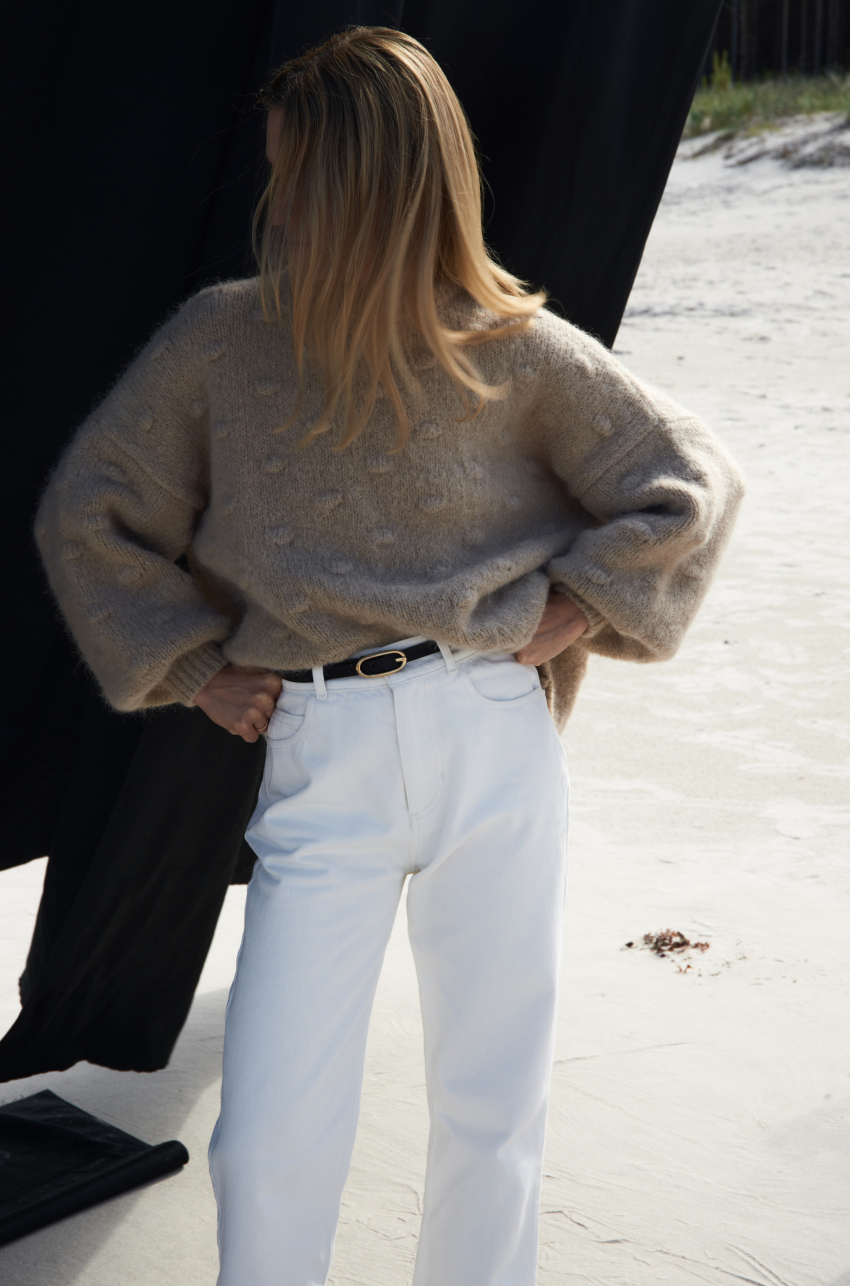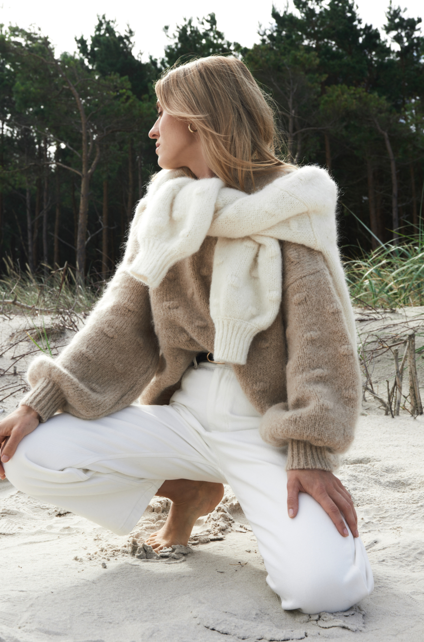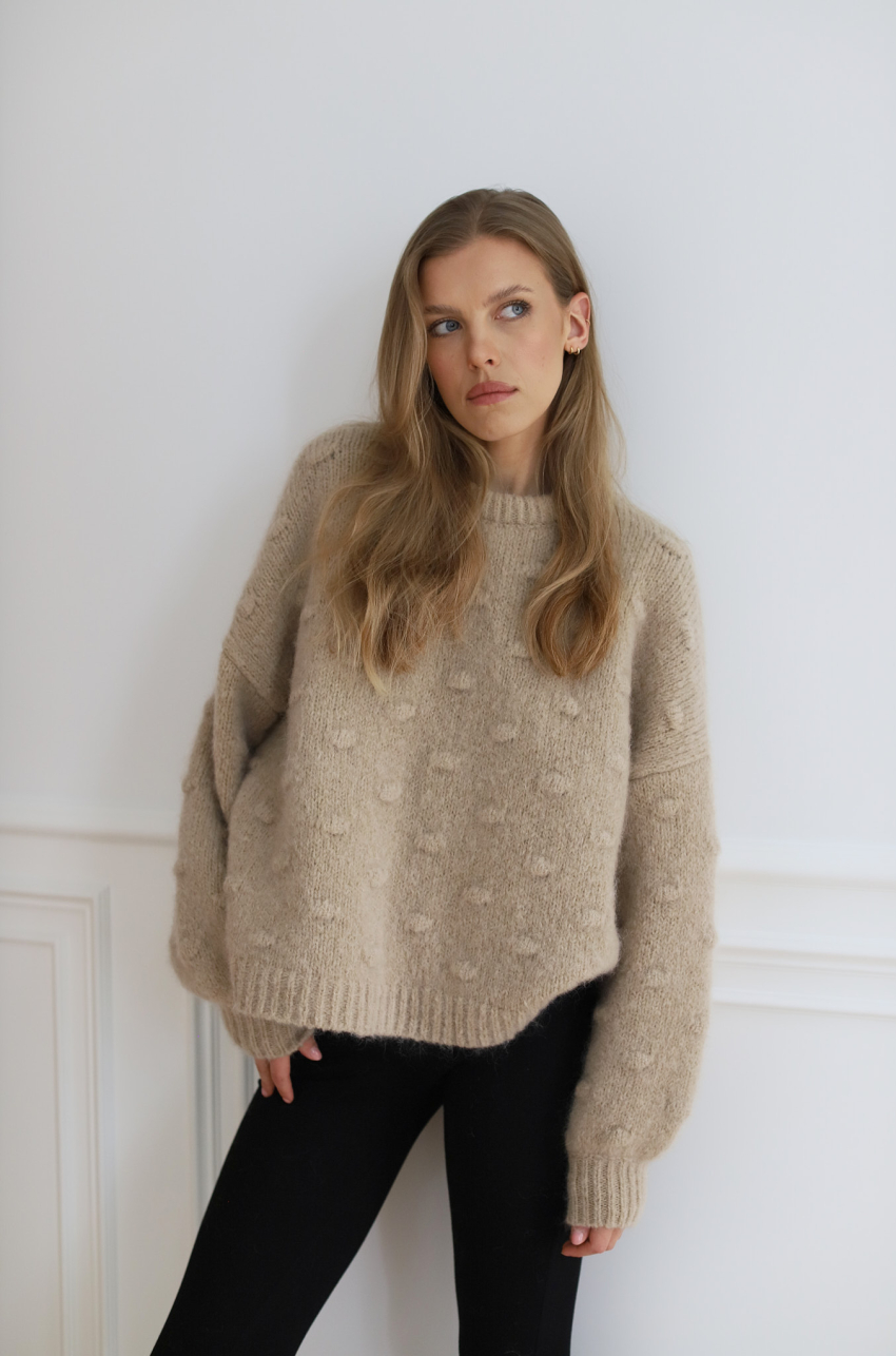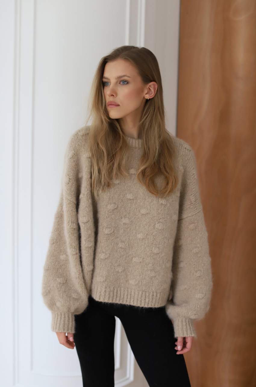 Sweter w kolorze beżowym wykonany ze szlachetnej mieszanki moheru super kid, która ogrzeje Cię nawet w najmroźniejsze dni. Model posiada klasyczny fason, obniżoną linię ramion, ściągacze i ozdobne wypukłości. Długi, lśniący włos moheru, nadaje mu puszystości.