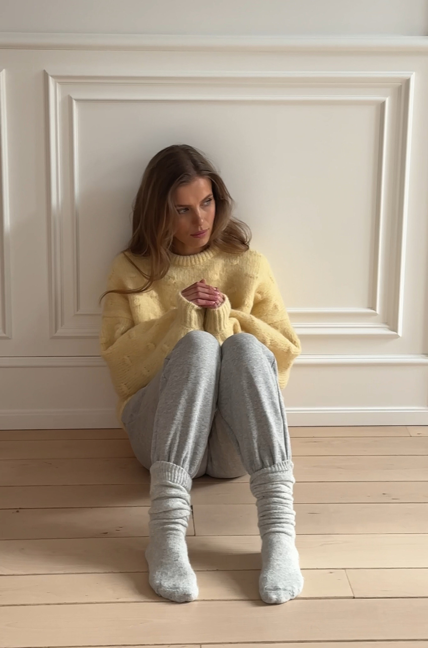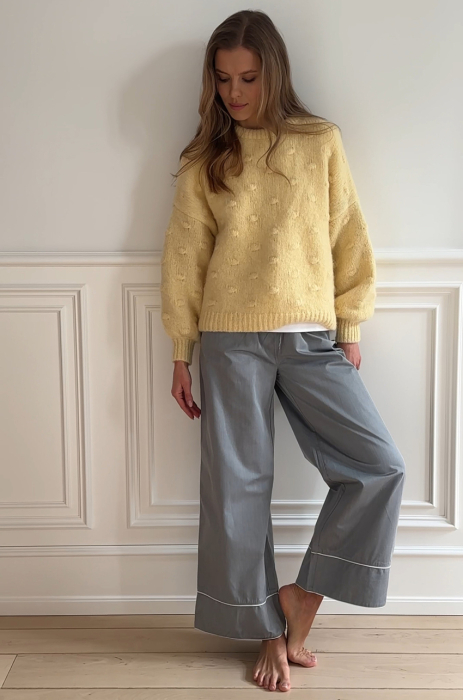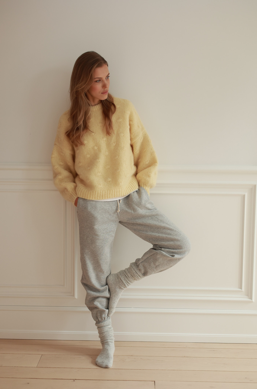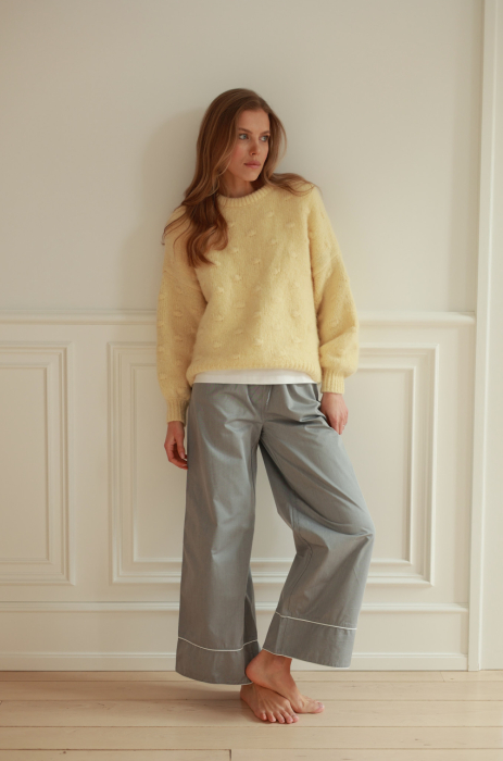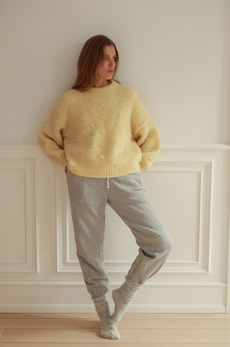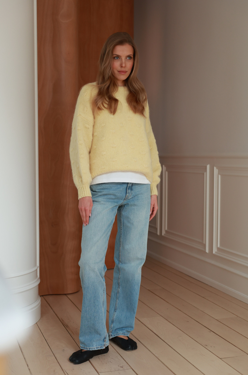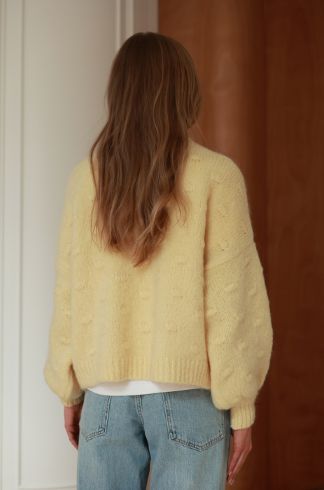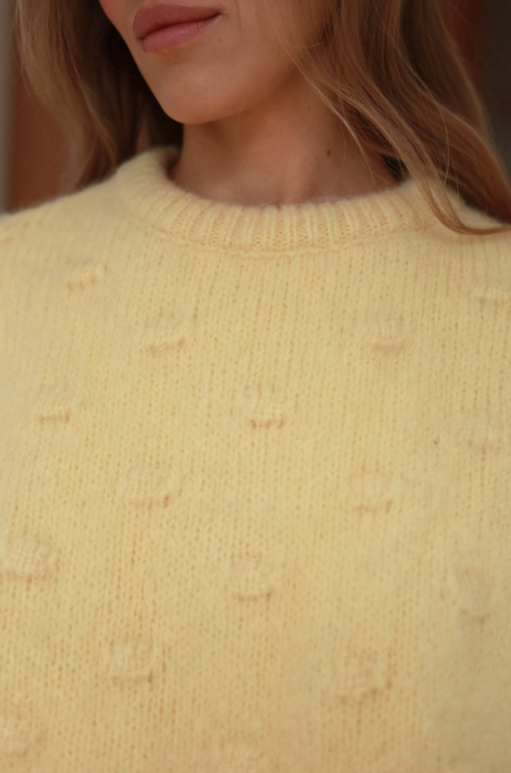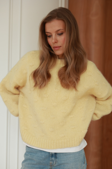 Sweter w kolorze masełkowym wykonany ze szlachetnej mieszanki moheru super kid, która ogrzeje Cię nawet w najmroźniejsze dni. Model posiada klasyczny fason, obniżoną linię ramion, ściągacze i ozdobne wypukłości. Długi, lśniący włos moheru, nadaje mu puszystości.