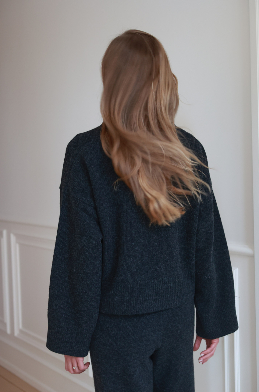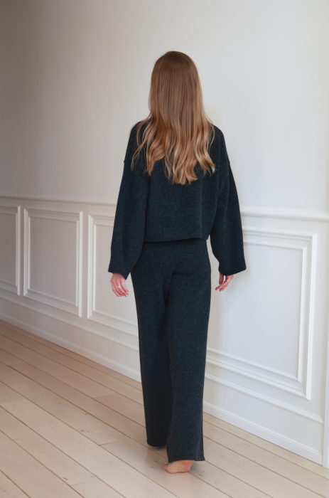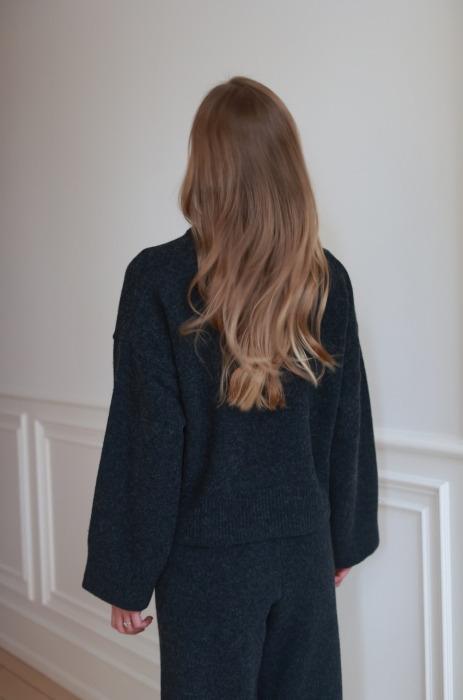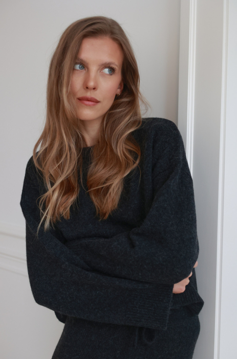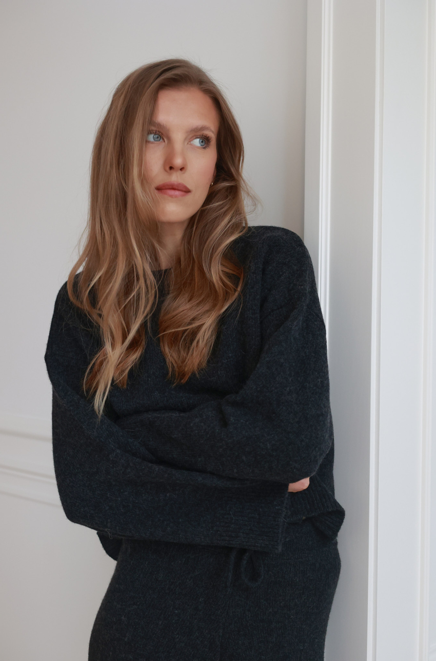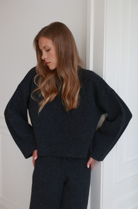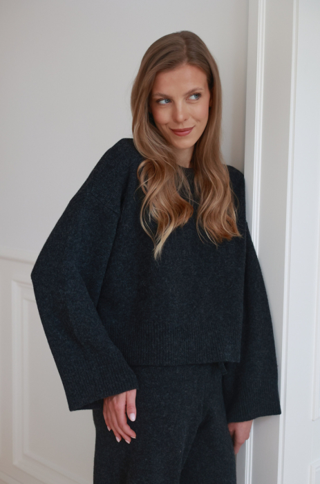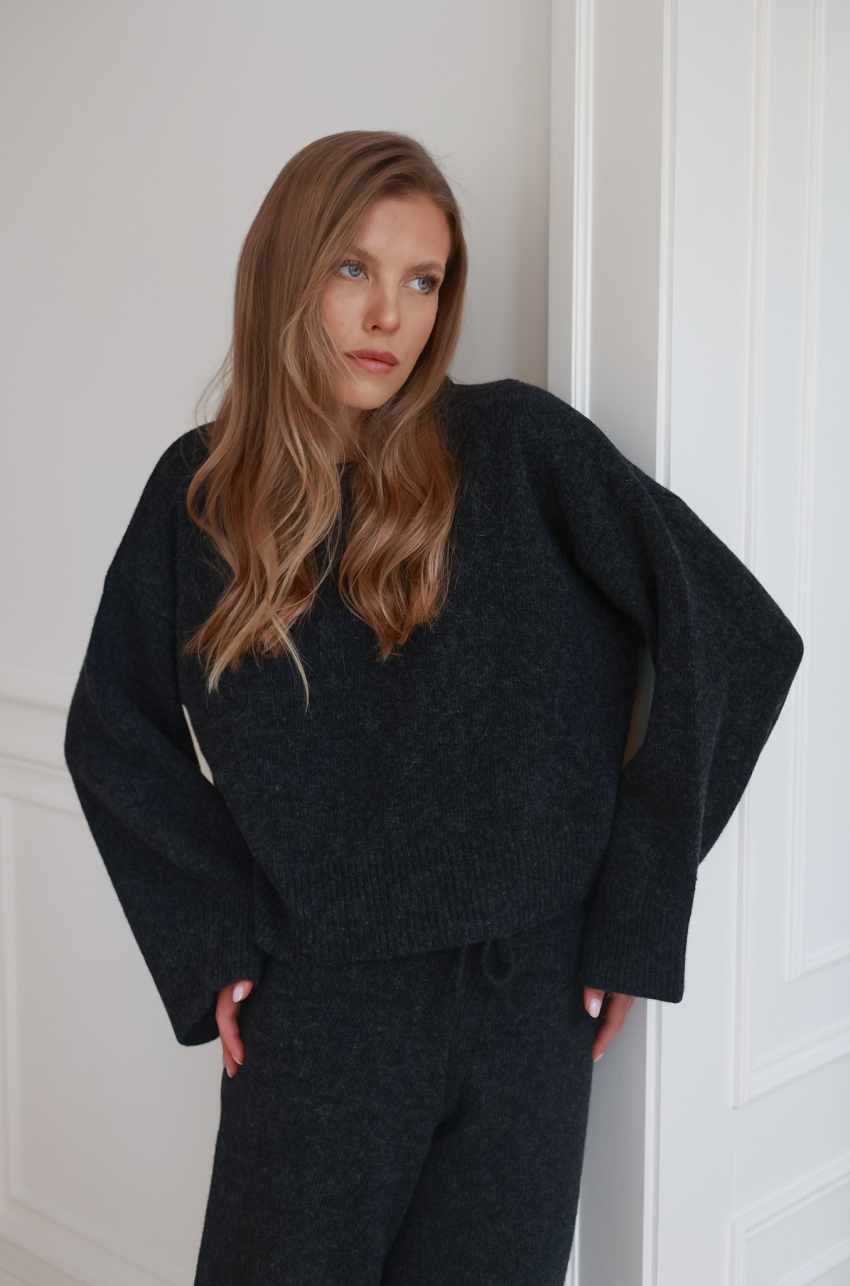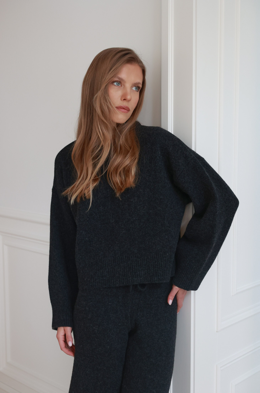 Luźny sweter o pudełkowym kroju, wykonany z miękkiej i przyjemnej w dotyku dzianiny wełnianej w kolorze grafitowym. Model ten posiada obniżoną linię ramion, okrągły dekolt i ściągacze. Przewaga wełny zapewnia odpowiednią termoregulację. Połącz go ze spodniami Halifax tworząc komfortowy set na chłodne, jesienne dni.