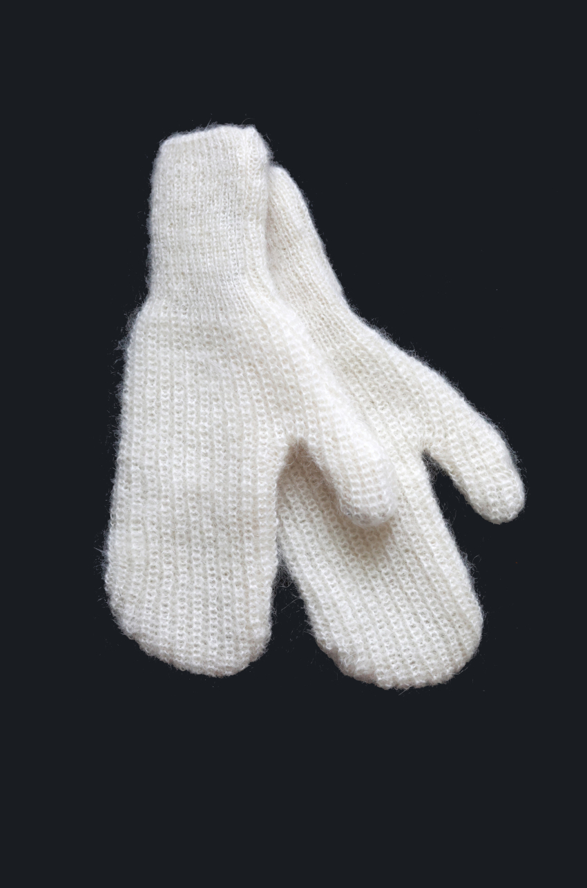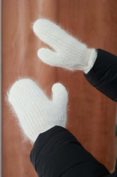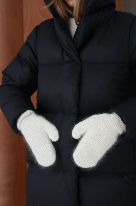 Rękawiczki z jednym palcem, wykonane w 65% z przędzy super kid mohair. Miękkie i puszyste, ponieważ przędza super kid mohair ma widoczny lśniący włos, który sprawia, że wykonane z niej dodatki i ubrania pięknie odbijają światło.