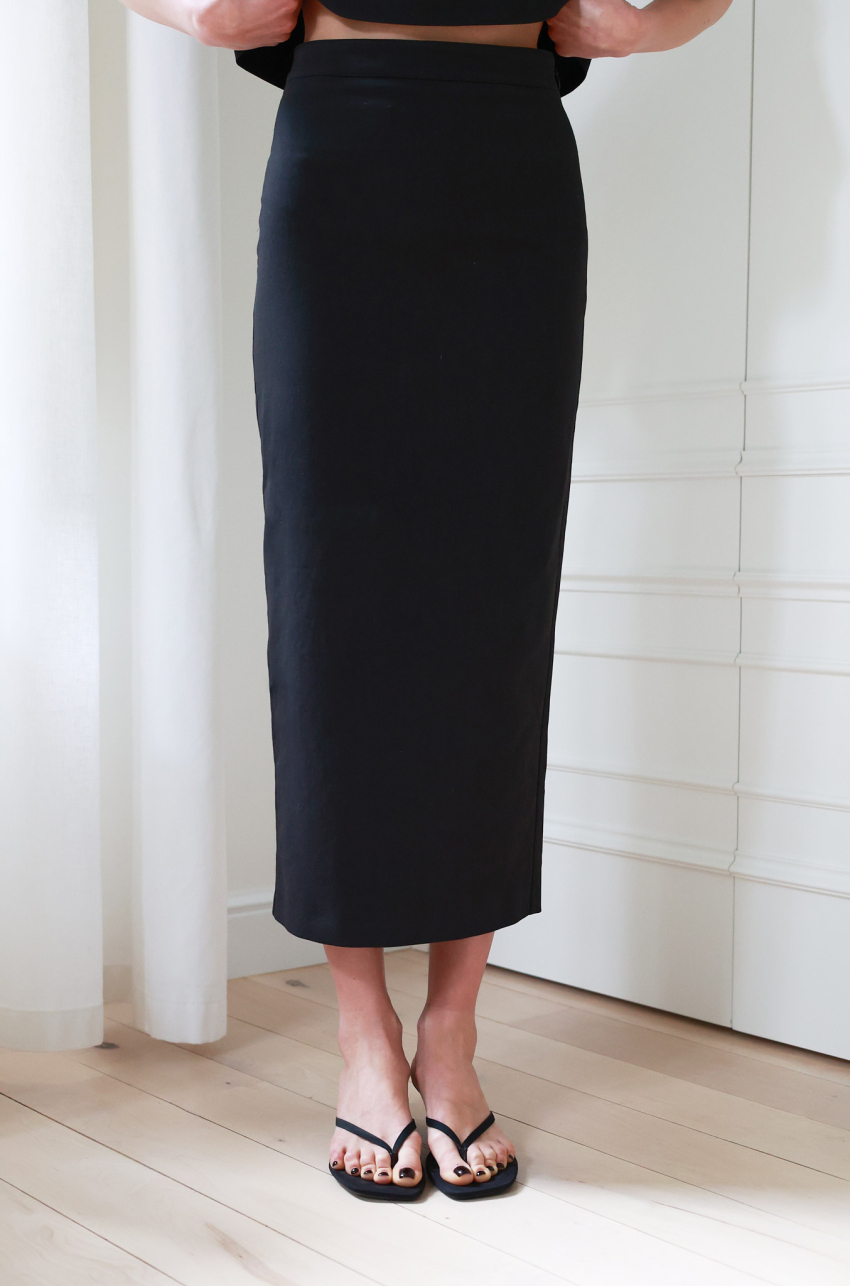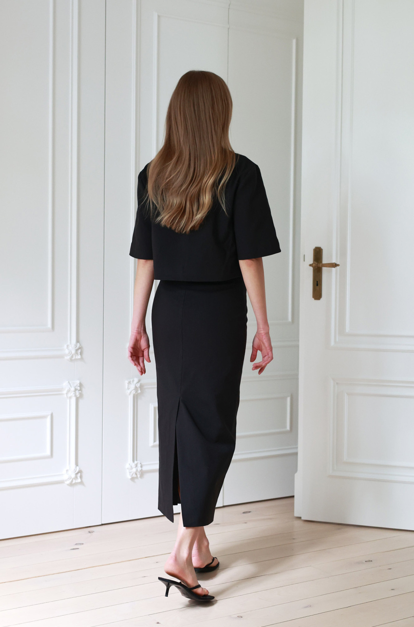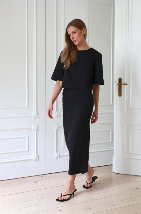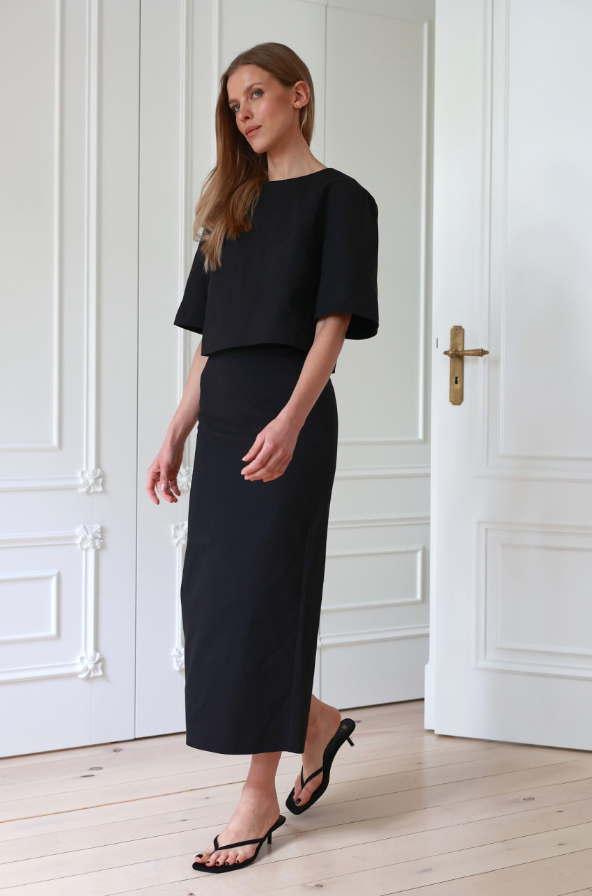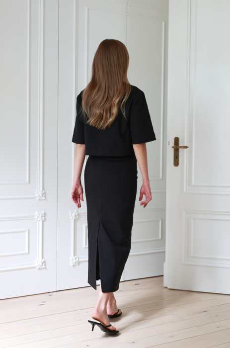 Spódnica w kolorze czarnym, wykonana z certyfikowanej mieszanki bawełny i wiskozy o prostym kroju. Posiada długość przed kostkę, wysoki stan i ołówkowy fason. Po boku zapięcie na kryty zamek, z tyłu efektowne rozcięcie, które zapewnia komfort noszenia. Połącz ją z bluzką Bresso tworząc nowoczesny set.