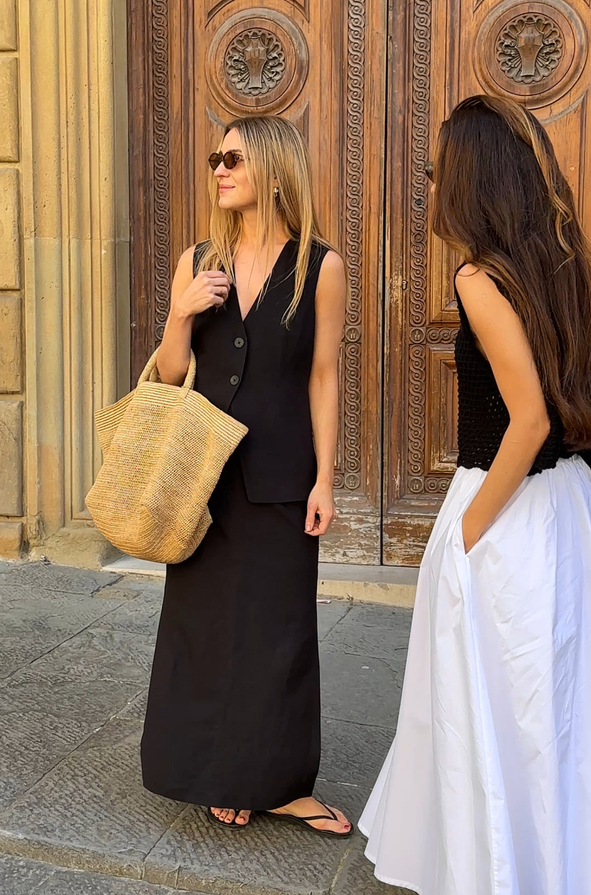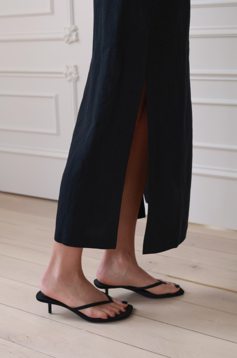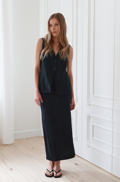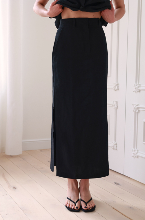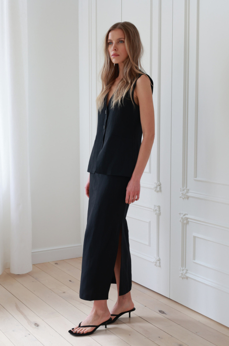 Spódnica z mieszanki rayonu i lnu o prostym nowoczesnym kroju. Posiada długość przed kostkę, wysoki stan i ołówkowy fason. Szlufki wszyte w pas pozwalają na noszenie paska. Z przodu na haftkę oraz guzik. Rozcięcia po boku pozwalają zachować komfort noszenia. Posiada bawełnianą podszewkę.