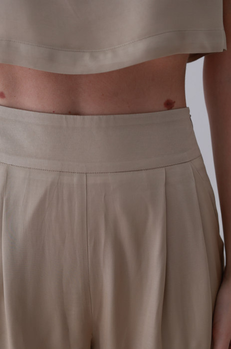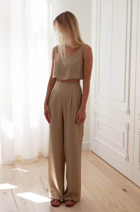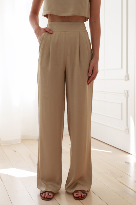 Długie spodnie w kolorze złocistego beżu, wykonane z lejącej, satynowej tkaniny (100% wiskoza z certyfikatem Ecovero). Model ten posiada lekko rozszerzone nogawki, ozdobne zaszewki z przodu oraz dwie boczne kieszenie. Połącz je z krótkim topem Norwich tworząc wakacyjny set.