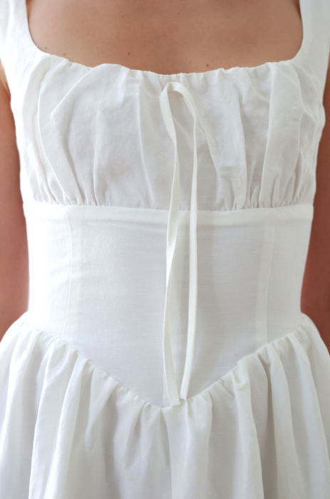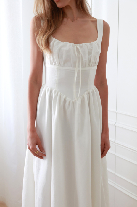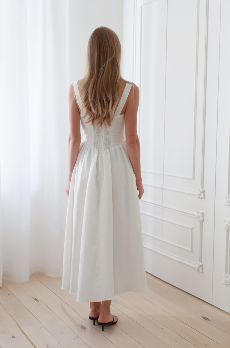 Sukienka maxi w kształcie litery A, wykonana z mieszanki rayonu i lnu w kolorze ciepłej bieli. Posiada szerokie ramiączka, romantyczne wiązanie przy dekolcie i szew w kształcie litery „v” odcinający gorset od swobodnego, rozkloszowanego dołu. Podszewka wykonana z certyfikowanej, przyjemnej dla ciała bawełny.
