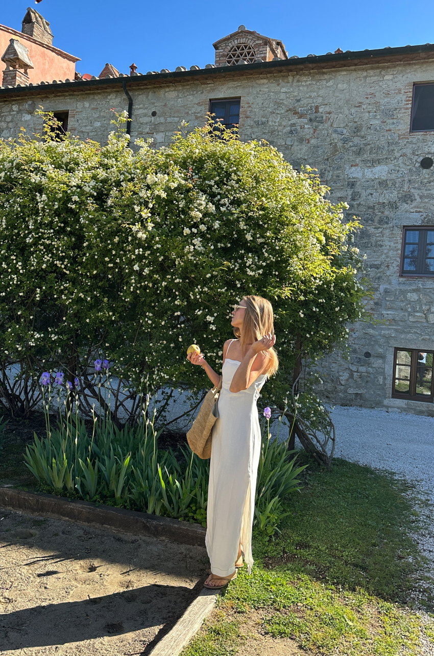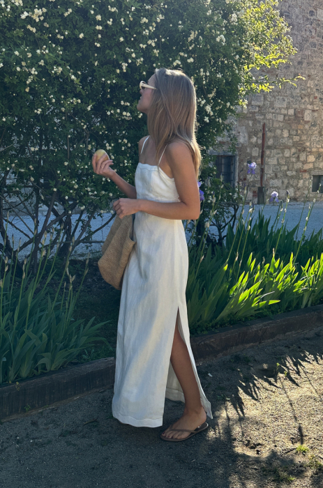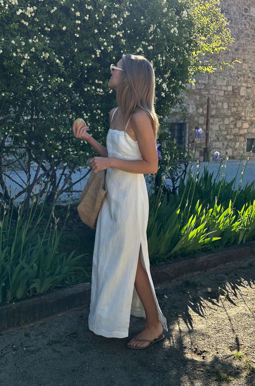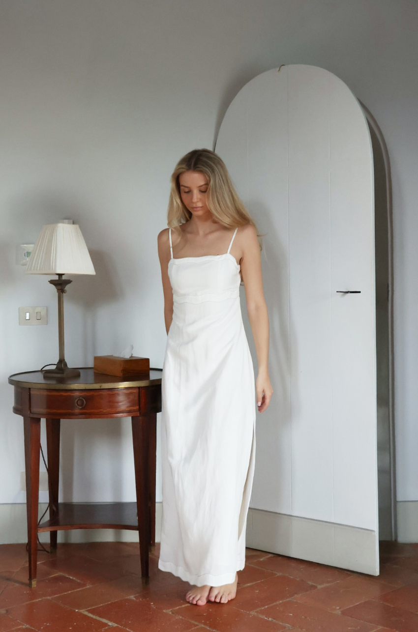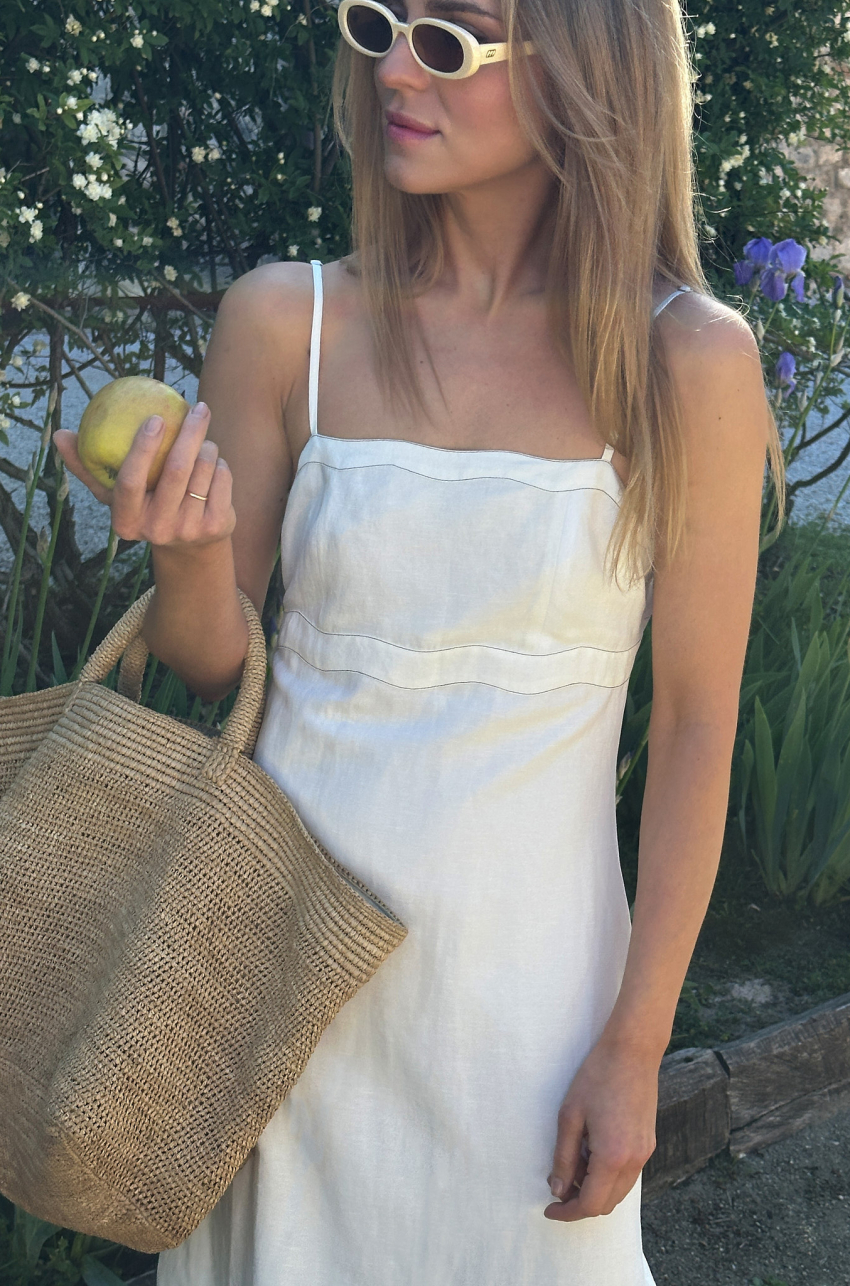Sukienka maxi o prostym kroju. Wykonana z certyfikowanej mieszanki rayonu i lnu, która zapewnia skórze odpowiednią termoregulację. Posiada cienkie ramiączka i nowoczesny detal w postaci falowanego wykończenia dekoltu oraz talii. Ten drobny szczegół czyni ten model wyjątkowym. Subtelnie poszerzony dół od linii bioder zapewnia swobodę ruchu i pełen komfort użytkowania. Z tyłu wiązanie oraz kryty zamek.