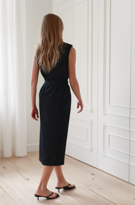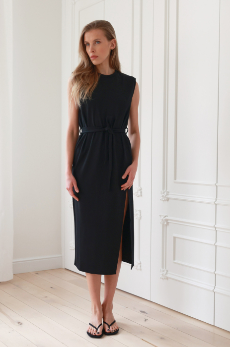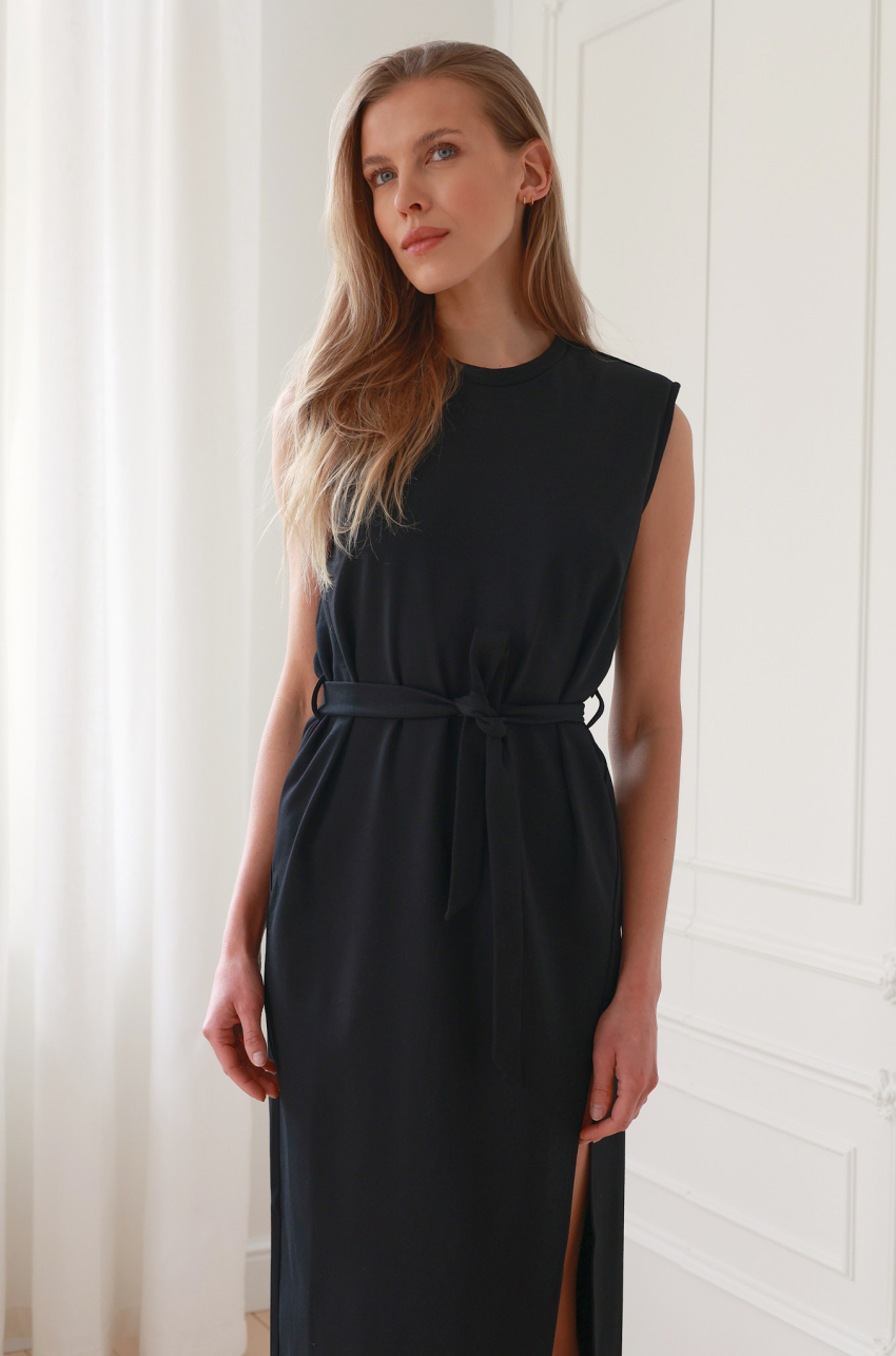 Długa sukienka w kolorze czarnym, która zachwyca swoją prostą formą. Wykonana z mieszanki wiskozy. Wiązana w pasie. Ramiona zaakcentowane poduszkami. Długość przed kostkę optycznie wydłuża i wysmukla sylwetkę. Elastyczna i wyjątkowo miękka tkanina zapewniają swobodę ruchu i komfort użytkowania. Noś ją do klapek i sandałów.