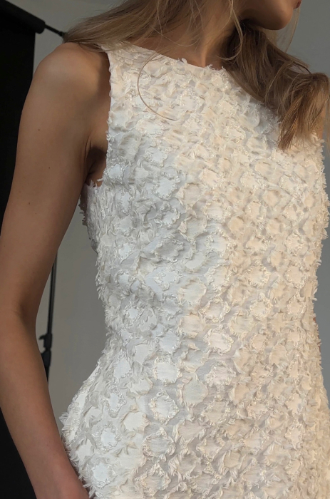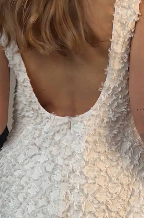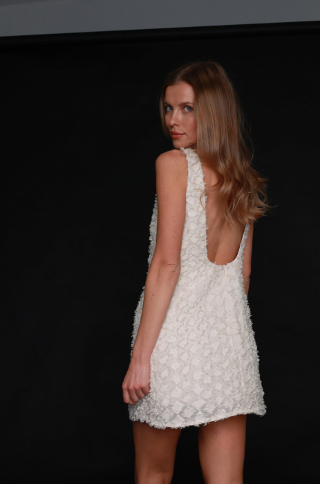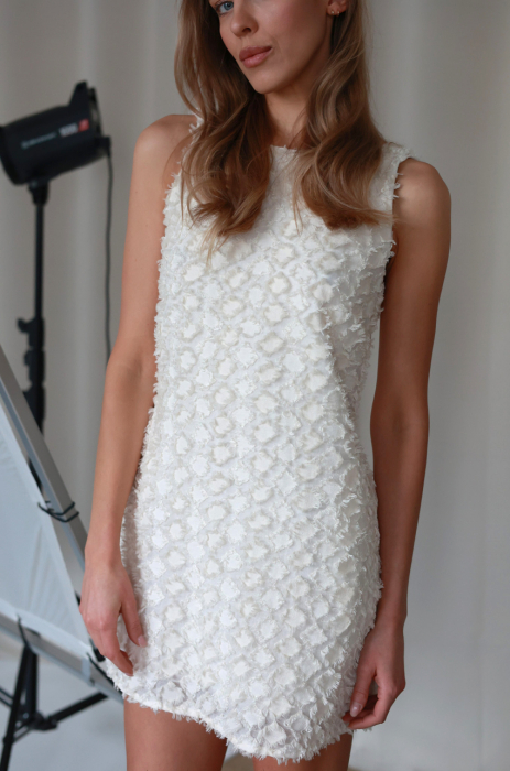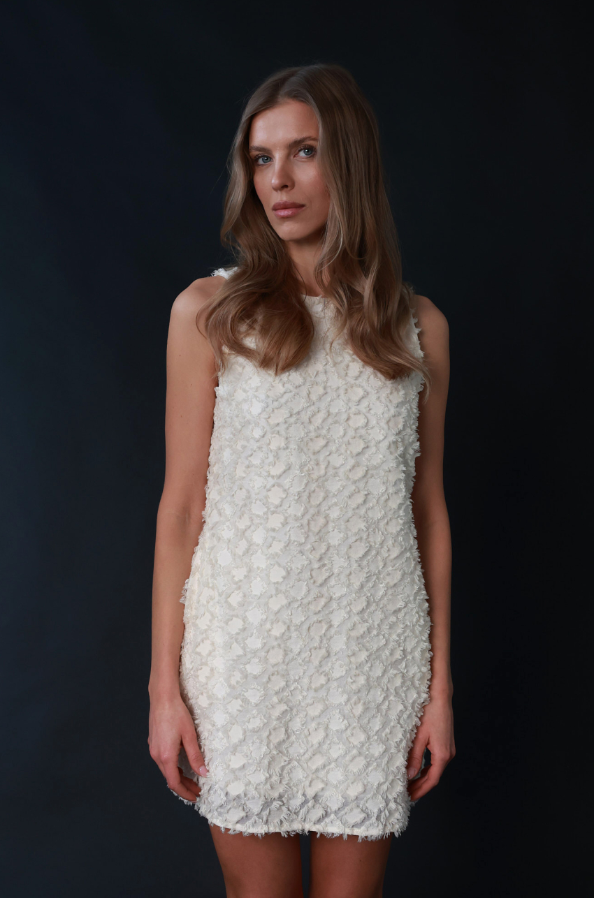 Sukienka mini w kolorze ecru, wykonana z fakturowanej mieszanki wiskozy bambusowej i bawełny. Posiada klasyczny, trapezowy fason, szerokie ramiączka i kieszenie w szwach bocznych. Z tyłu głębokie wycięcie. Drobne postrzępione detale, nadają tkaninie trójwymiarowości. Podszewka 100% bawełna.