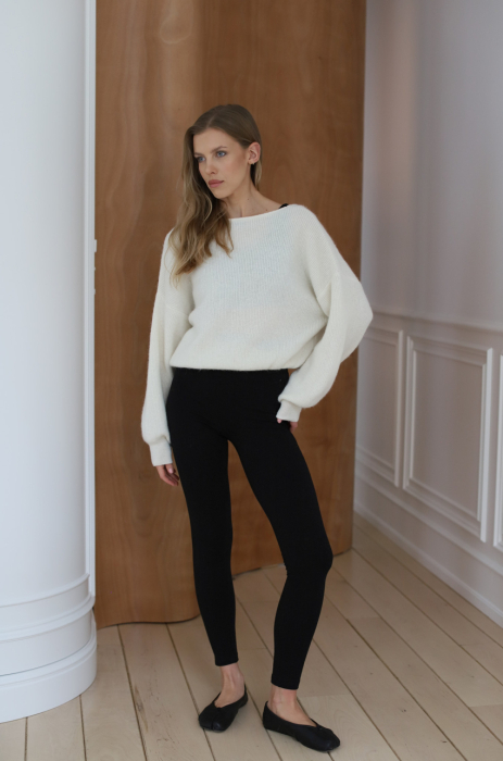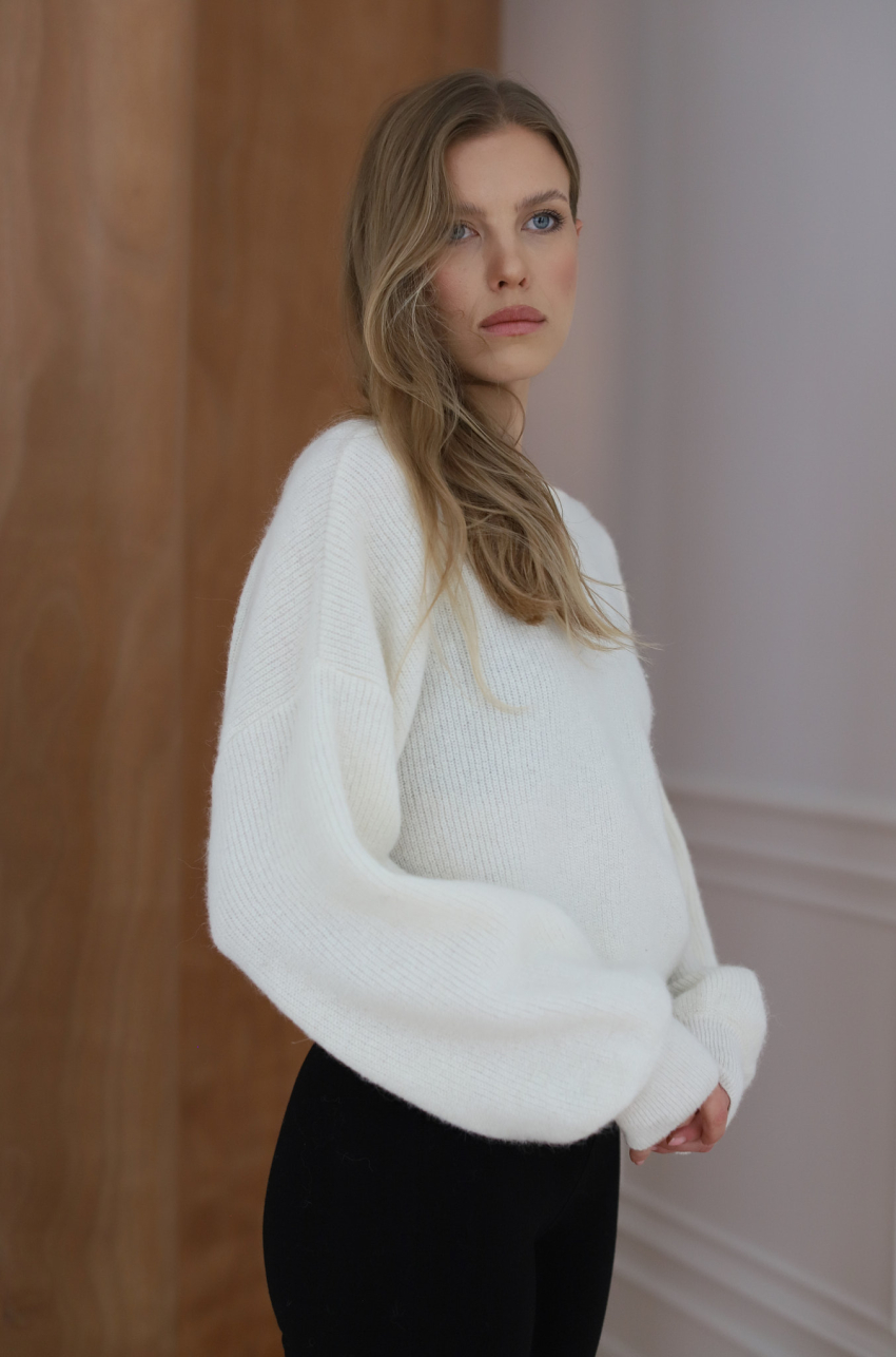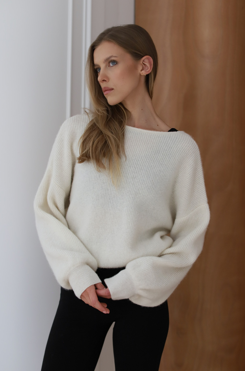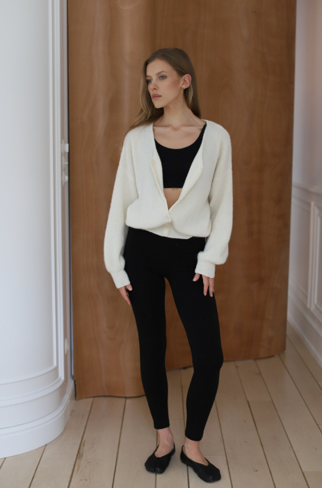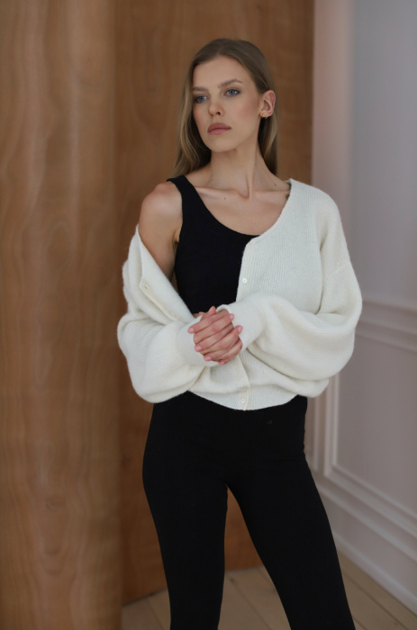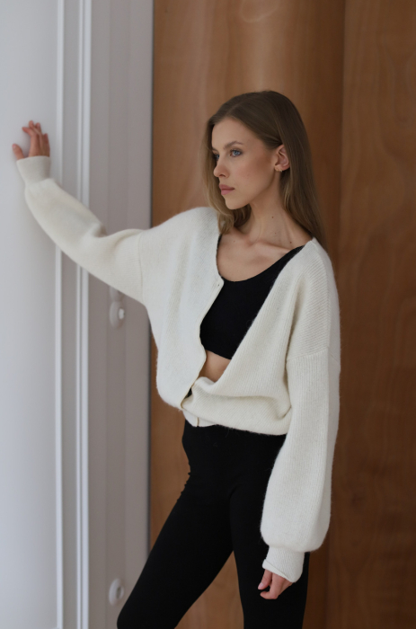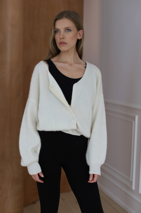 Sweter w kolorze écru, wykonany z miękkiej i przyjemnej w dotyku mieszanki wełny. Model o luźnym kroju z obniżoną linią ramion i długimi rękawami zakończonymi szerokimi ściągaczami. Zapinany na guziki, które umożliwiają noszenie go zarówno klasycznie – z zapięciem z przodu, jak i tyłem do przodu – z dekoltem w kształcie litery „V” na plecach. Naturalna przędza sprawia, że sweter jest lekki, ciepły i komfortowy w noszeniu.