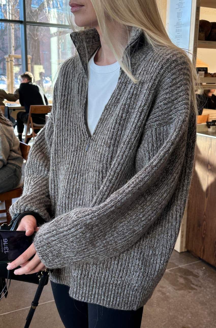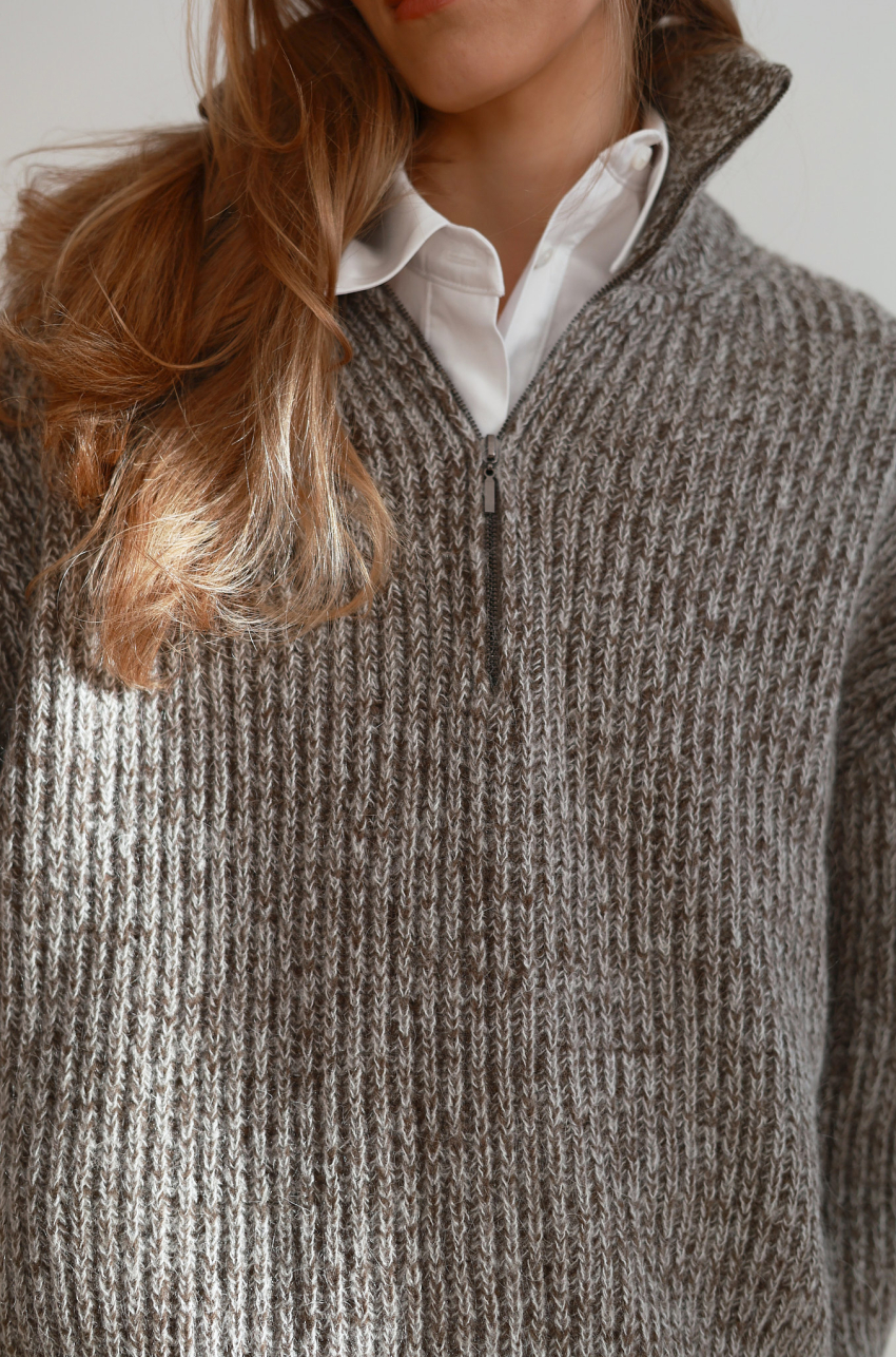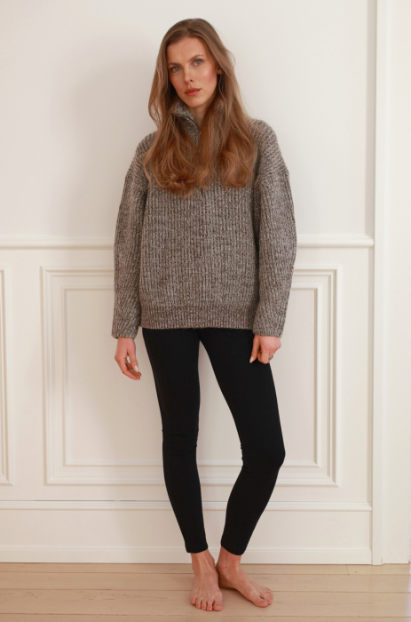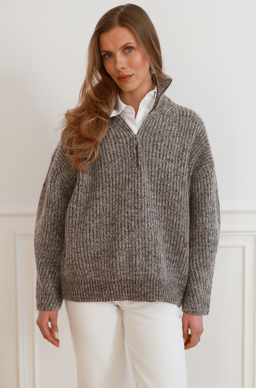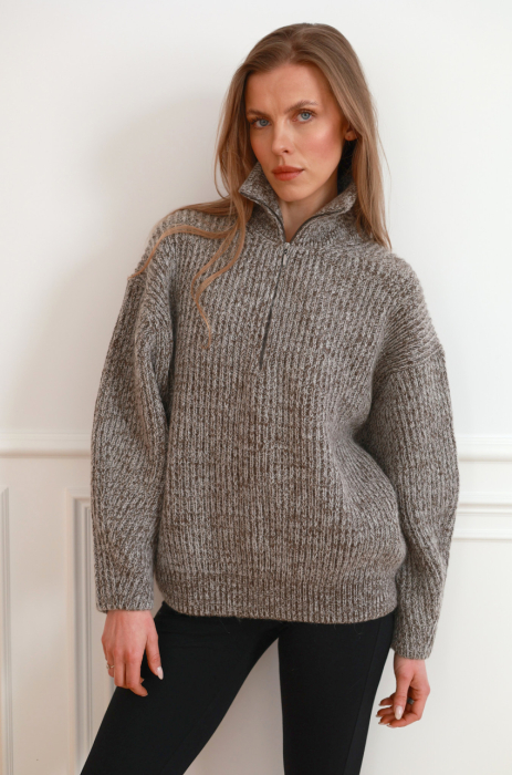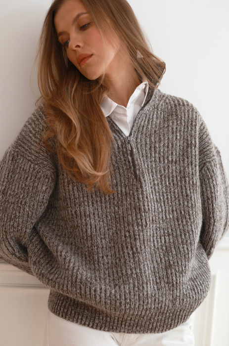 Sweter o luźnym, komfortowym kroju wykonany ze szlachetnej mieszanki wełny merino. Mięsista, miękka dzianina zapewnia ciepło, jednocześnie pozostając lekka i przyjemna dla skóry. Model z wysoką stójką oraz krótkim zamkiem przy dekolcie. Obniżona linia ramion i swobodne rękawy nadają całości nowoczesnego charakteru. Wykończony ściągaczem przy rękawach i u dołu.