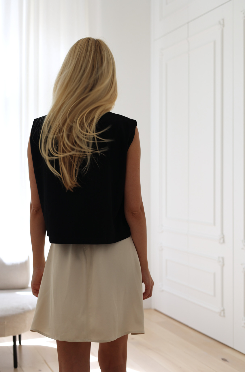 Czarny, trapezowy top bez rękawów, uszyty z delikatnej i przyjemnej w dotyku bawełny. Posiada klasyczny, okrągły dekolt oraz luźny fason. Jego długość pozwala na komfortowe włożenie go w spodnie z wyższym stanem lub spódnicę i jednocześnie nadaje sylwetce idealnych proporcji. To bez wątpienia jeden z największych klasyków w garderobie każdej kobiety.