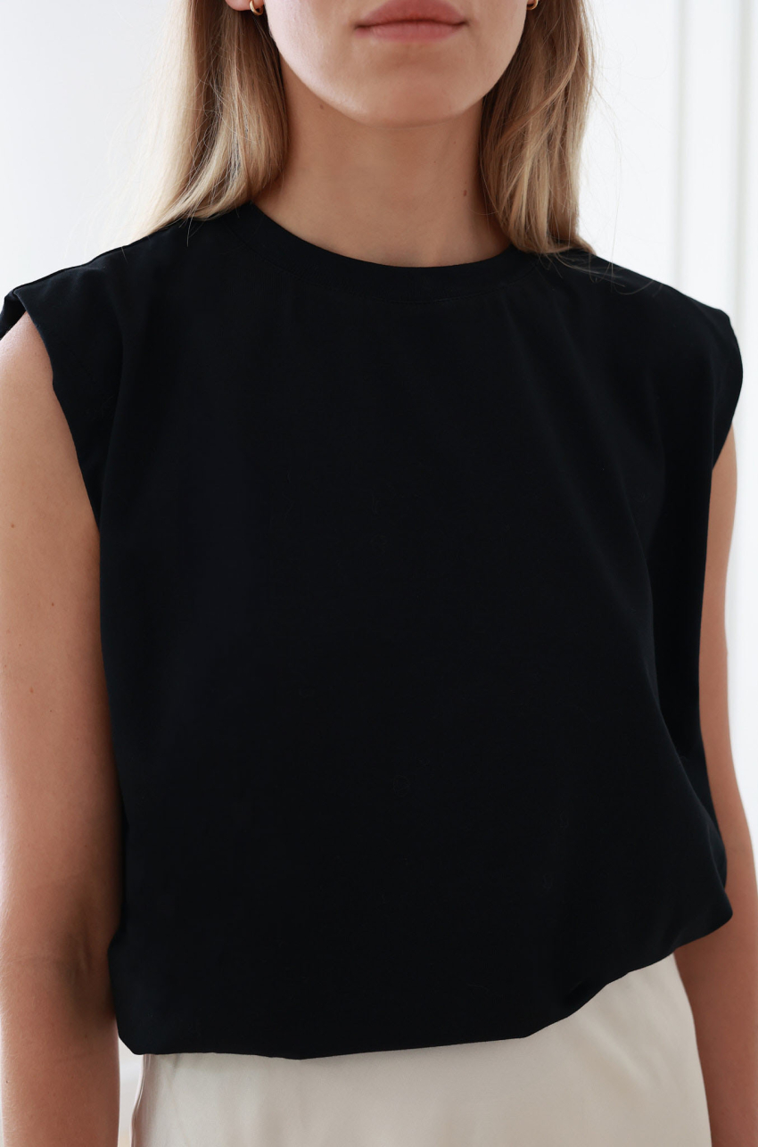 Czarny, trapezowy top bez rękawów, uszyty z delikatnej i przyjemnej w dotyku bawełny. Posiada klasyczny, okrągły dekolt oraz luźny fason. Jego długość pozwala na komfortowe włożenie go w spodnie z wyższym stanem lub spódnicę i jednocześnie nadaje sylwetce idealnych proporcji. To bez wątpienia jeden z największych klasyków w garderobie każdej kobiety. Model wydłużony o 5 cm.