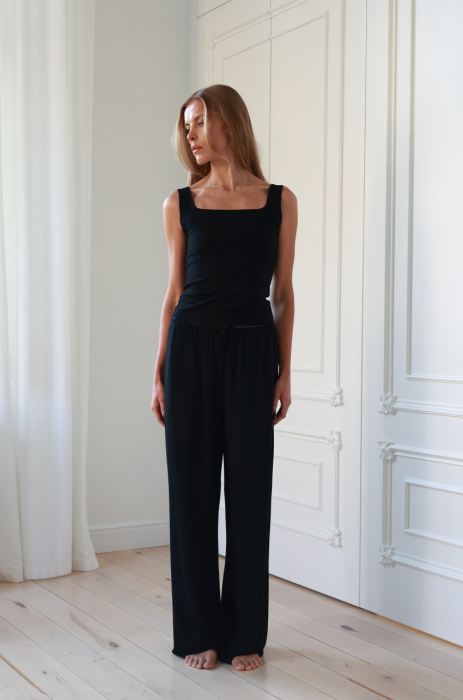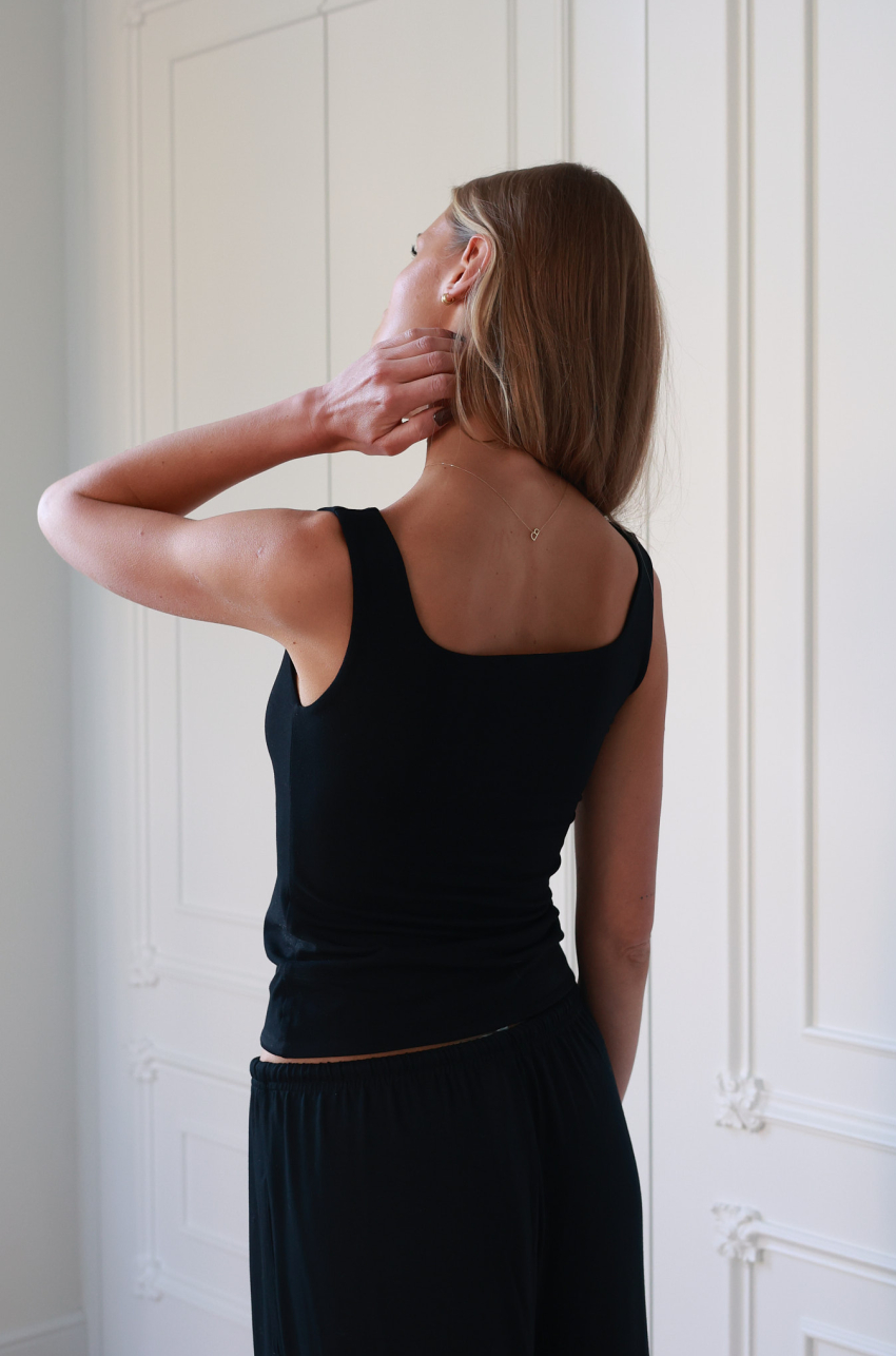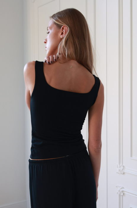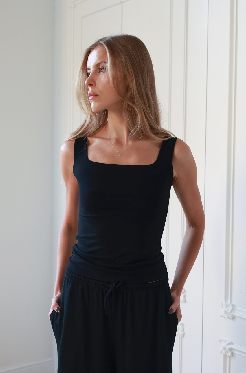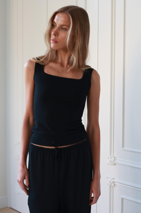 Klasyczny top na szerokich ramiączkach w kolorze czarnym, wykonany z przyjemnej dla ciała, elastycznej tkaniny z certyfikatem Oeko-Tex. Dekolt typu cargo.