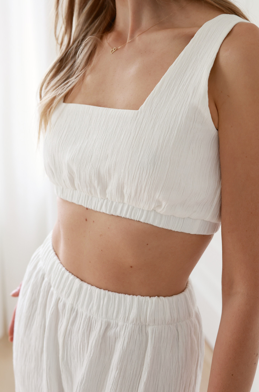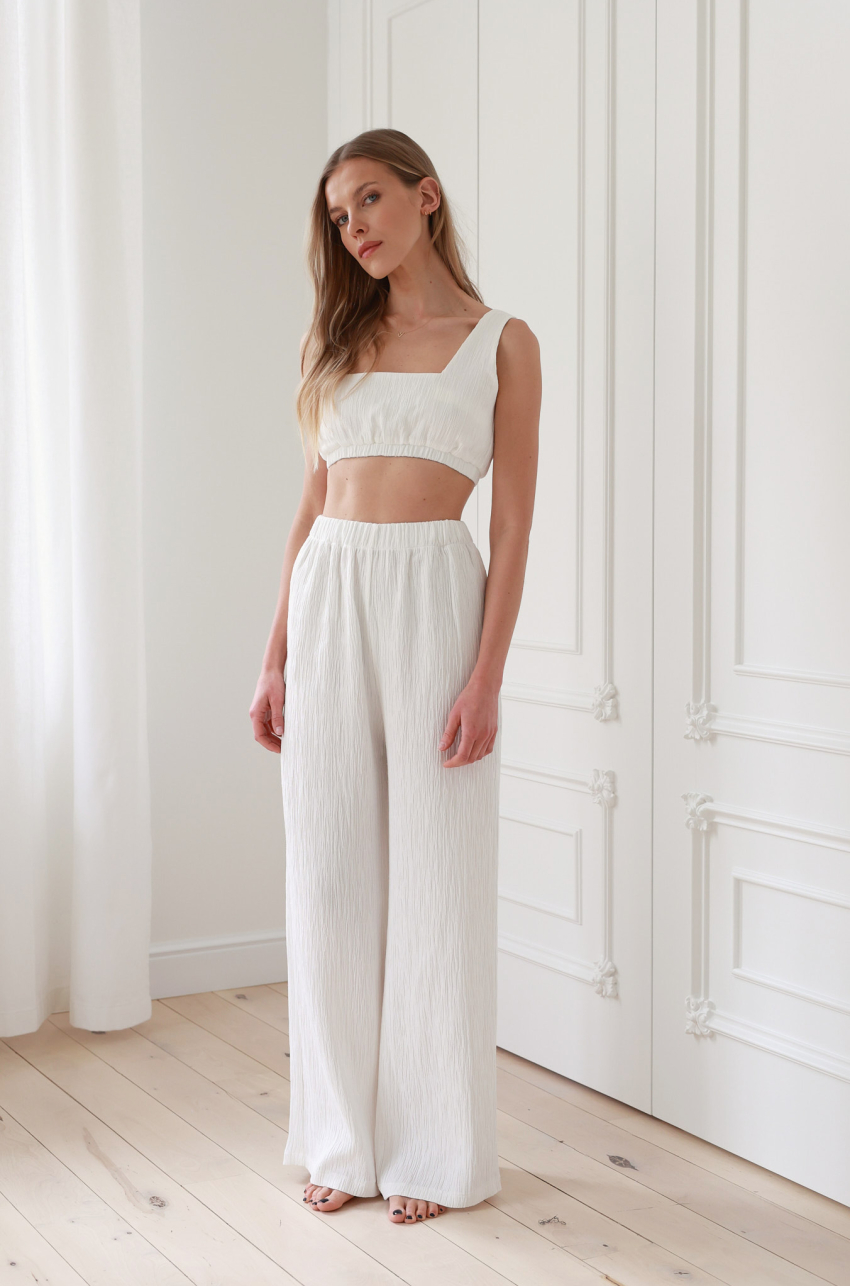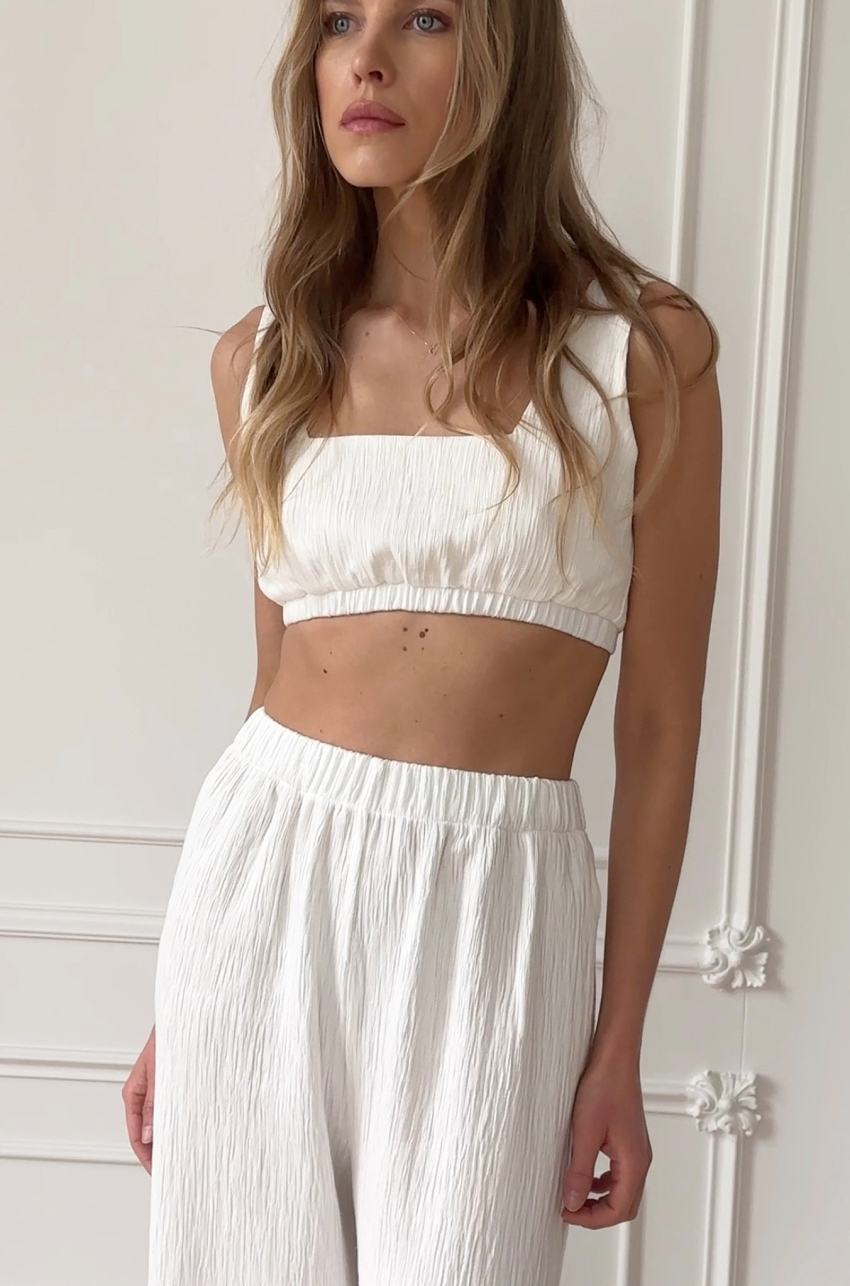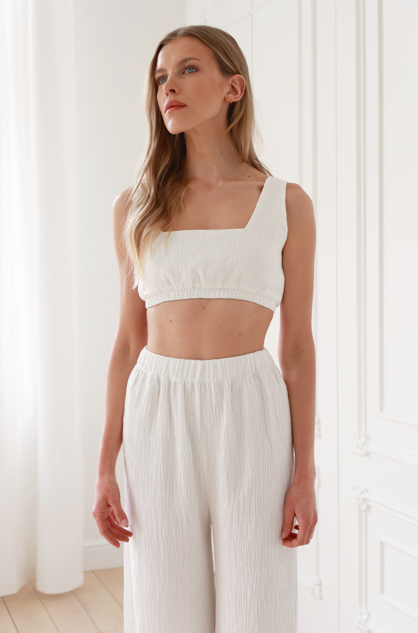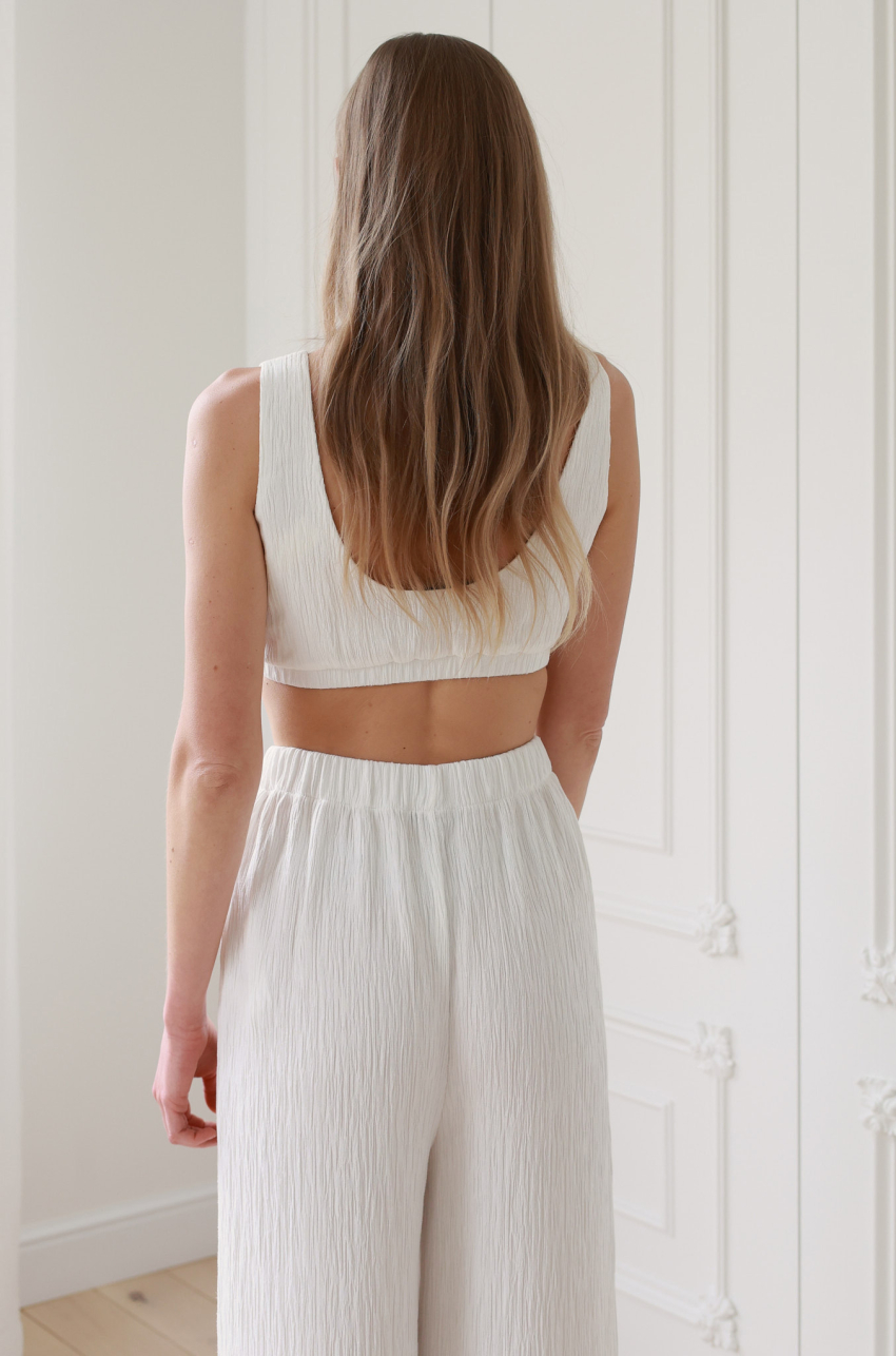 Podkreślający figurę, krótki top, wykonany z miękkiej, plisowanej mieszanki wiskozy z certyfikatem Oeko-Tex. Model ten posiada dekolt typu karo zarówno z przodu, jak i z tyłu oraz szerokie ramiączka. Połącz go ze spodniami Viseu i stwórz ponadczasowy set na lato.
