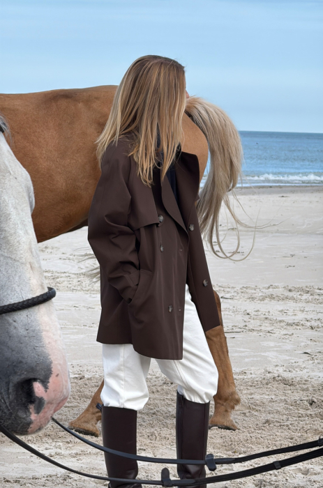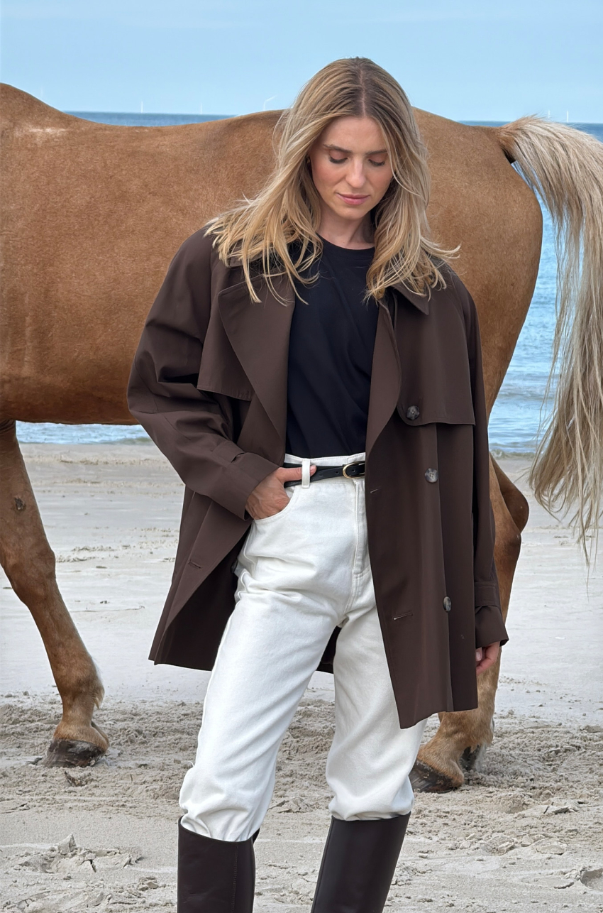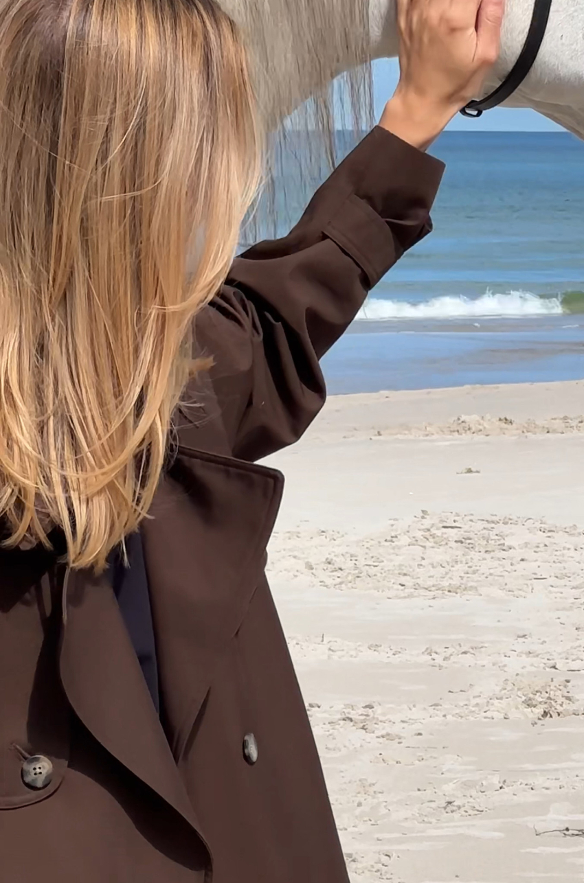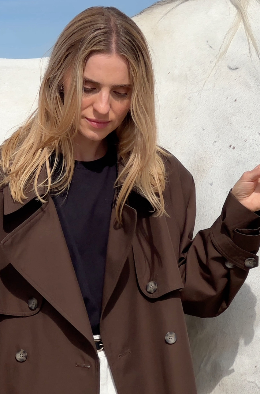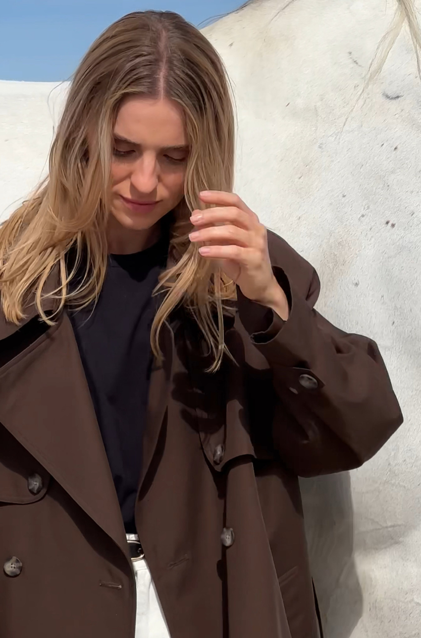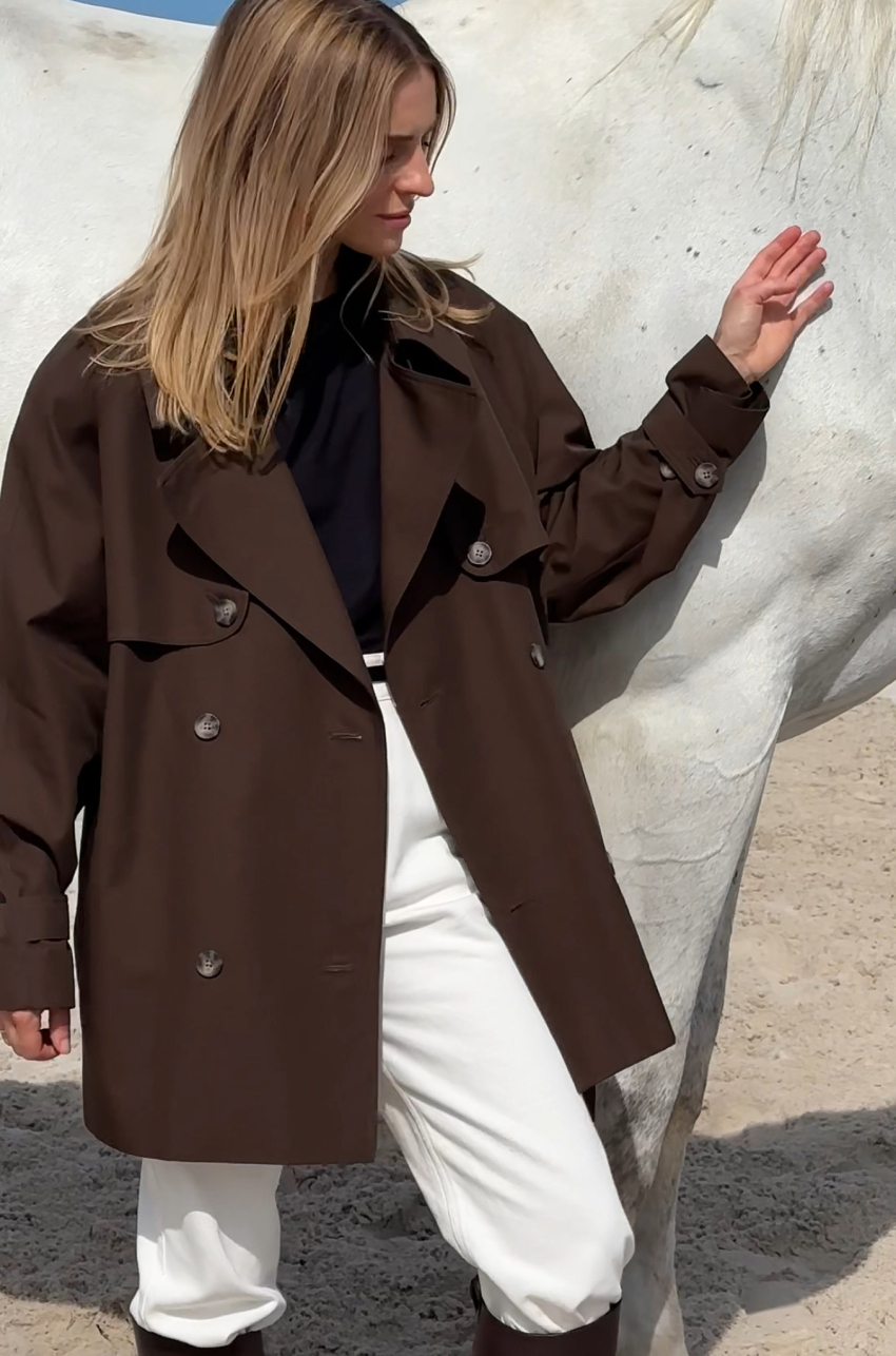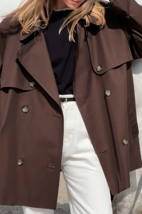 Trencz z bawełny w odcieniu ciemnego czekoladowego brązu. Tkanina, z której został uszyty, jest pokryta warstwą hydrofobową co sprawia, że ma właściwości wodoodporne. Długość do połowy uda. Posiada pasek i dwurzędowe guziki.