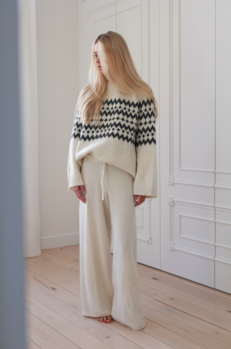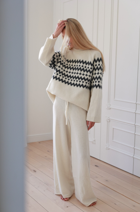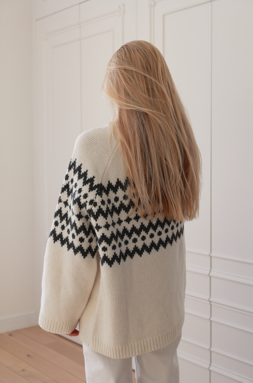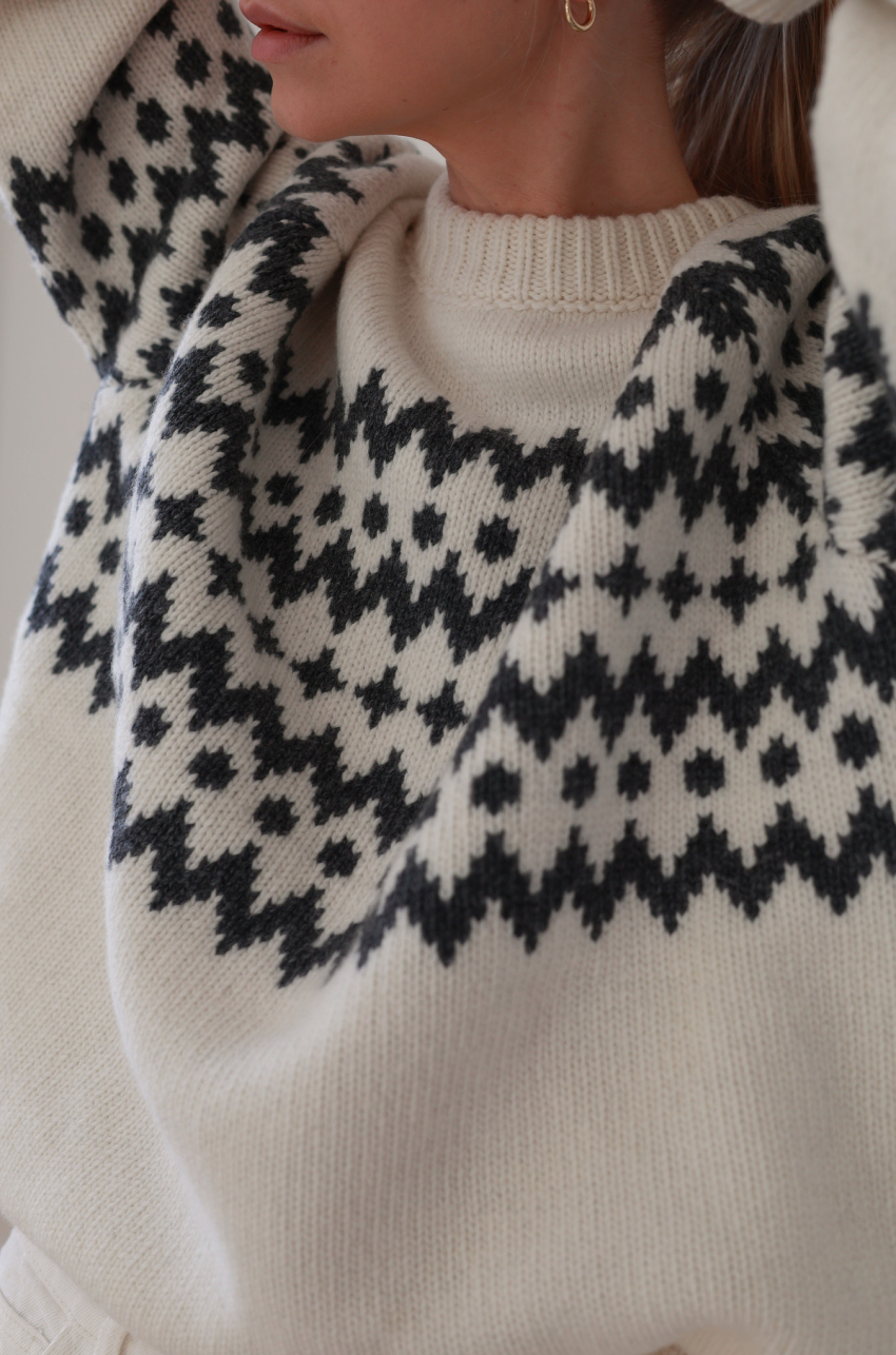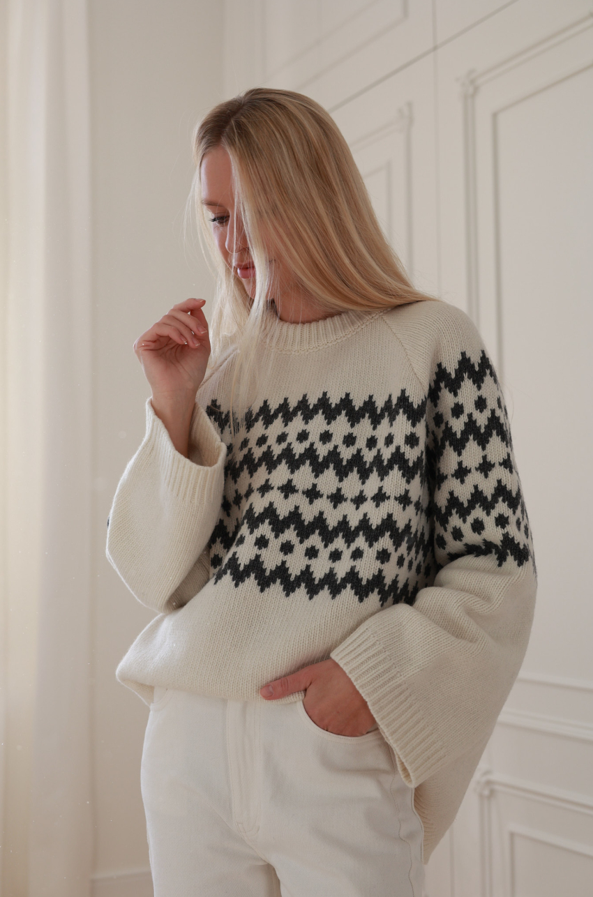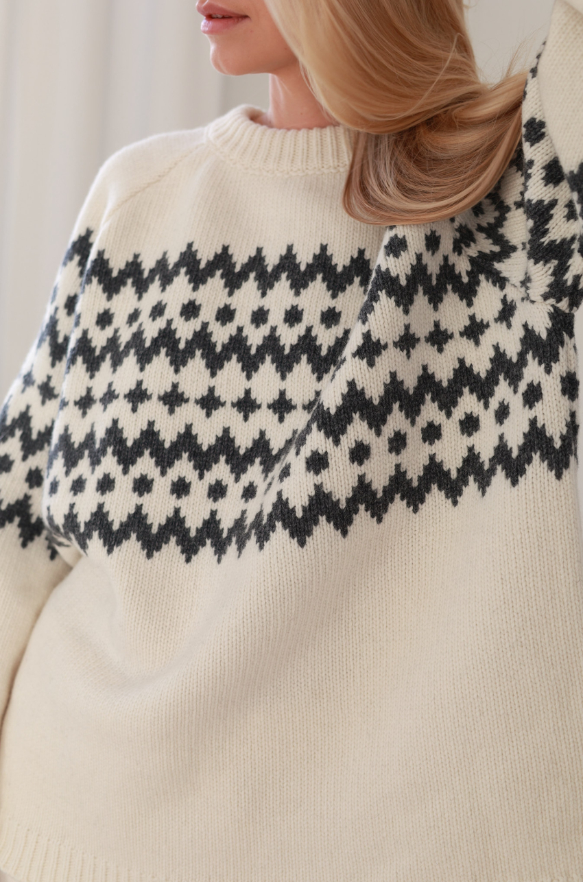 Sweter w kolorze ecru o pudełkowym kroju z kontrastowym, żakardowym wzorem. Posiada prążkowane wykończenia, raglanowe rękawy i komfortową długość za biodra. Ciepła i miękka przędza z przewagą szlachetnej wełny, zapewnia odpowiednią termoregulację nawet w najbardziej mroźne dni.